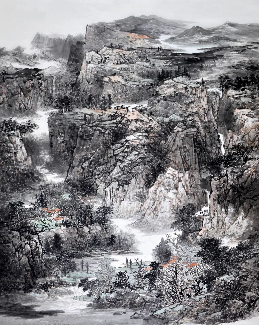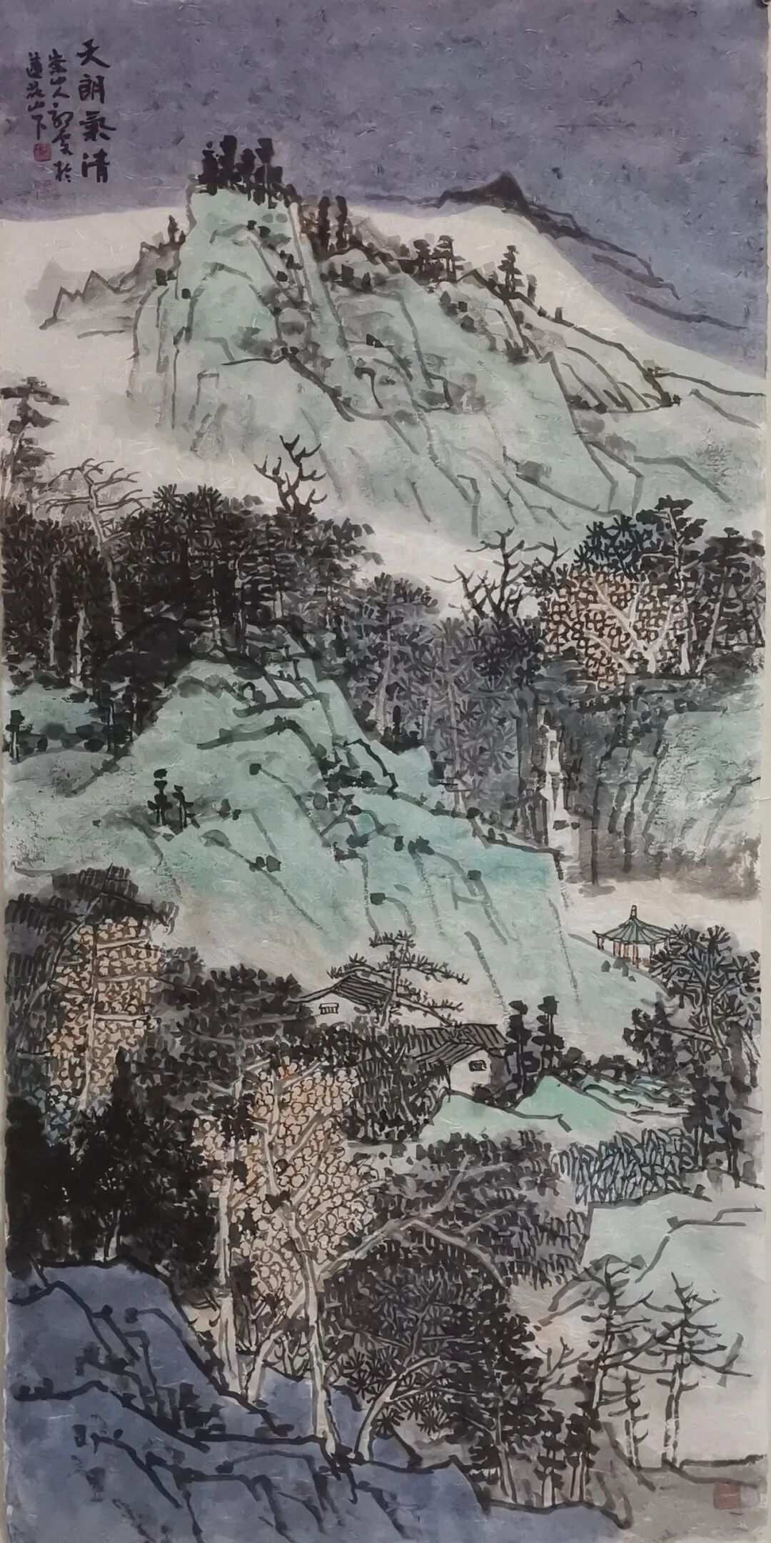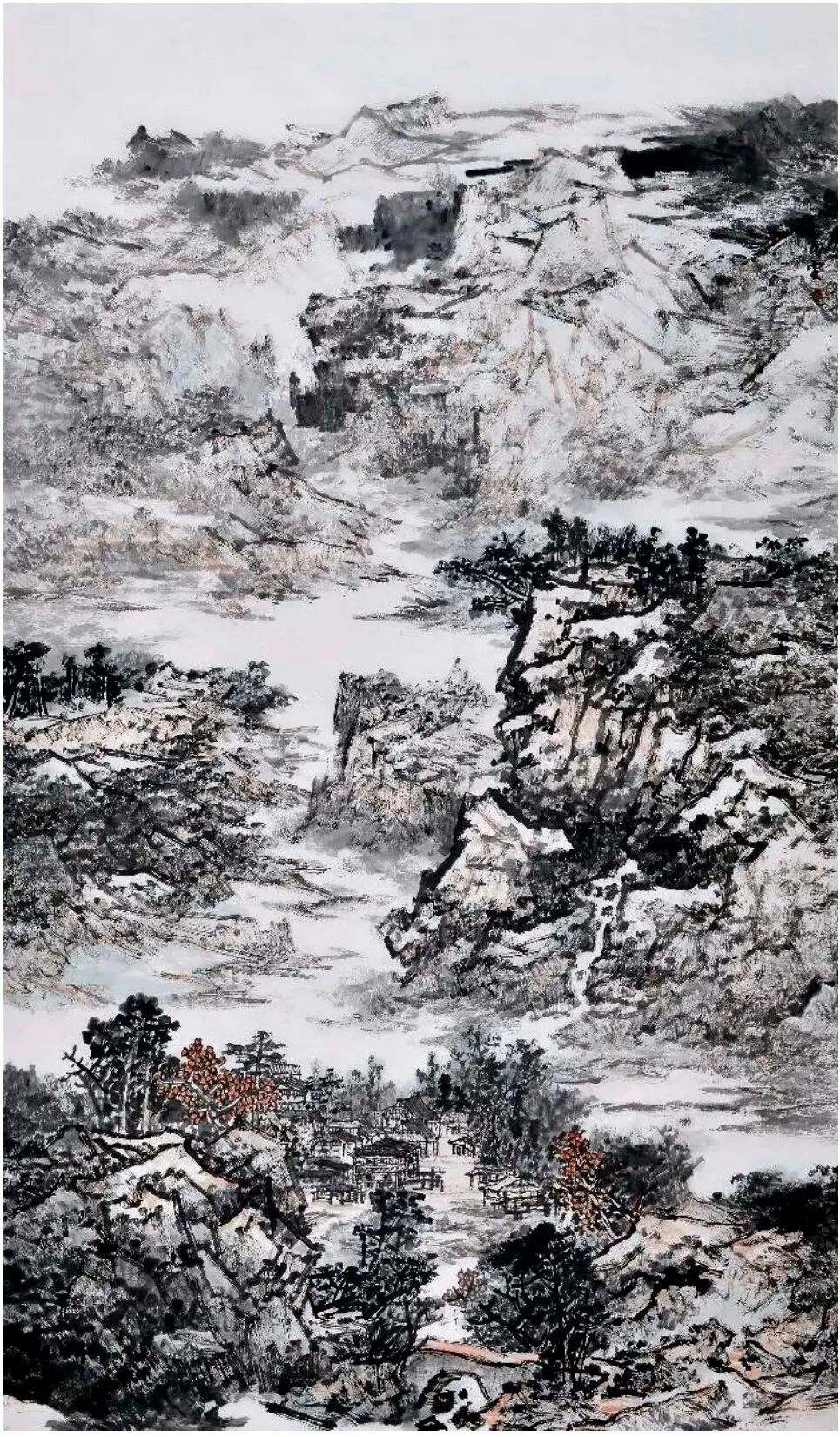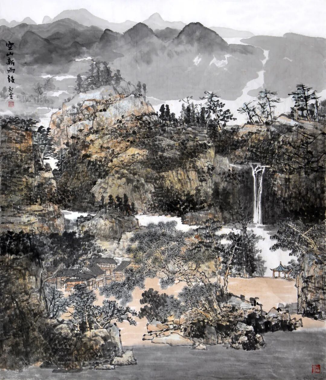 郭雯的作品可以用“恬静灵动总相宜”来形容她的艺术风采。恬静,从她的画中能看到追求的玉宇无尘的境界。画面干净雅致,线条稳重,不急不躁,表达了她内心所向往的美好世界。借助笔墨,把自己的感悟流露纸上,使画作有淡然释怀、徐风拂面之感。灵动,是她山水画呈现出来的万木葱茏,潺潺溪流,瀑布直下,云飞雾腾,表现了山水的蓬勃生机,昂扬的生命力。近则高山耸立,远则峰峦叠嶂,烟雾缭绕,荡气回肠,趣味跃然生动。