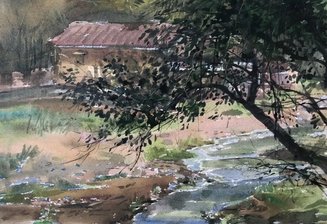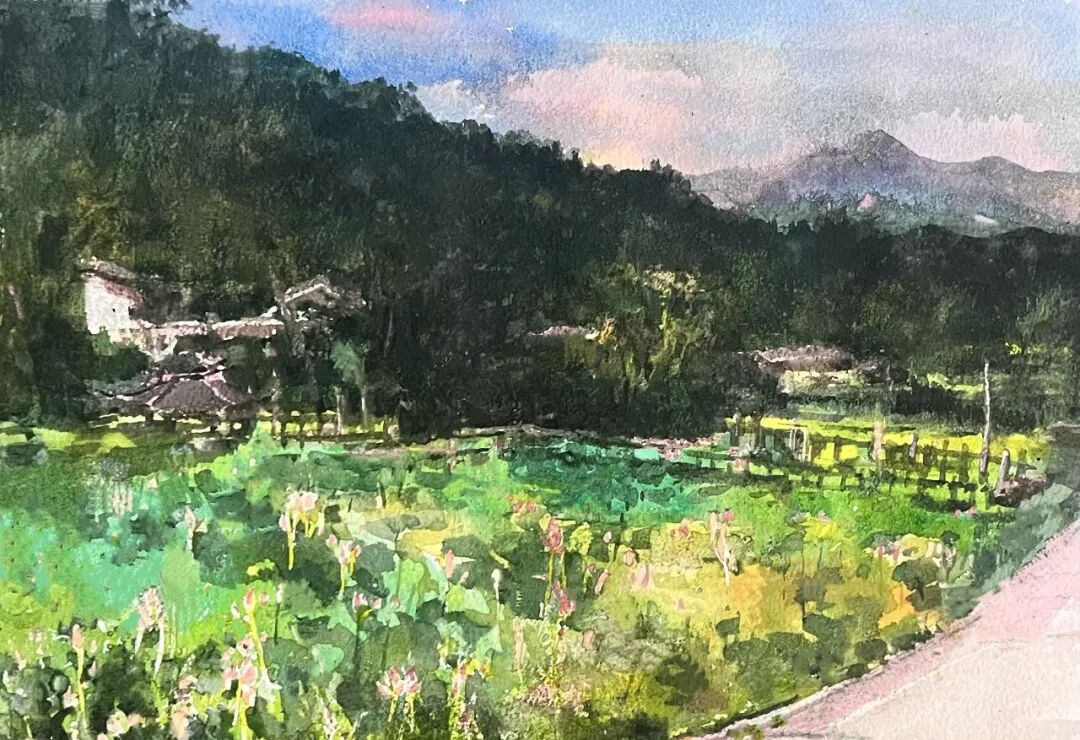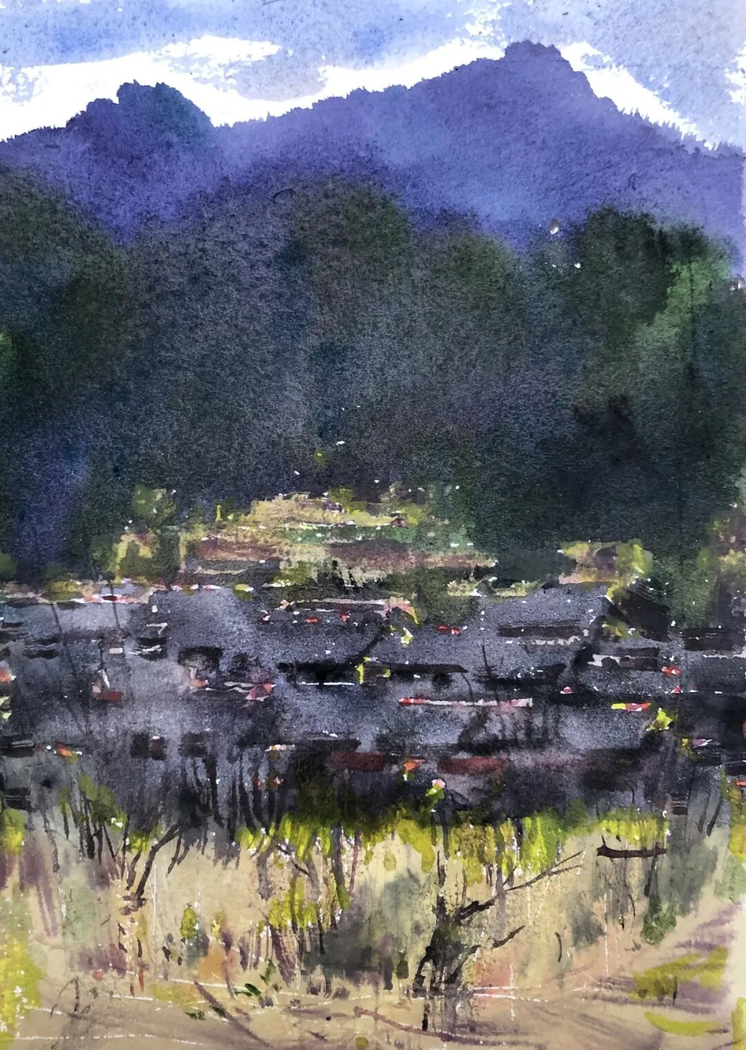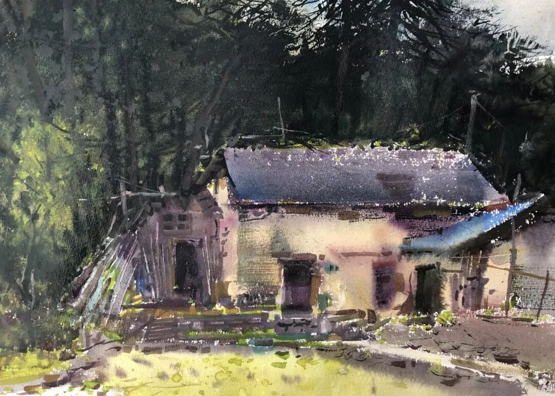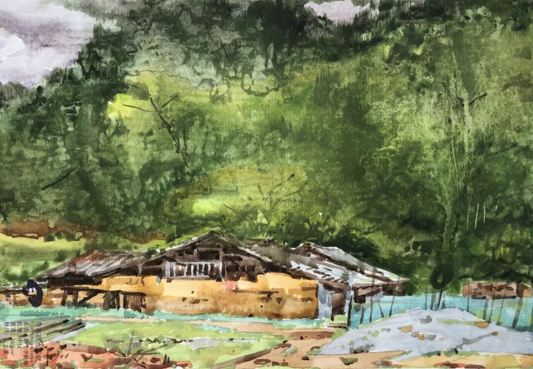 近几年喜欢跑到野外去画画。山边、田野、河畔、古村落……寻下一处景,我就会呆一整天。摆开画摊,去画自己的期待,去画自己的寄托,去画自己的心愿。画那些自己都不知道能不能画出来的精神世界。并且把这精神融入到树木、山峦、天空之中,让他们成为我生命的组成部分——也许这就叫写生。