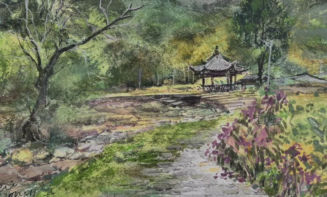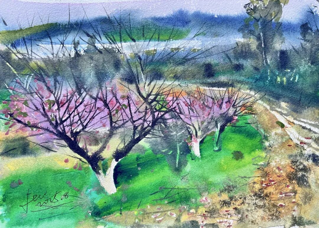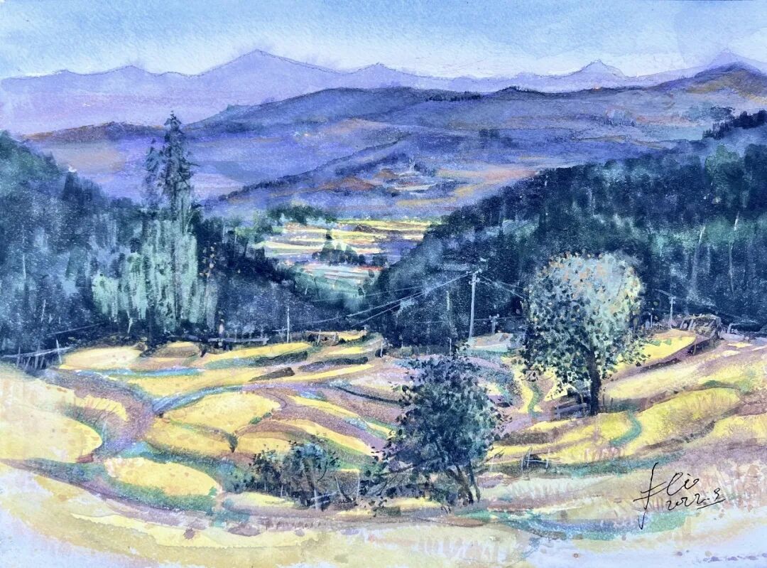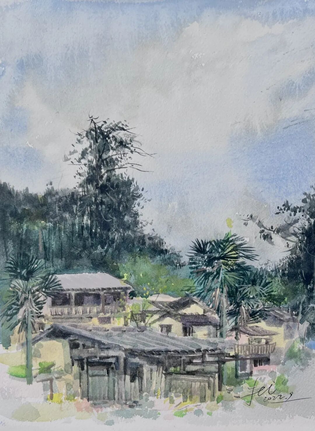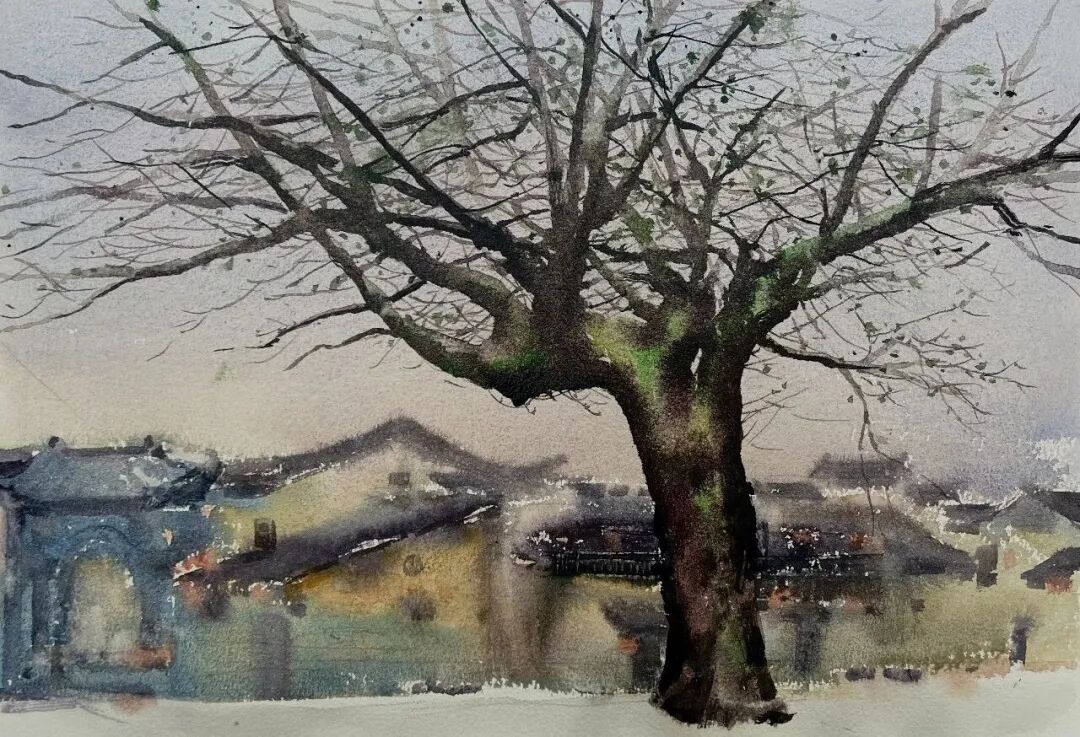 近几年喜欢跑到野外去画画。山边、田野、河畔、古村落……寻下一处景,我就会呆一整天。摆开画摊,去画自己的期待,去画自己的寄托,去画自己的心愿。画那些自己都不知道能不能画出来的精神世界。并且把这精神融入到树木、山峦、天空之中,让他们成为我生命的组成部分——也许这就叫写生。