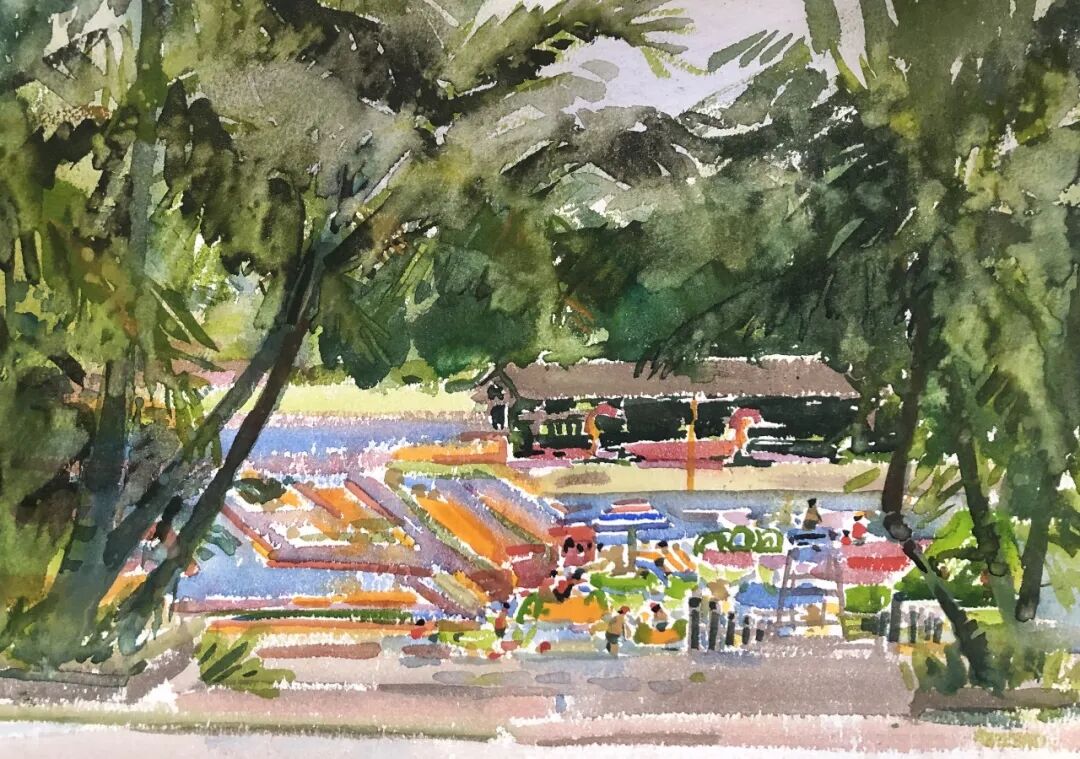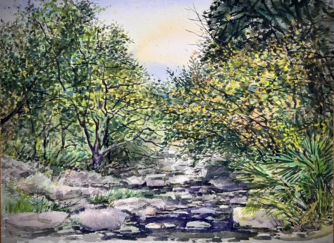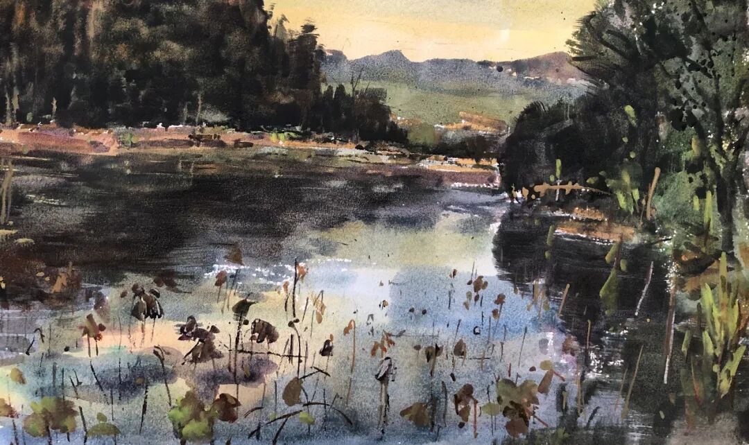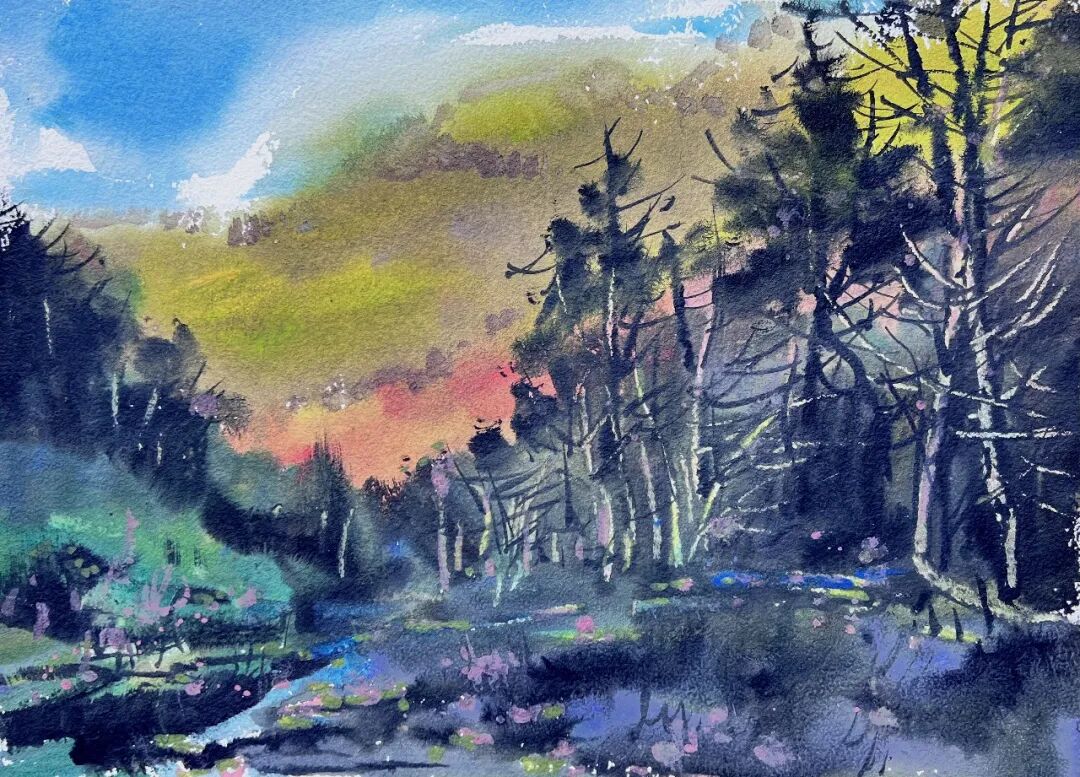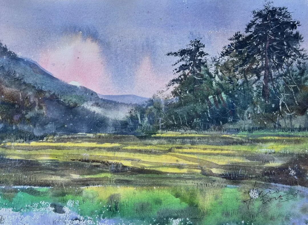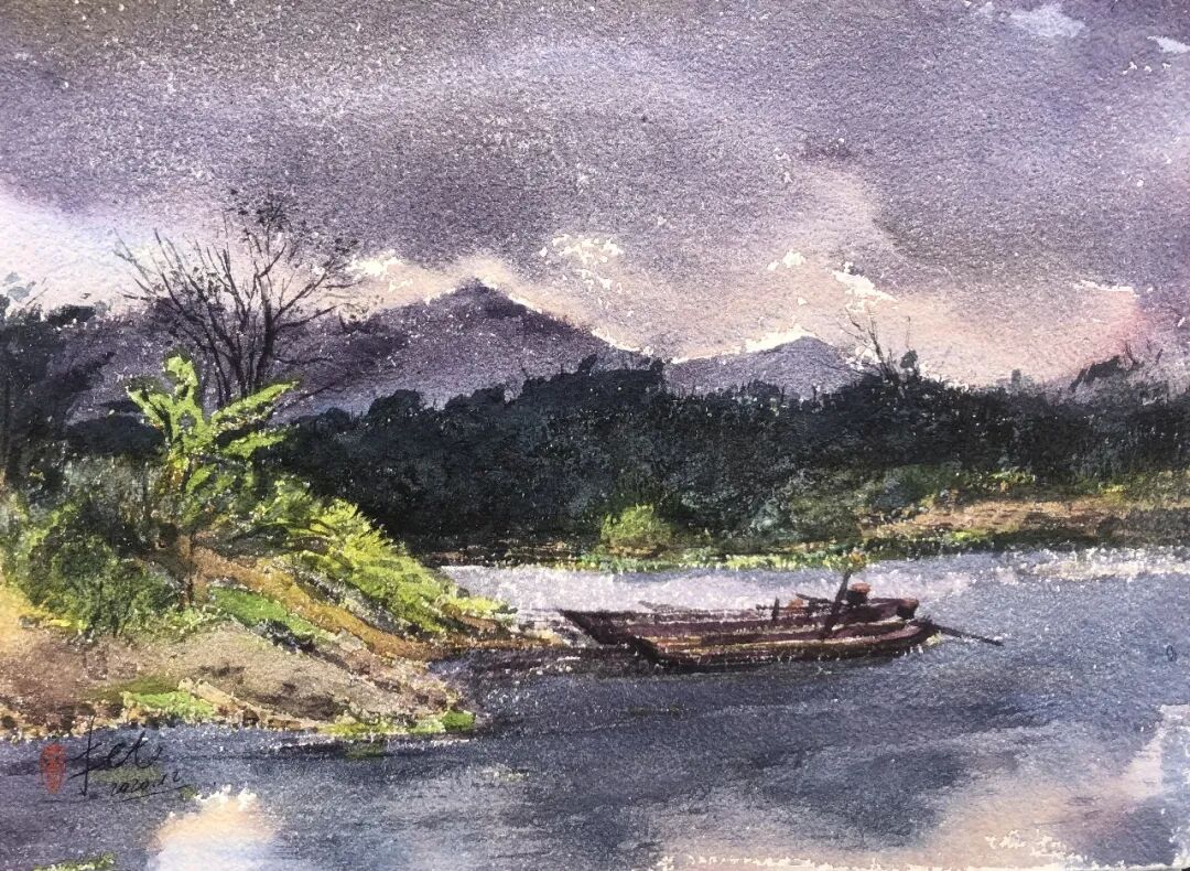 近几年喜欢跑到野外去画画。山边、田野、河畔、古村落……寻下一处景,我就会呆一整天。摆开画摊,去画自己的期待,去画自己的寄托,去画自己的心愿。画那些自己都不知道能不能画出来的精神世界。并且把这精神融入到树木、山峦、天空之中,让他们成为我生命的组成部分——也许这就叫写生。