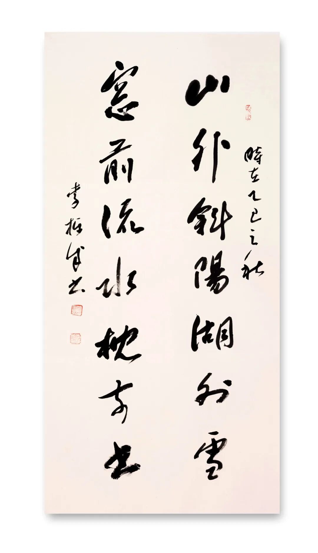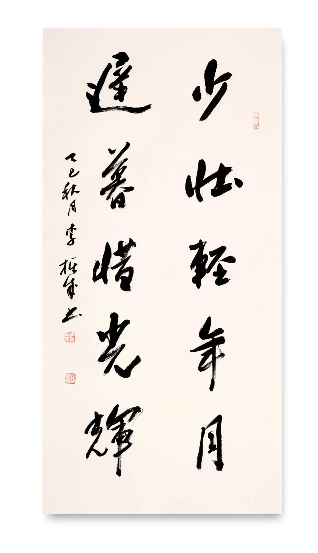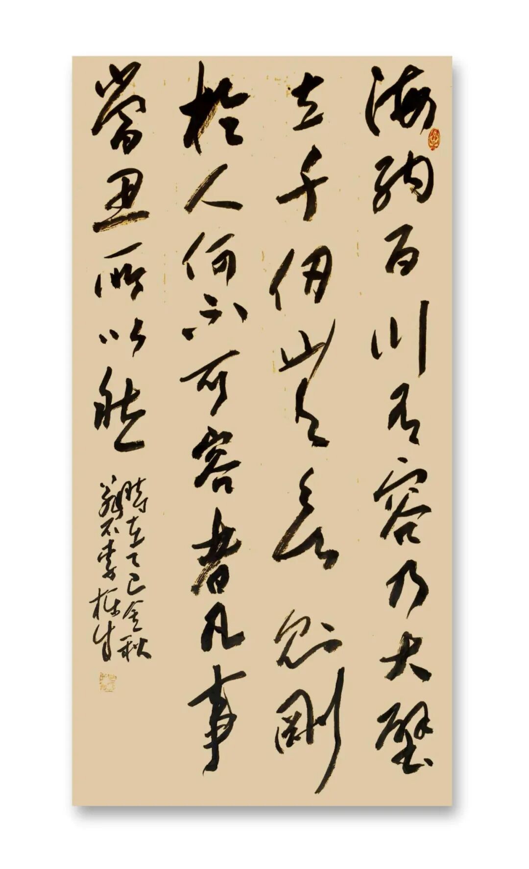 站在文化自信的时代语境中回望,李栋成的书法艺术恰似渭河奔流,既有周鼎商彝的深沉厚重,又具现代江河的澎湃生机。其艺术探索印证了康有为“盖书,形学也”的形式追求,更超越了单纯技法层面,实现对孙过庭“情动形言,取会风骚之意”的审美境界。