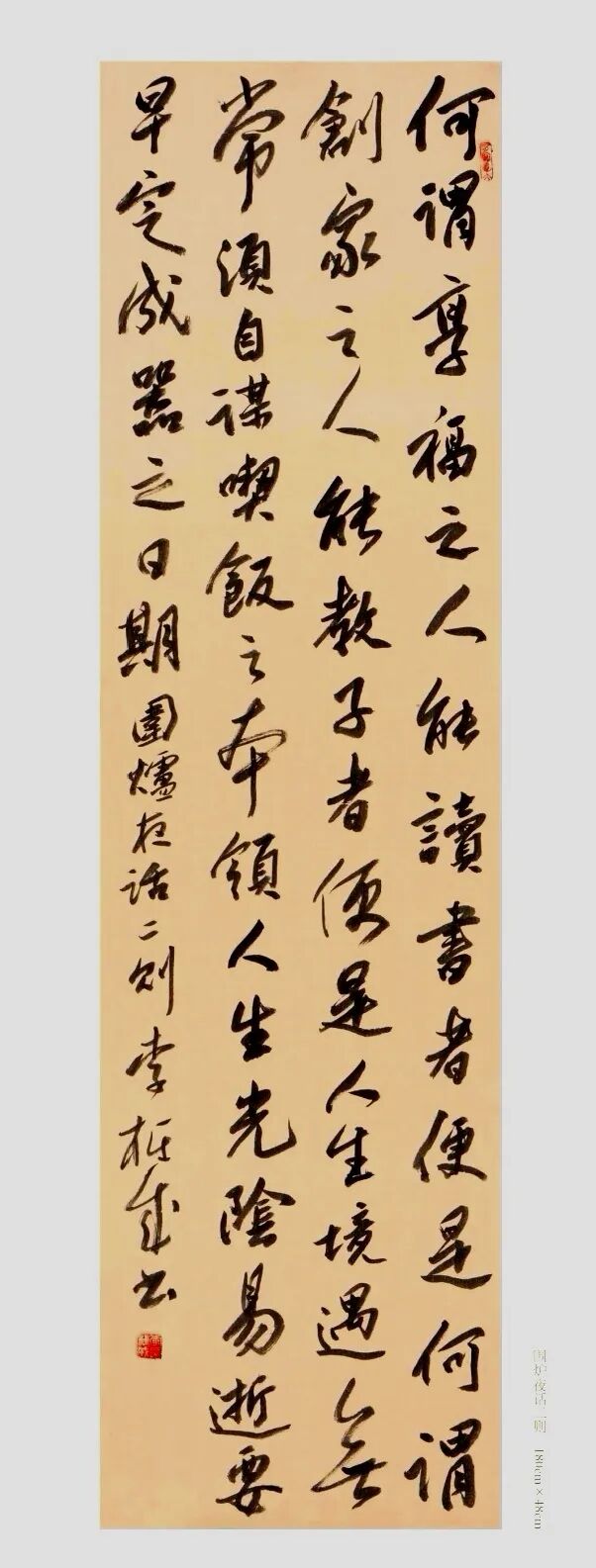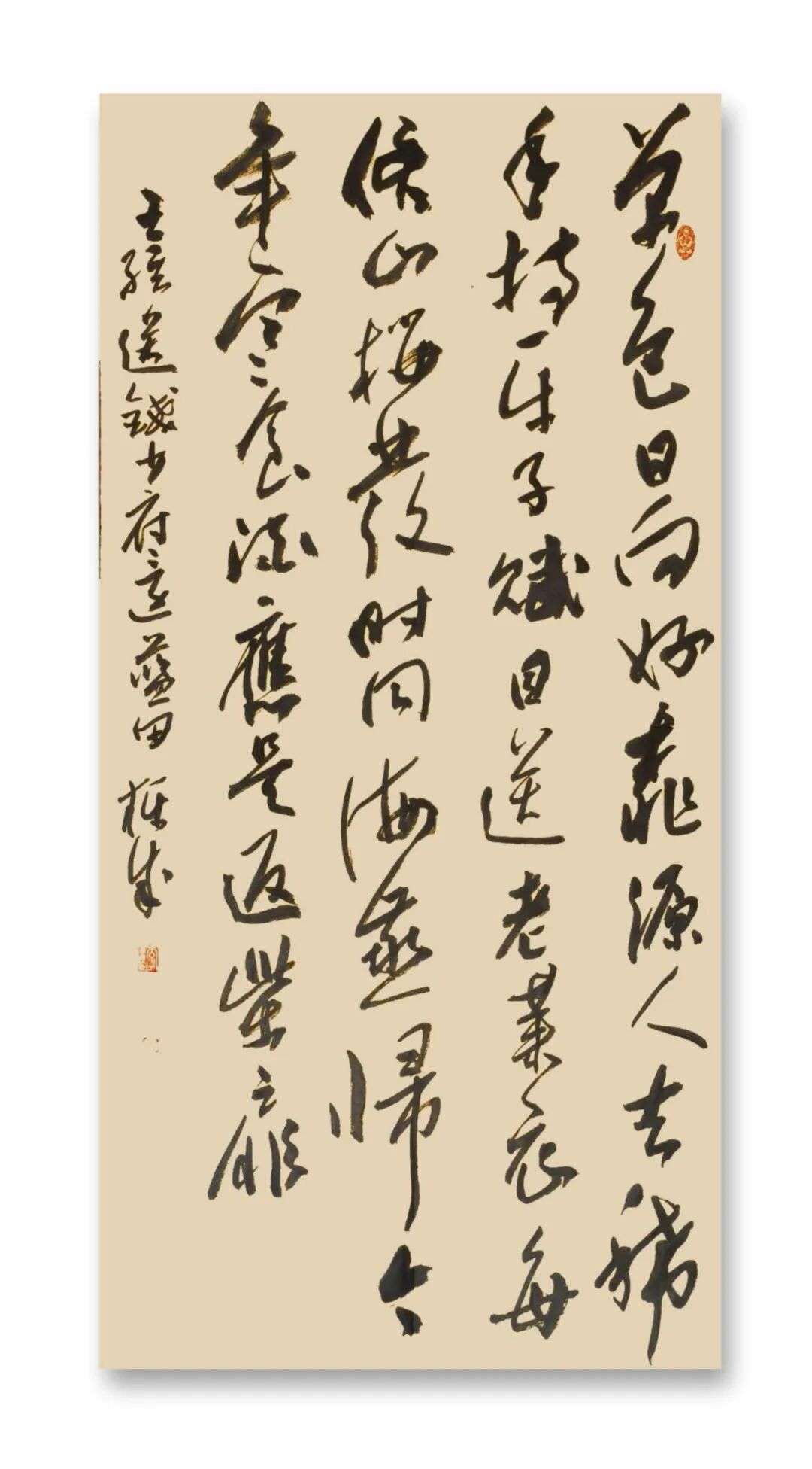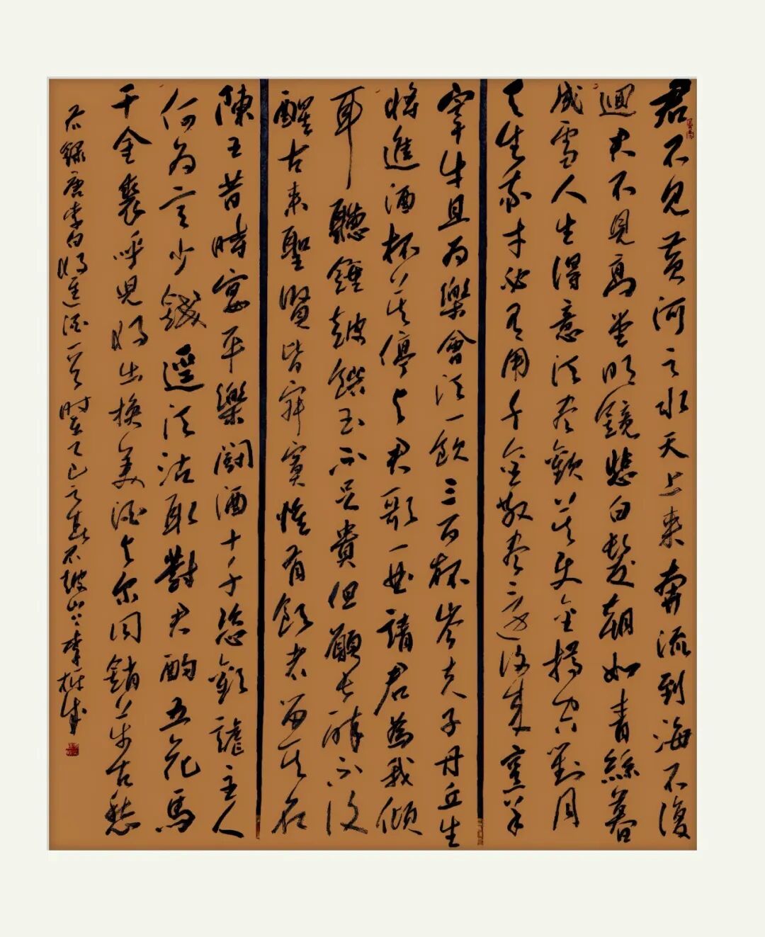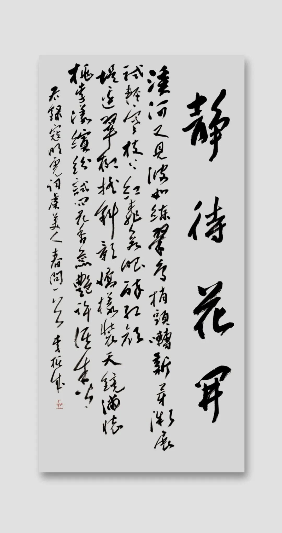 站在文化自信的时代语境中回望,李栋成的书法艺术恰似渭河奔流,既有周鼎商彝的深沉厚重,又具现代江河的澎湃生机。其艺术探索印证了康有为“盖书,形学也”的形式追求,更超越了单纯技法层面,实现对孙过庭“情动形言,取会风骚之意”的审美境界。