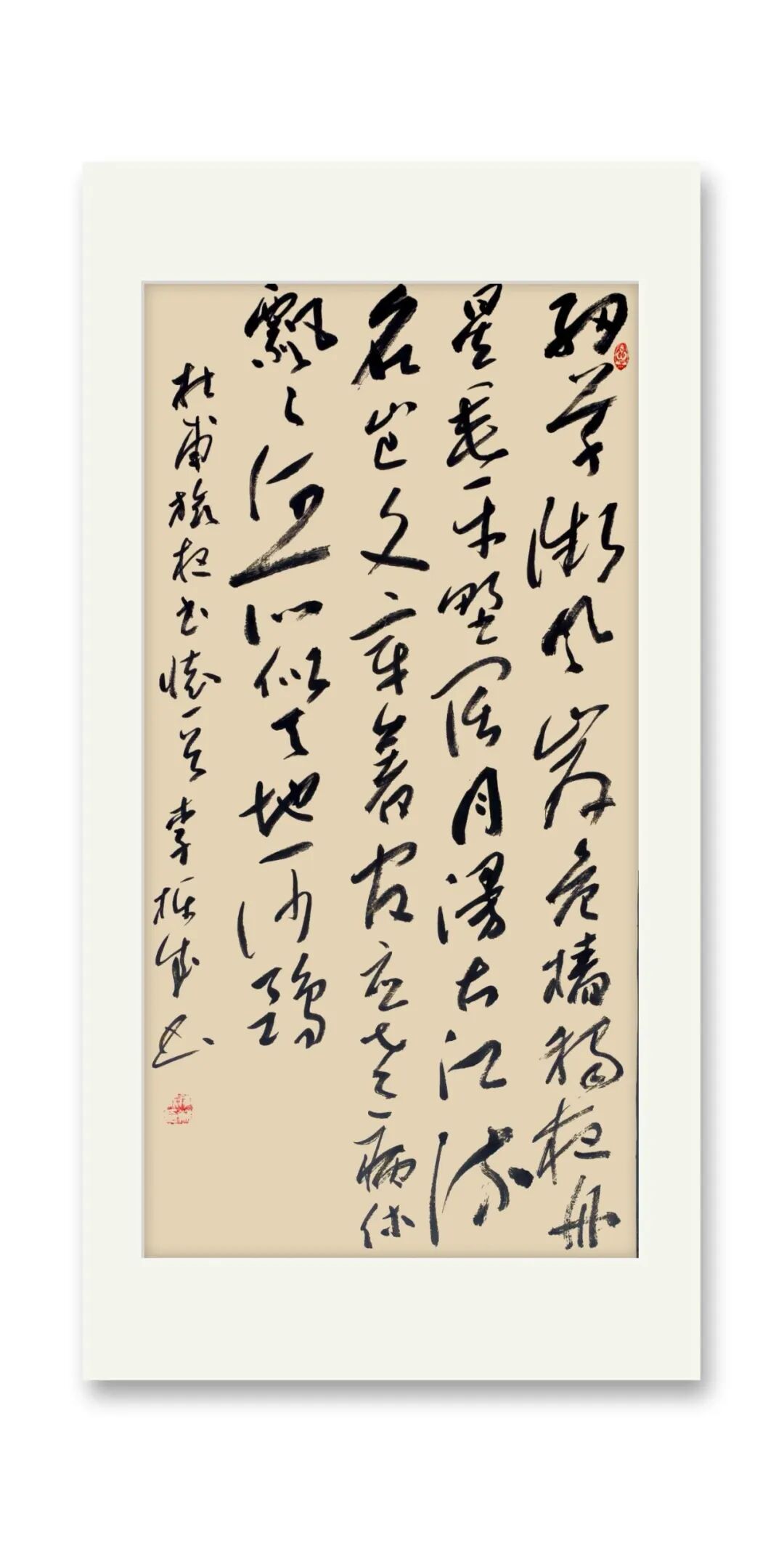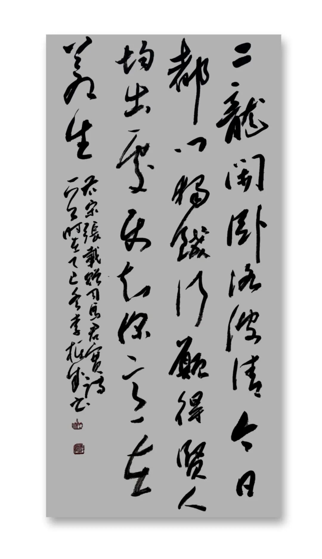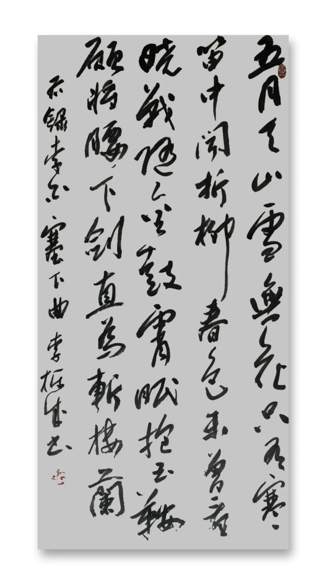 李栋成书法的根基深植于魏晋风骨,尤以二王帖学正脉为宗。其行草取法《十七帖》《书谱》,于飘逸中见法度,既得孙过庭“草以点画为情性,使转为形质”的精髓,又融王铎“连绵草”之跌宕,形成“流美而不失骨力”的独特韵致。在碑帖融合的探索中,他巧妙调和于右任标准草书的简净与魏碑的方峻,笔下既有褚遂良《雁塔圣教序》的秀润,又暗藏《张猛龙碑》的峭拔,于外方内圆的笔意间彰显项穆“会古通今,不激不厉”的审美理想。这种取法路径不仅延续了帖学的文脉传承,更以金石气息注入时代精神,使传统笔墨焕发新生。