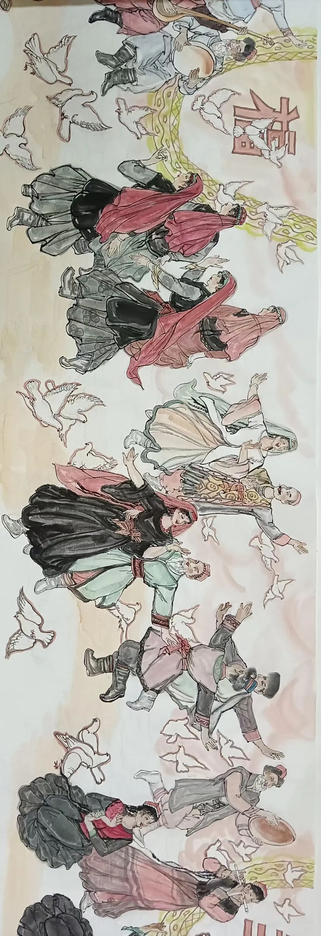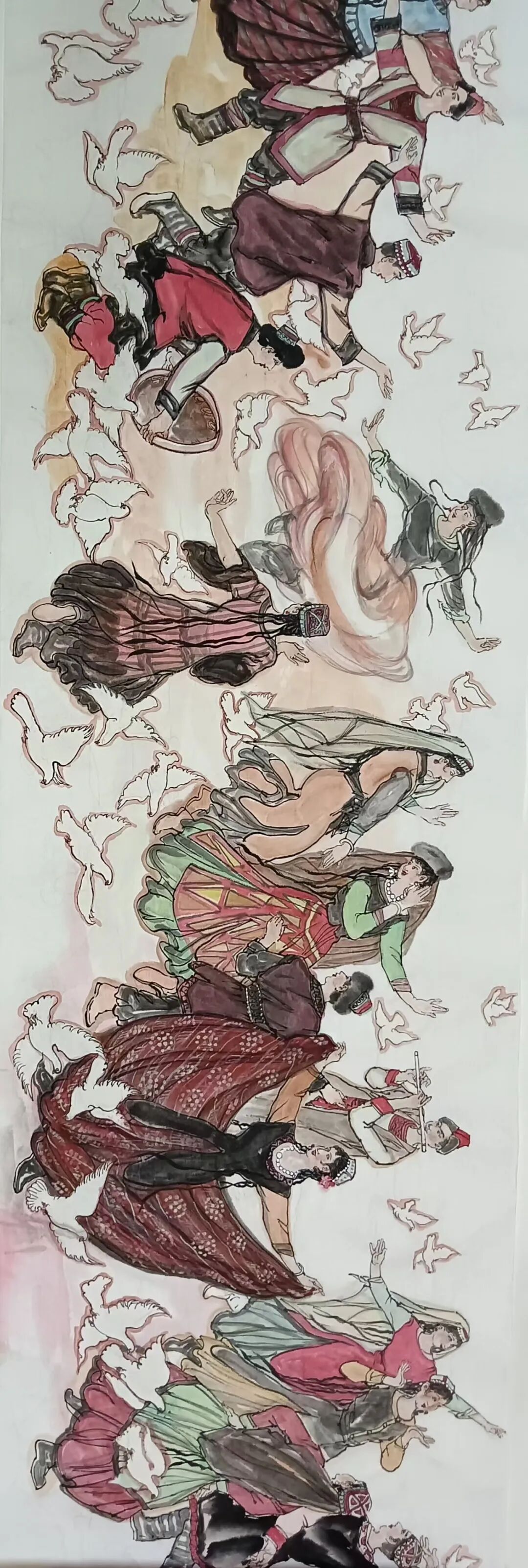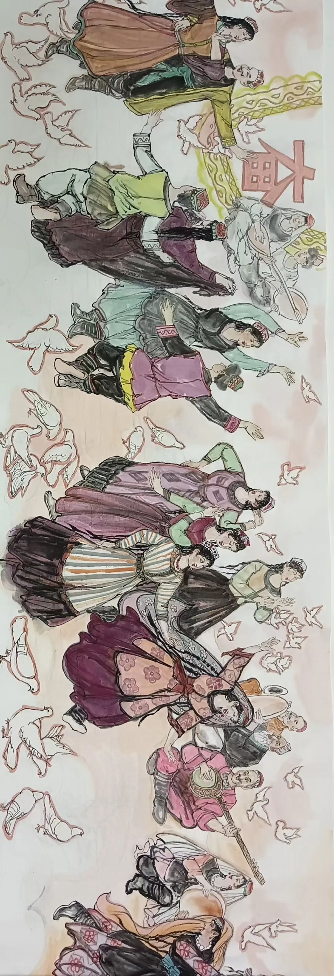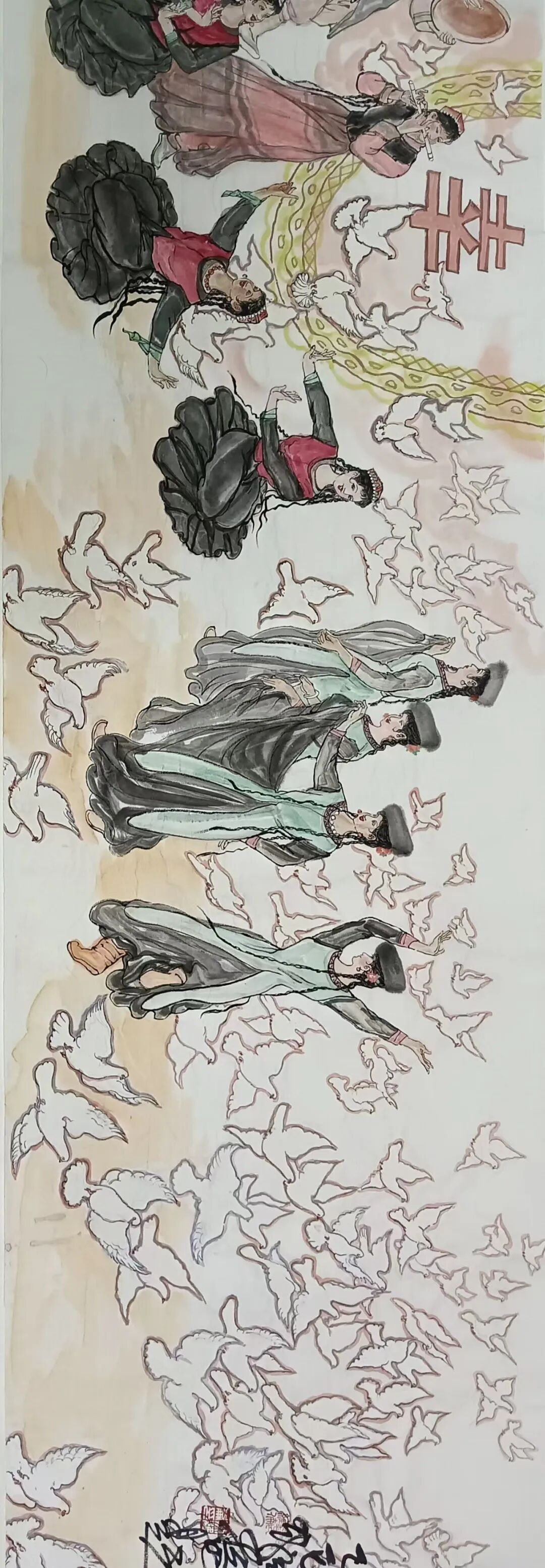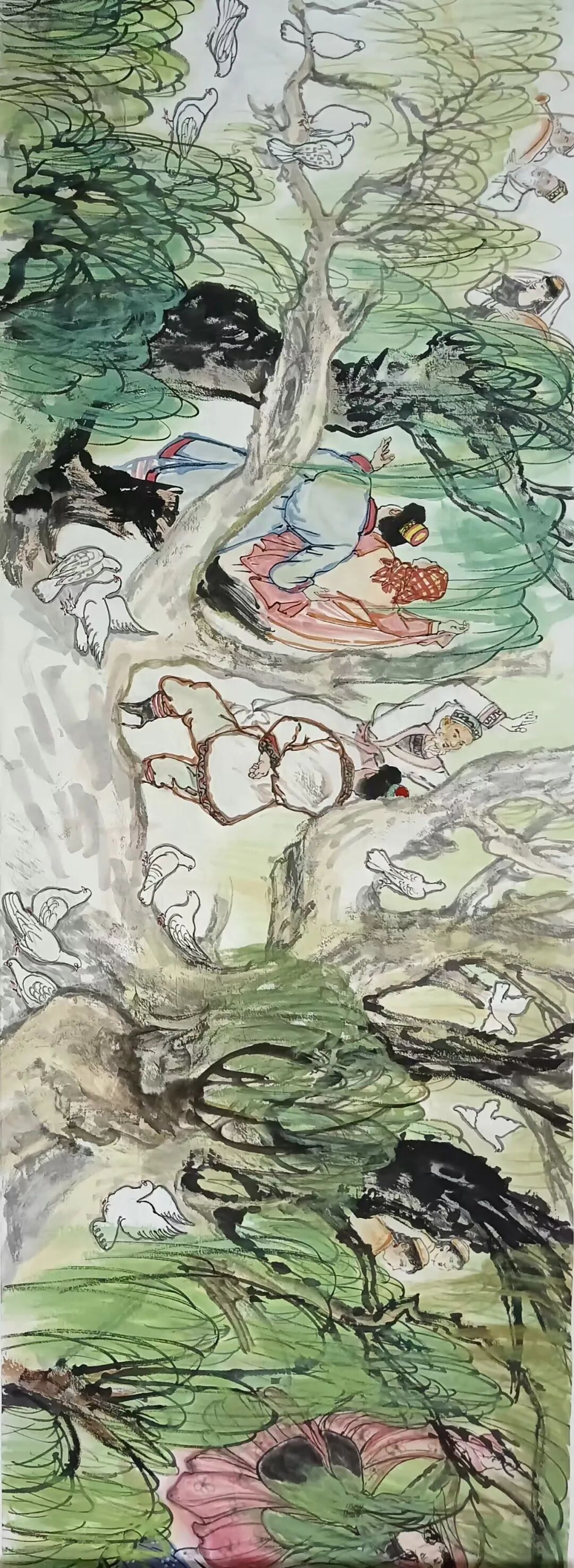八十髙龄刘维仑,必攻不守永创新。维仑高产十三卷,当代清明上河图。又创三卷六十米,美人共计八百多。三卷创举世界梦,华夏醉美新荣光,人物毛驴祥和美,舞姿浩放颂吉祥。三卷盛世普新篇,卷卷心中有三梦,一梦艺术为人民,二梦民族为复兴,三梦世界为和平。中华盛世舞东风,数千飞鸽颂和平。幸福来源皆奋斗,和协醉美世界梦,飞鸽远征颂和平。三幅巨卷今问世,世人和平共心愿,献给世人共和平。