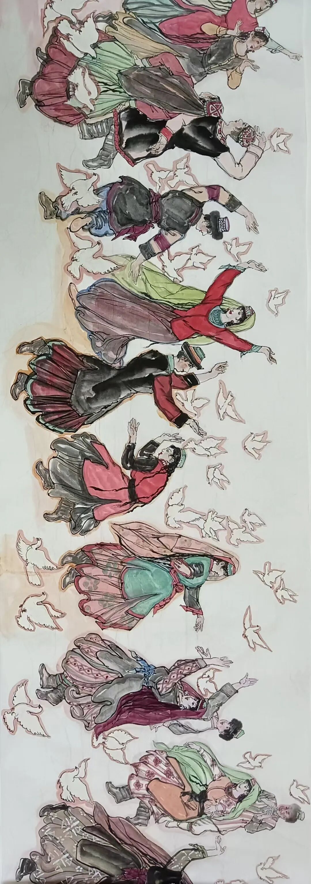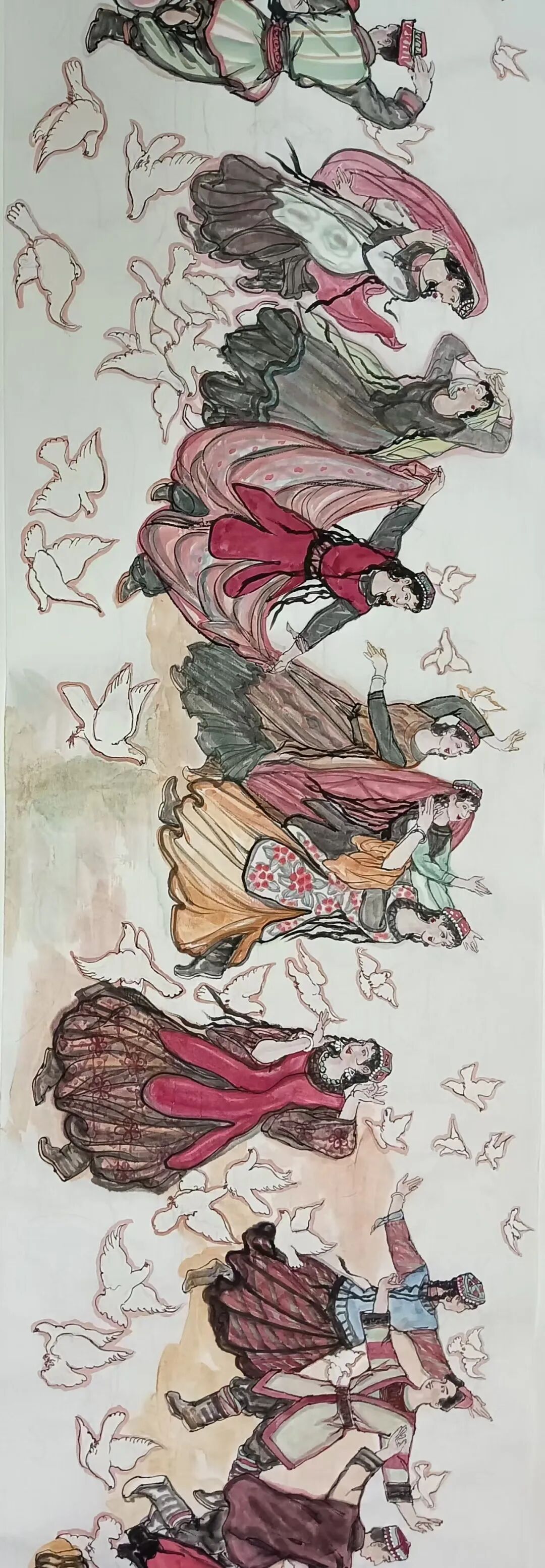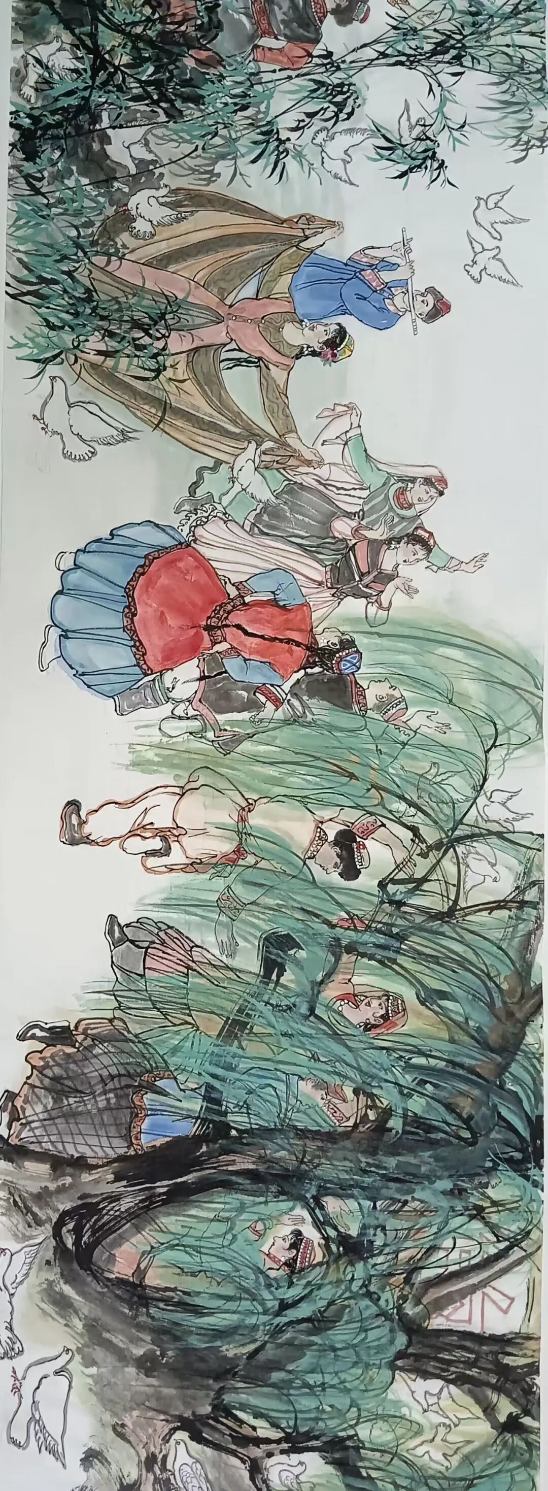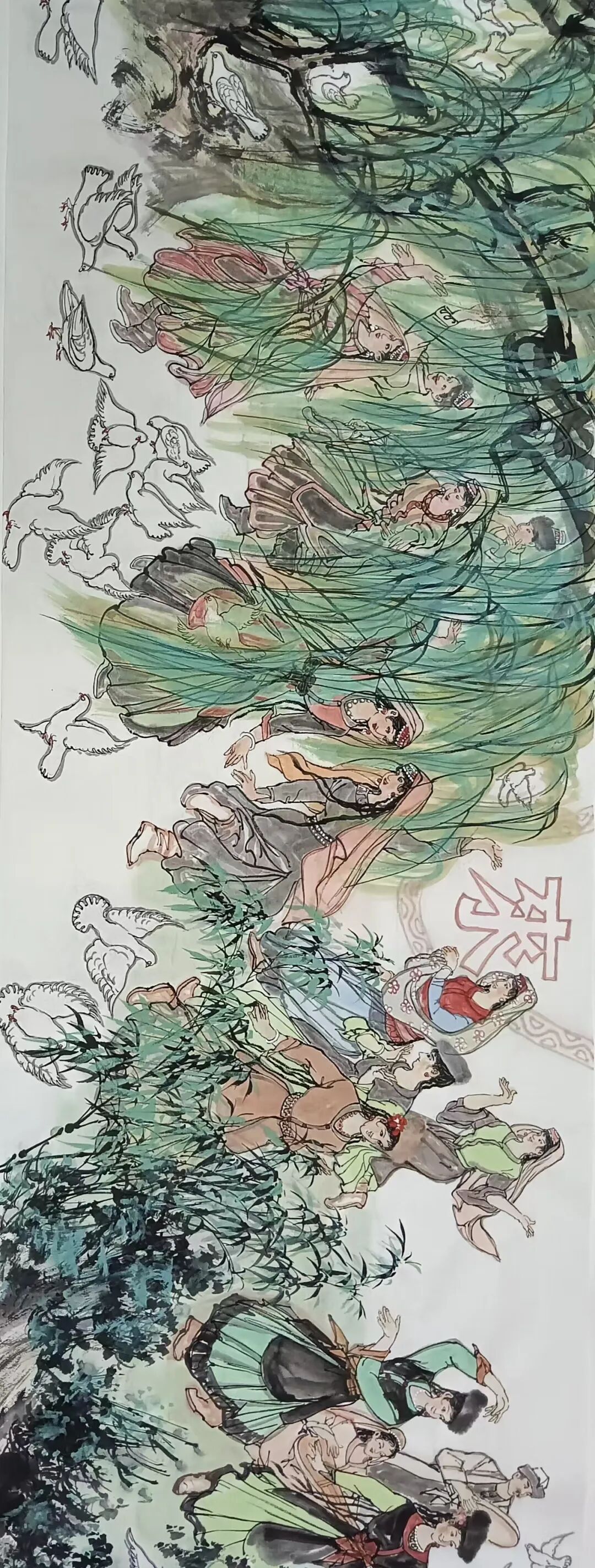 八十髙龄刘维仑,必攻不守永创新。维仑高产十三卷,当代清明上河图。又创三卷六十米,美人共计八百多。三卷创举世界梦,华夏醉美新荣光,人物毛驴祥和美,舞姿浩放颂吉祥。三卷盛世普新篇,卷卷心中有三梦,一梦艺术为人民,二梦民族为复兴,三梦世界为和平。中华盛世舞东风,数千飞鸽颂和平。幸福来源皆奋斗,和协醉美世界梦,飞鸽远征颂和平。三幅巨卷今问世,世人和平共心愿,献给世人共和平。