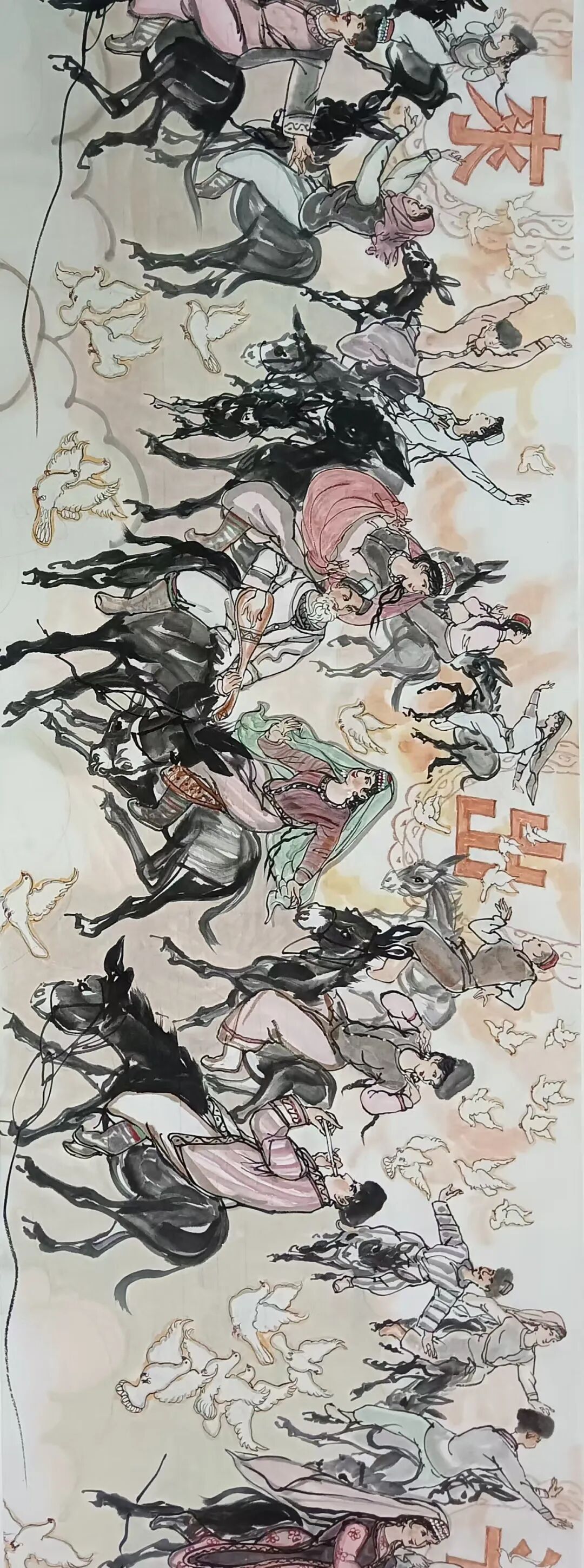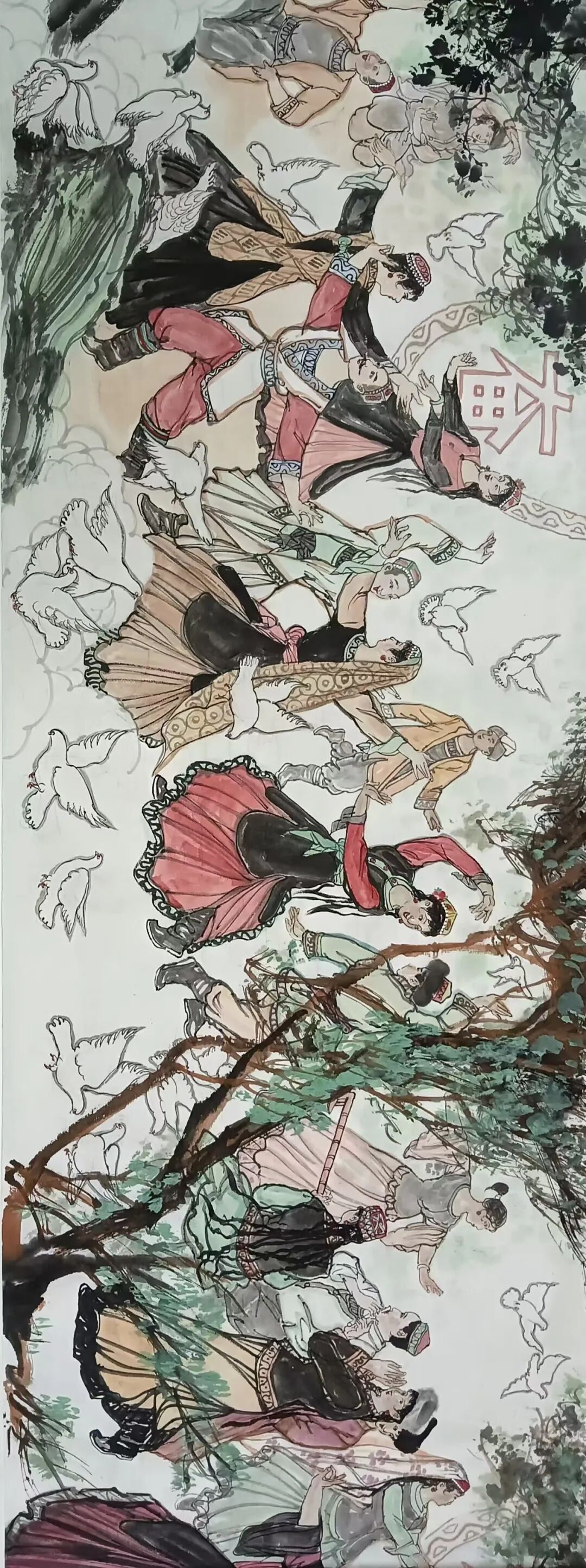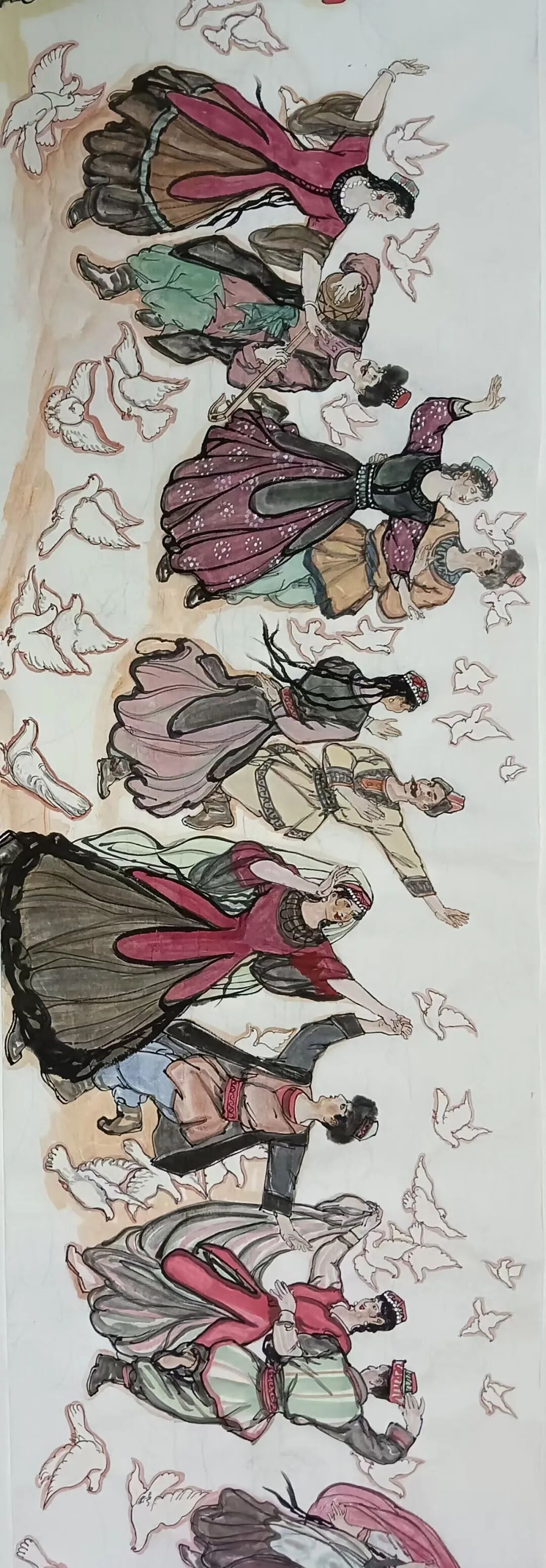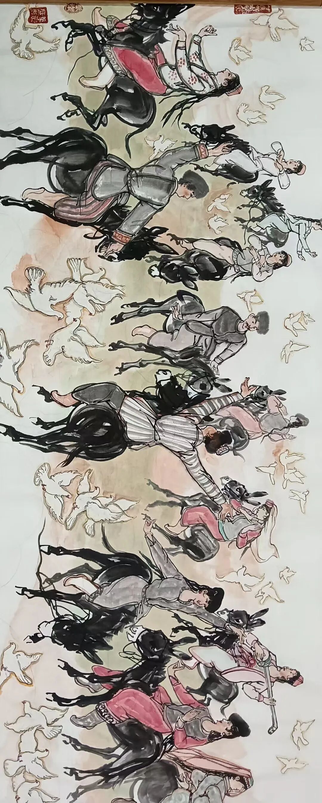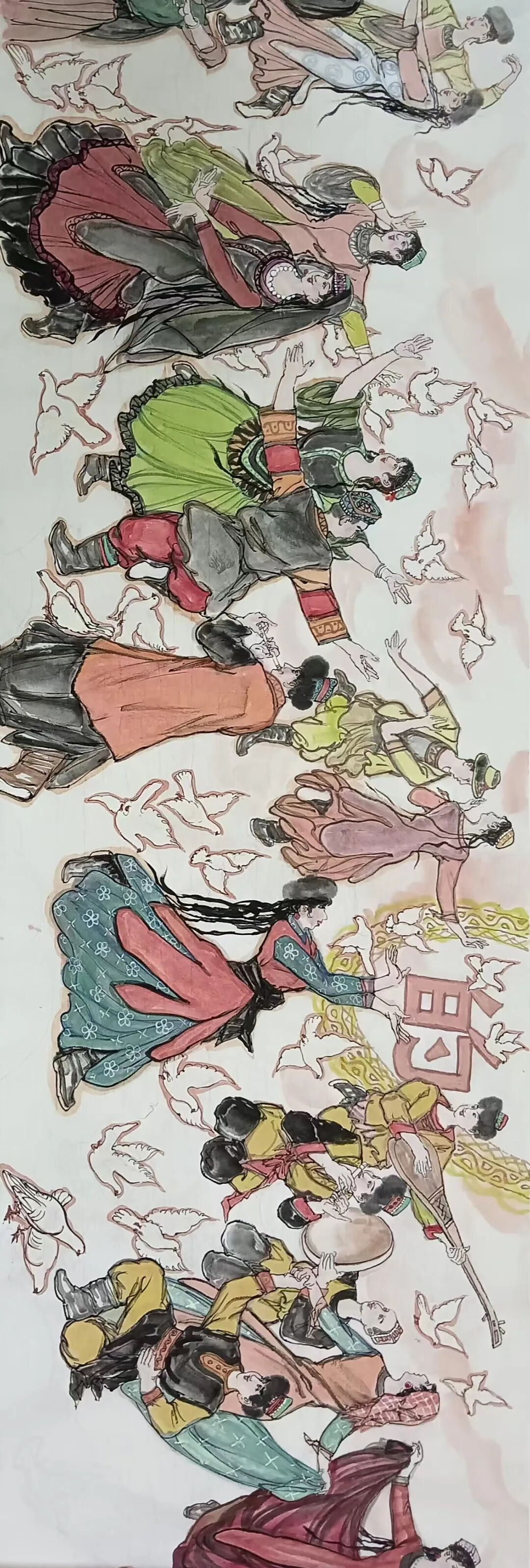 八十髙龄刘维仑,必攻不守永创新。维仑高产十三卷,当代清明上河图。又创三卷六十米,美人共计八百多。三卷创举世界梦,华夏醉美新荣光,人物毛驴祥和美,舞姿浩放颂吉祥。三卷盛世普新篇,卷卷心中有三梦,一梦艺术为人民,二梦民族为复兴,三梦世界为和平。中华盛世舞东风,数千飞鸽颂和平。幸福来源皆奋斗,和协醉美世界梦,飞鸽远征颂和平。三幅巨卷今问世,世人和平共心愿,献给世人共和平。