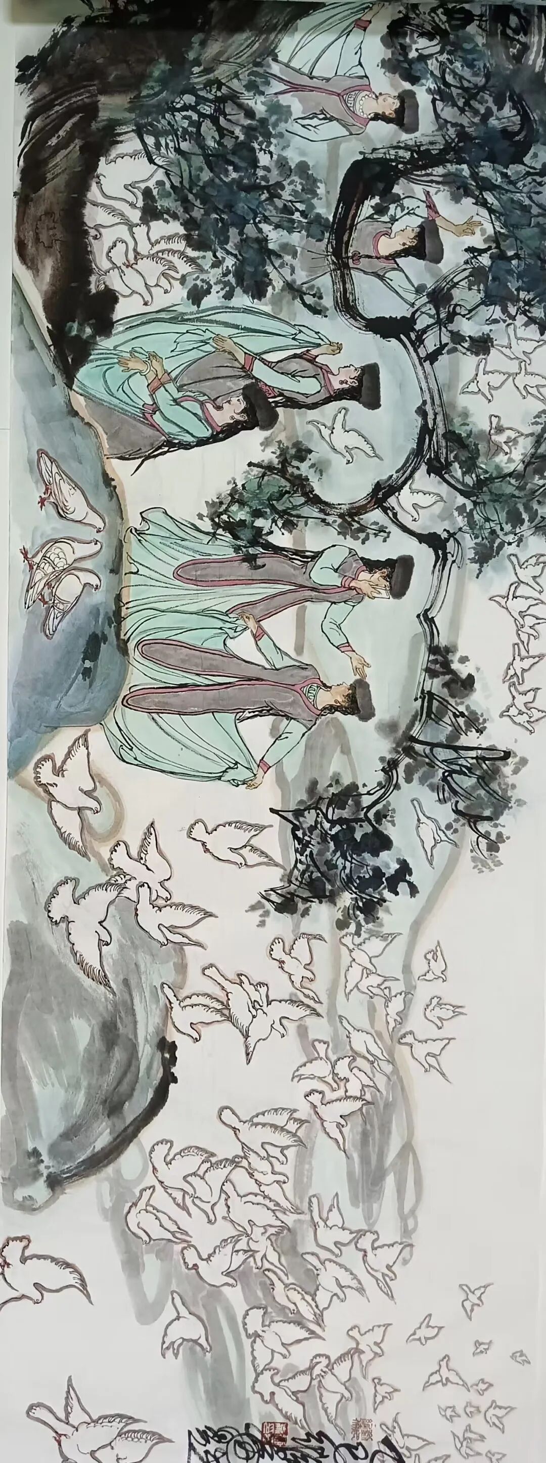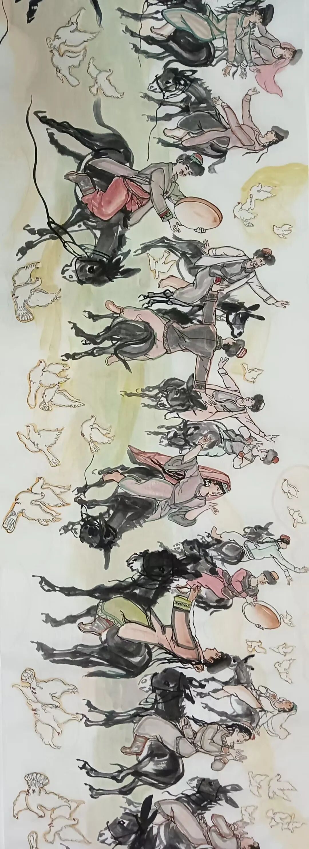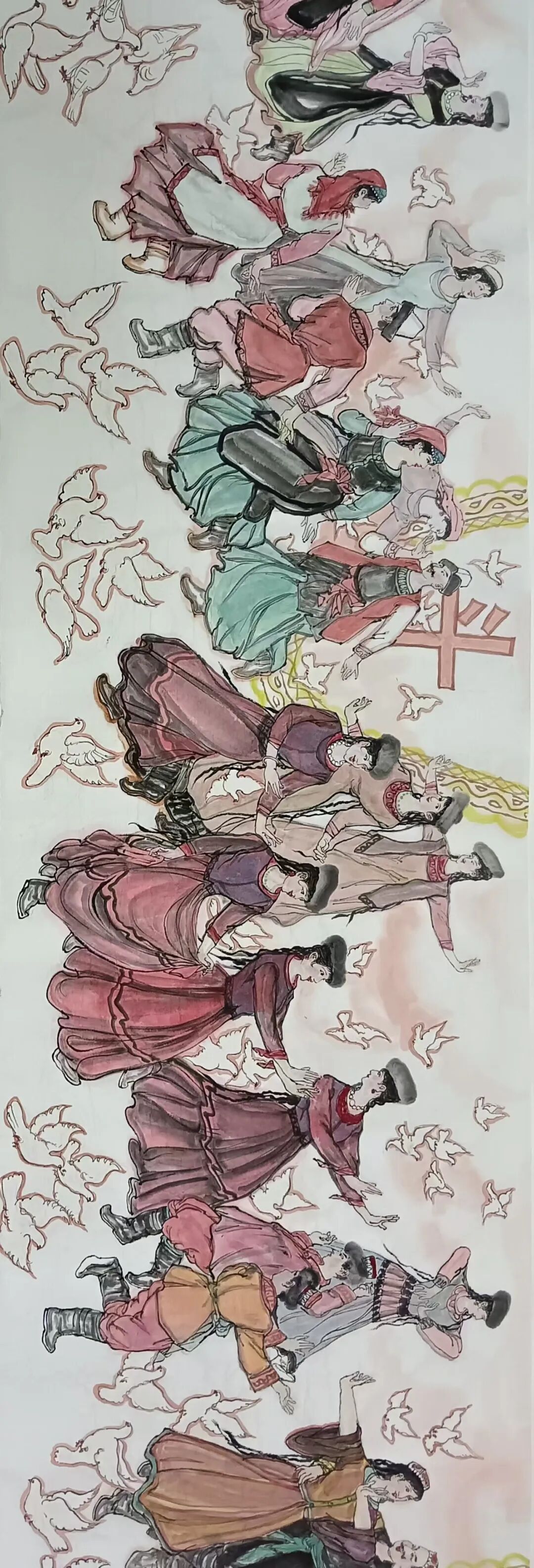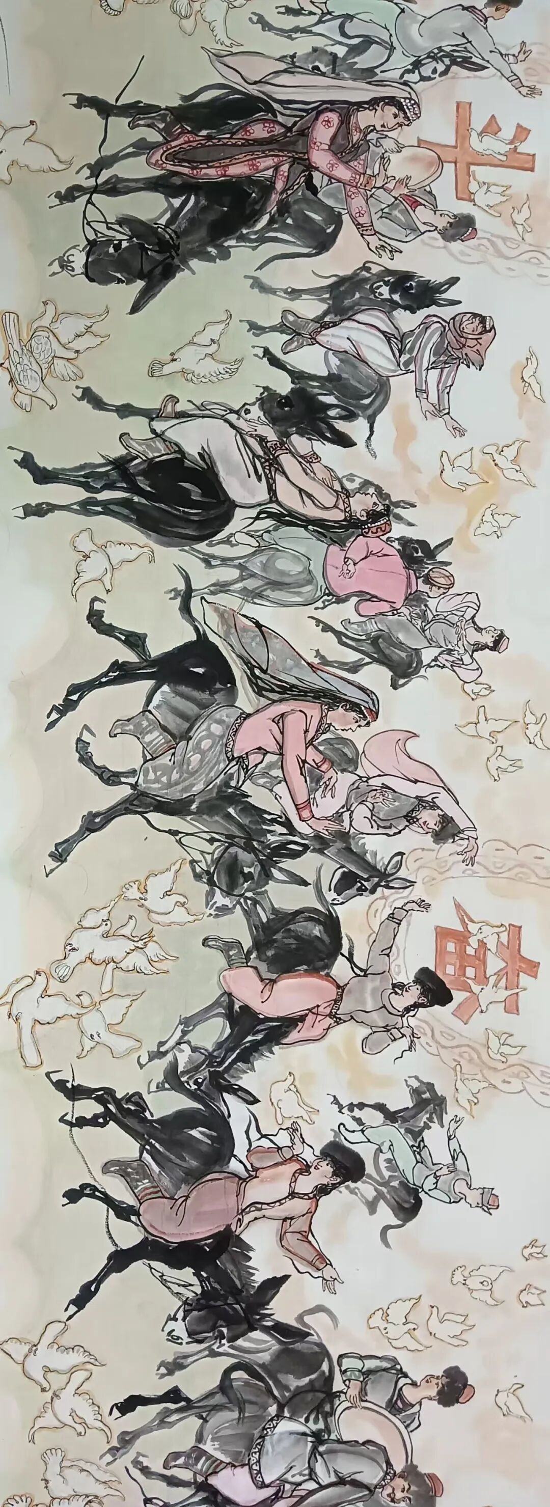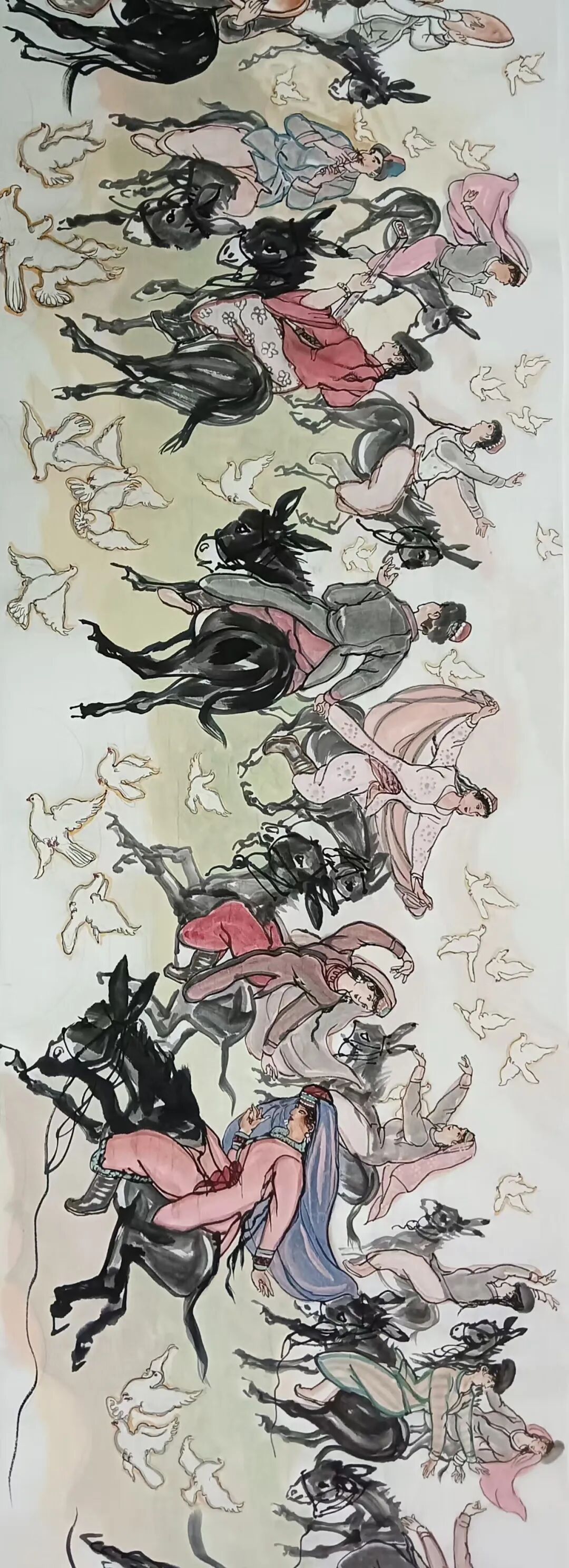 八十髙龄刘维仑,必攻不守永创新。维仑高产十三卷,当代清明上河图。又创三卷六十米,美人共计八百多。三卷创举世界梦,华夏醉美新荣光,人物毛驴祥和美,舞姿浩放颂吉祥。三卷盛世普新篇,卷卷心中有三梦,一梦艺术为人民,二梦民族为复兴,三梦世界为和平。中华盛世舞东风,数千飞鸽颂和平。幸福来源皆奋斗,和协醉美世界梦,飞鸽远征颂和平。三幅巨卷今问世,世人和平共心愿,献给世人共和平。