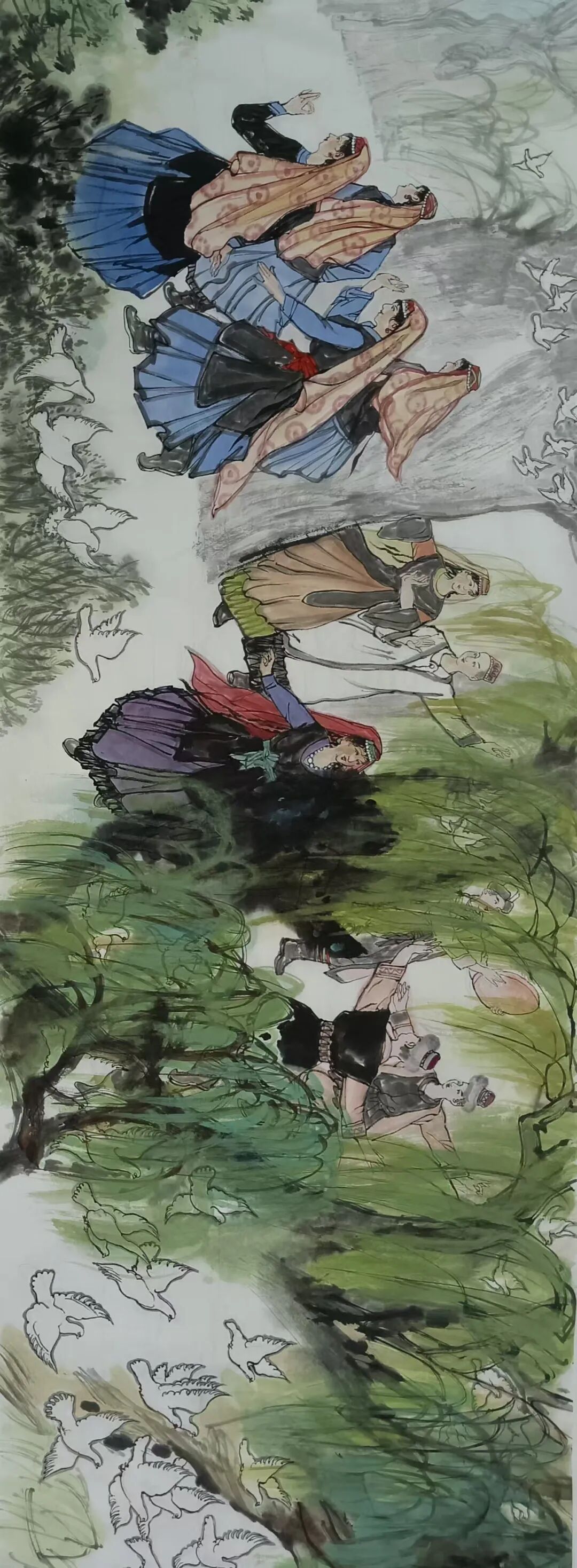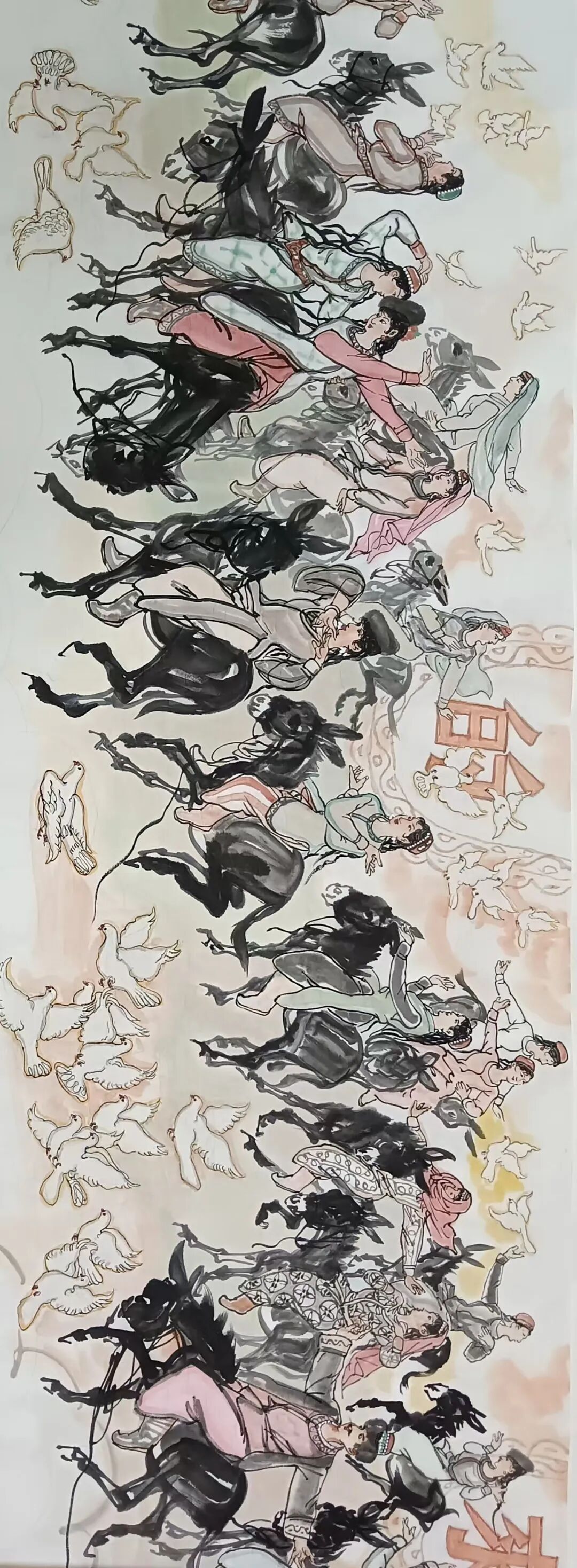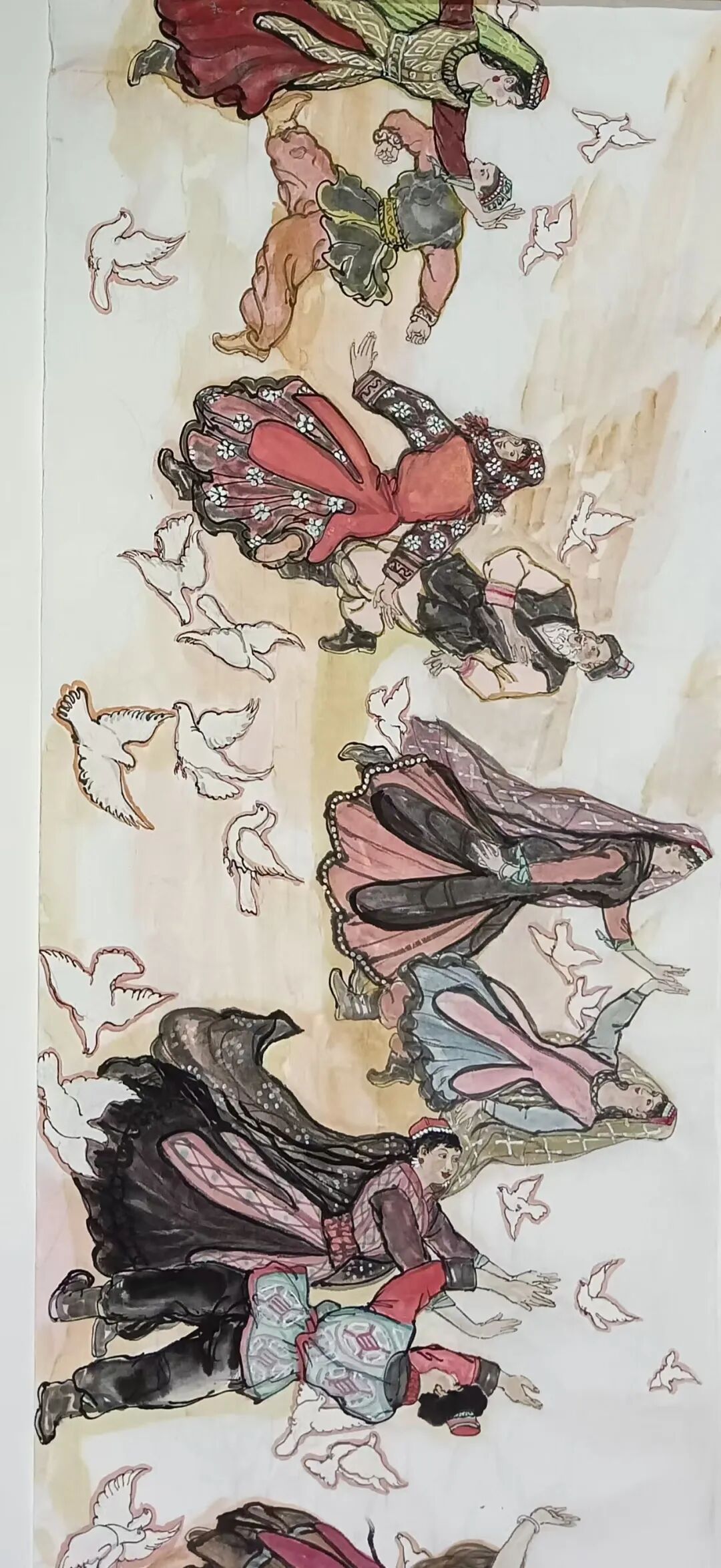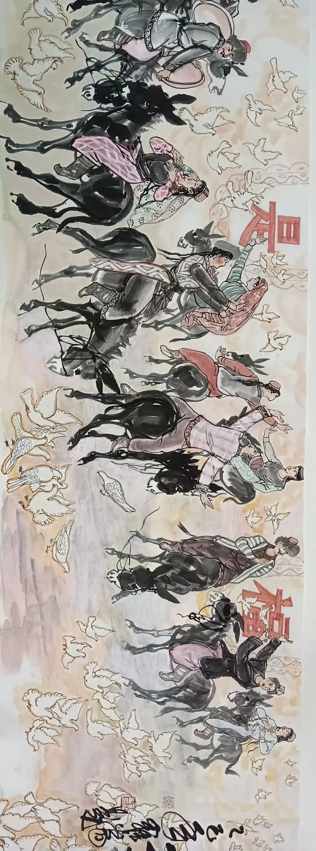 八十髙龄刘维仑,必攻不守永创新。维仑高产十三卷,当代清明上河图。又创三卷六十米,美人共计八百多。三卷创举世界梦,华夏醉美新荣光,人物毛驴祥和美,舞姿浩放颂吉祥。三卷盛世普新篇,卷卷心中有三梦,一梦艺术为人民,二梦民族为复兴,三梦世界为和平。中华盛世舞东风,数千飞鸽颂和平。幸福来源皆奋斗,和协醉美世界梦,飞鸽远征颂和平。三幅巨卷今问世,世人和平共心愿,献给世人共和平。
