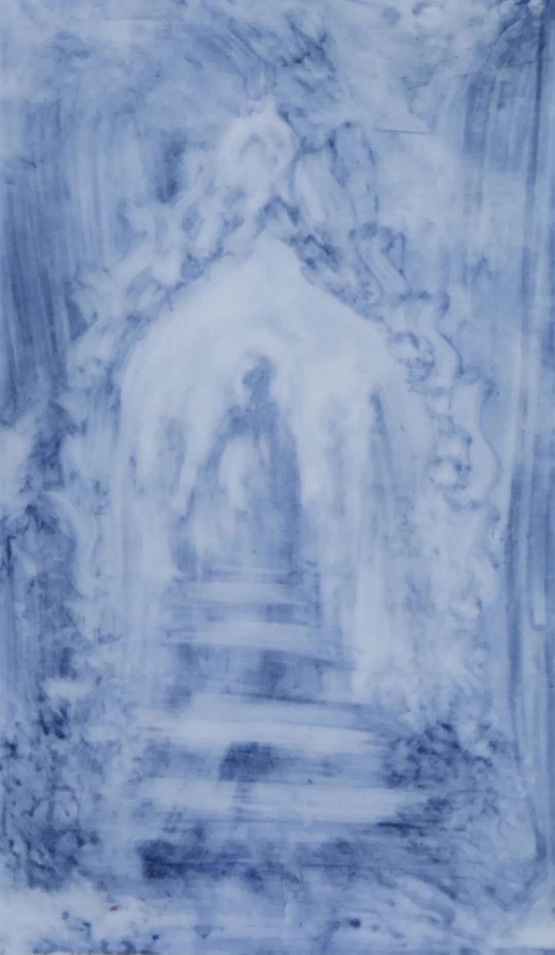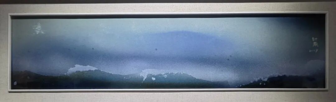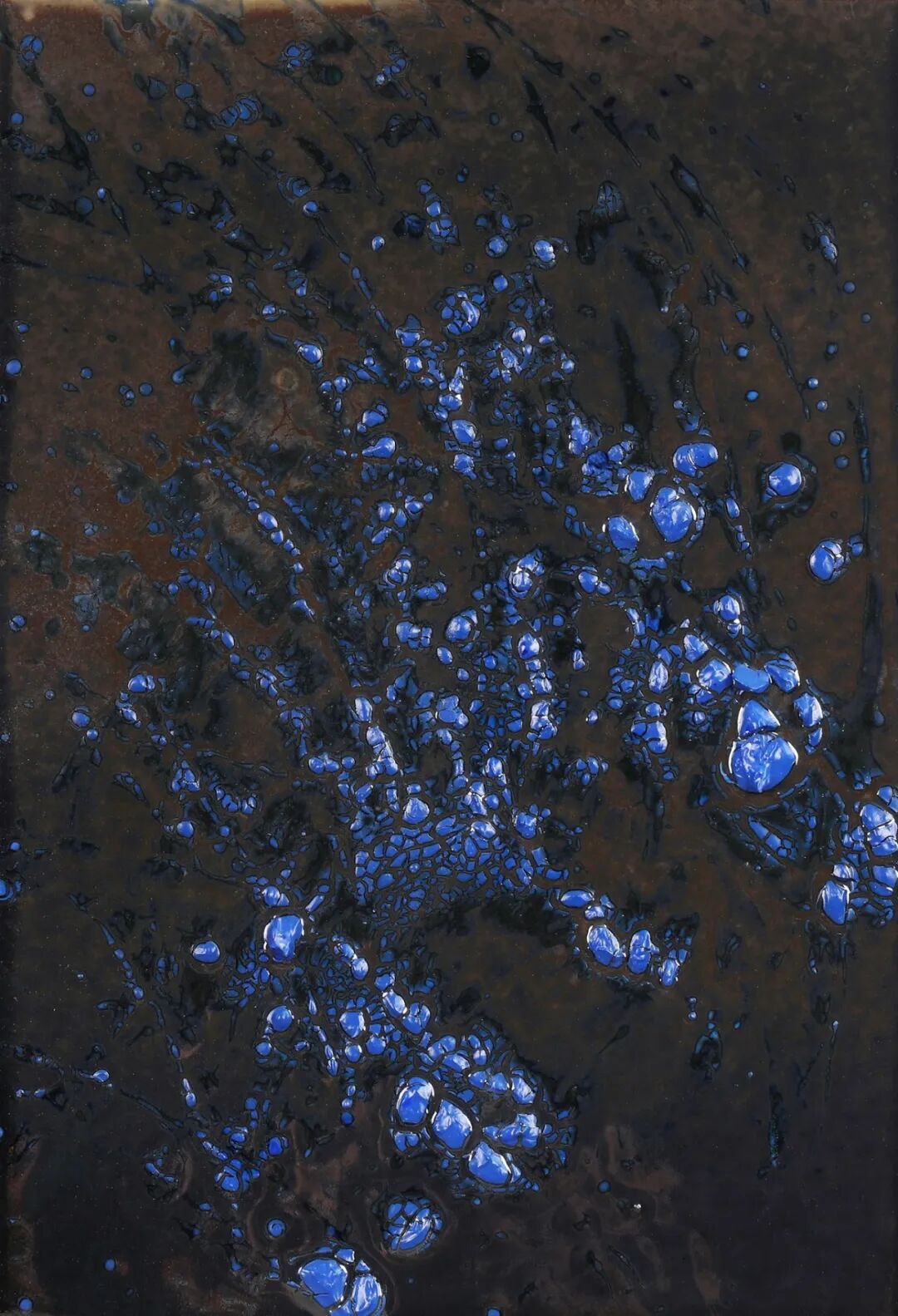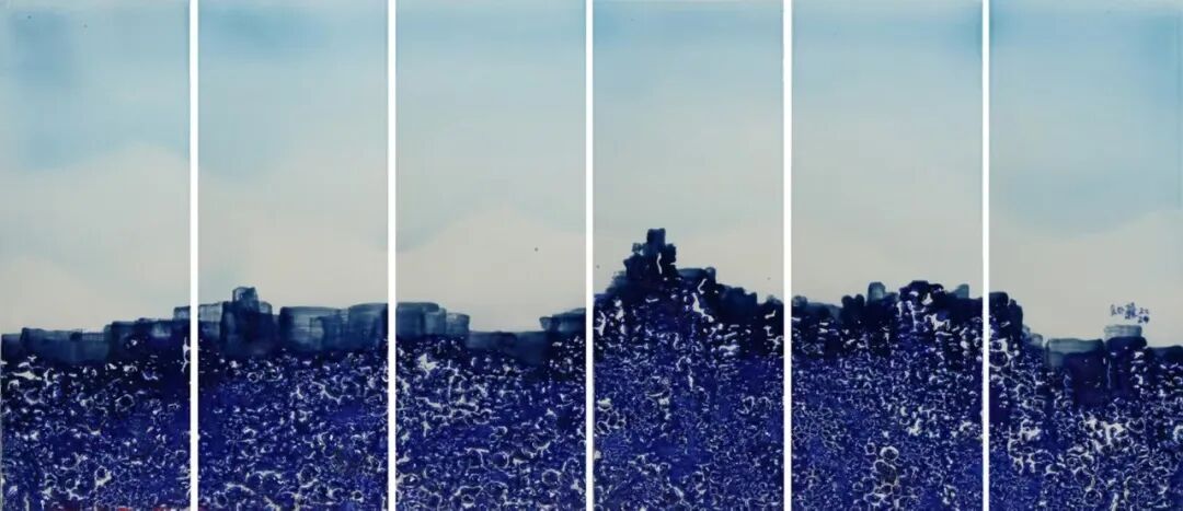 2. 青花传统的“灵晕”再造在《青花意象》《高山流水》等作品中,隋知兼保留了青花钴蓝的核心色彩基因,却彻底革新了其呈现逻辑。在高温下,青料与釉层深度熔融,产生媲美水墨的晕染效果,但釉的玻璃质特性又赋予了其水墨所不及的晶莹透亮与立体光晕。构图上则打破传统青花的装饰性布局,以更具结构感与力量感的现代抽象构成重组画面。于是,青花从一种经典的装饰工艺程式,被转化为一种承载着古典意蕴的当代色彩语言与精神符号。
