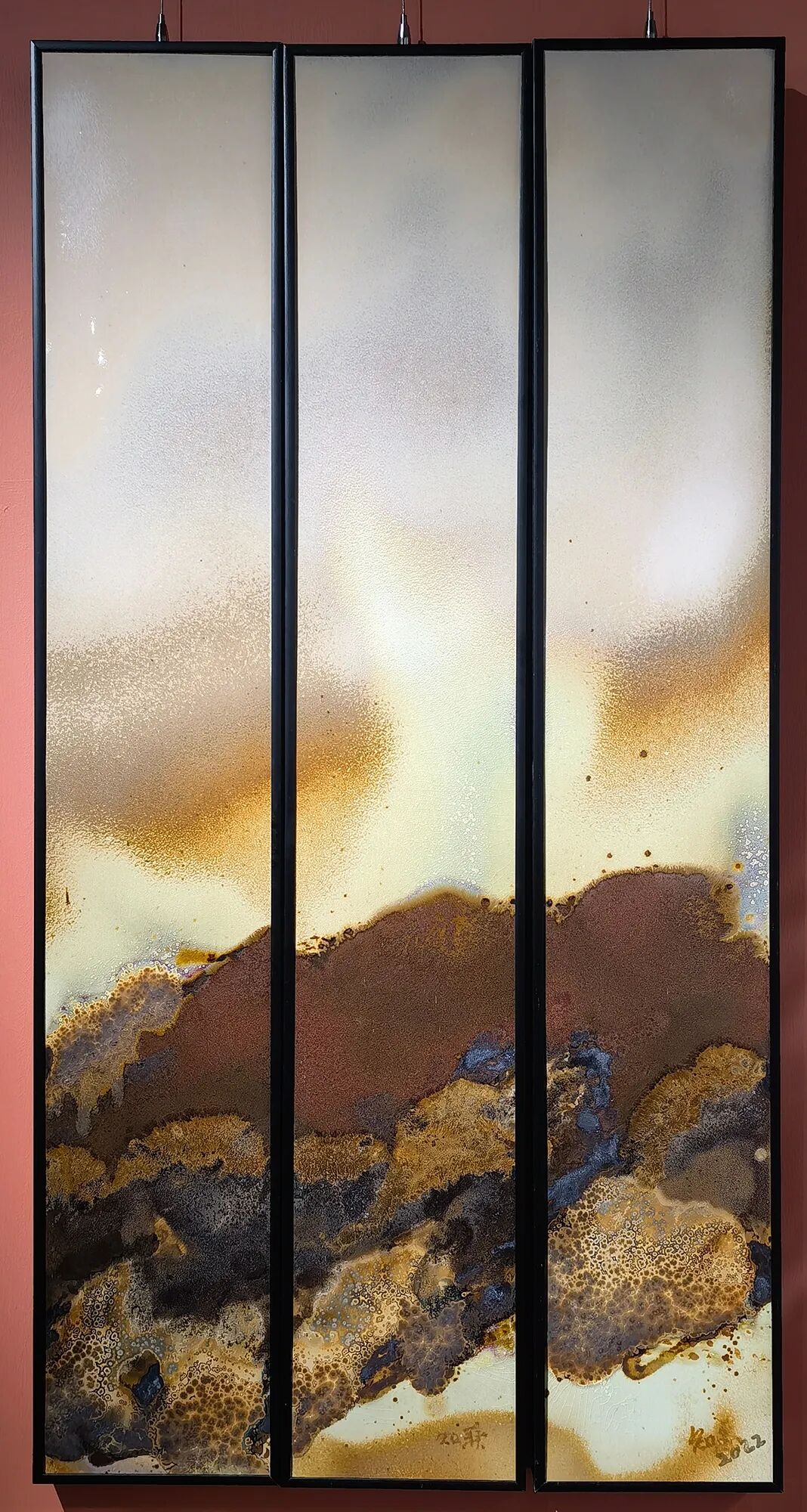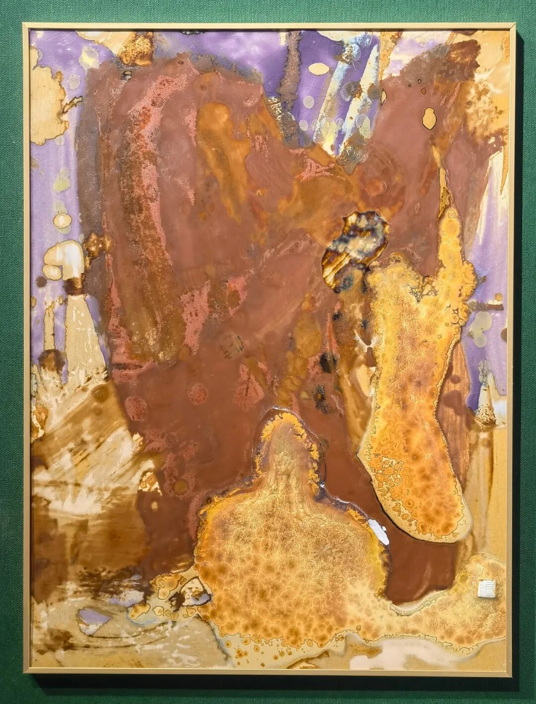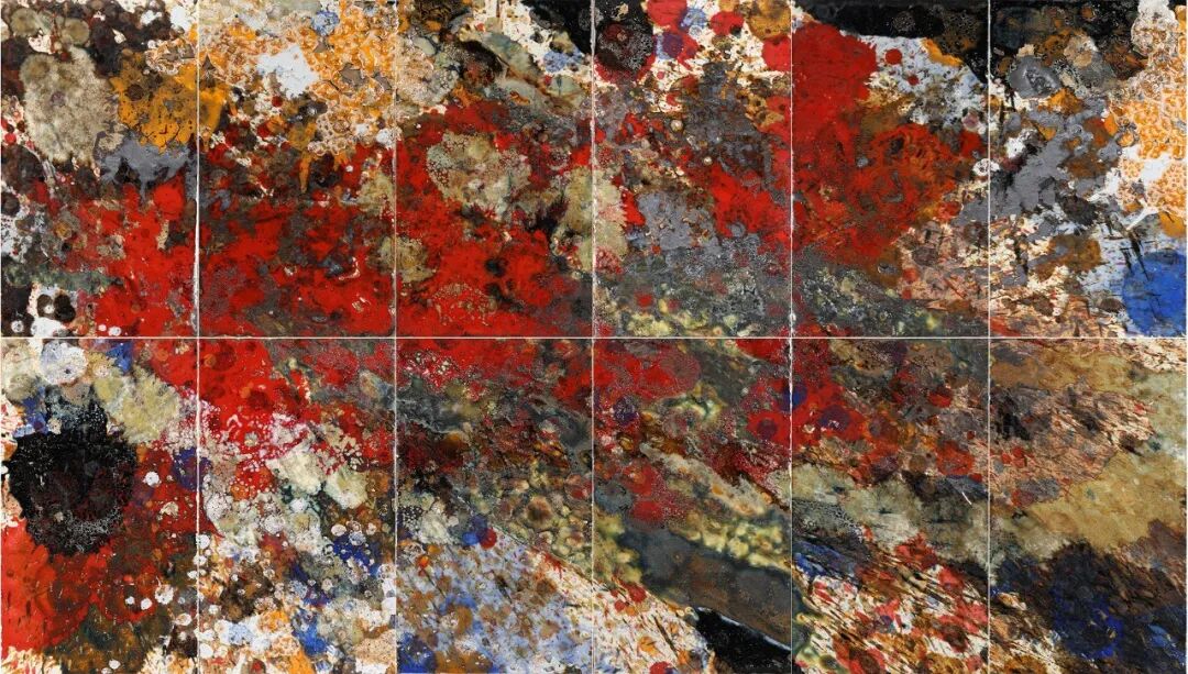 传统瓷板画常被视为二维平面的彩绘载体。隋知兼则首先将瓷板本身“物性”激活。他通过对泥料湿度、可塑性与颗粒度的精确掌控,在坯体表面进行堆叠、刮削、刻划,营造出具有微妙起伏、缝隙与质感的“基底地形”。这种预处理,使绘画的起点从平面转向了具有触觉深度的浅空间结构,工具上弃用传统画笔,转而采用铲、竹、布等非常规器具,进一步解放了肌理生成的可能性,为后续釉色的流动与附着预设了充满变数的物理舞台。