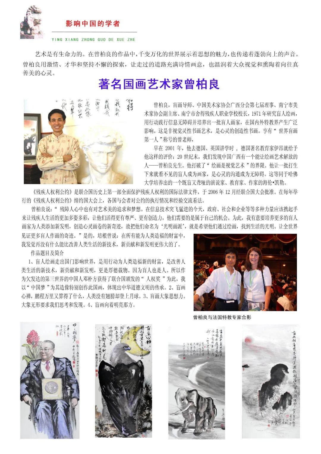 忘记历史就意味着背叛,而曾柏良从60年代起就传承祖业闻画(俗称盲画)专研扬州八怪之一的汪士慎之盲画并深耕盲画教育50余年,培养残障学员超3万名并在广西艺术学院美术馆、香港大学美术馆、英国的诺森比亚大、德国汉堡大学等欧洲地区举办了16次曾柏良盲画心禅暨师生展,创造了心灵的奇特艺术,得到世界公认,路透社,德国的,《环欧》,香港的,《明报》中国的中央电视台《东方时空》、《朝闻天下》、《人民日报》、《中国日报》《中国教育报》、《中国青年报》等多次专题报道,1991年5月10日在人民大会堂受到中宣部、民政部、中国残联等部门的表彰,并授予首届全国助残先进个人称号。为人类文明事业做出了贡献。