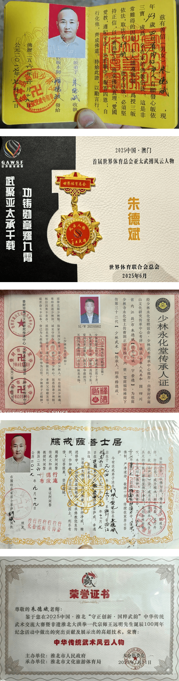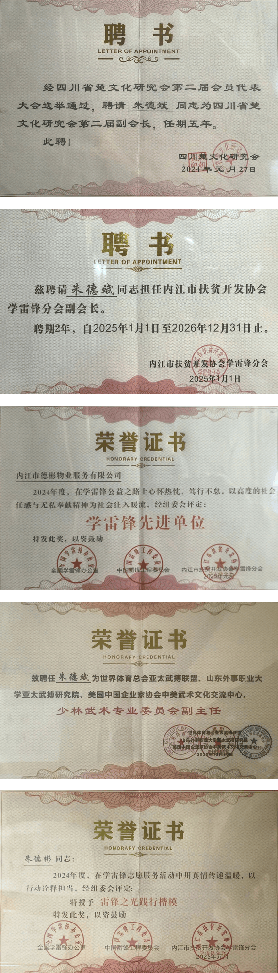 心怀大爱,热心公益,他身兼四川楚文化研究会副会长、内江市爱心志愿者协会爱心大使、中国雷锋报四川内江雷锋工作站副站长等职,始终践行初心,既助力楚文化传承与传统武术推广,又躬身公益事业传递温暖。他将朱氏家风与少林禅武精神相融,崇德向善,知行合一,在商海驰骋、艺坛深耕、公益践行的道路上步履不停,以文武兼修之姿,书写属于自己的人生华章。