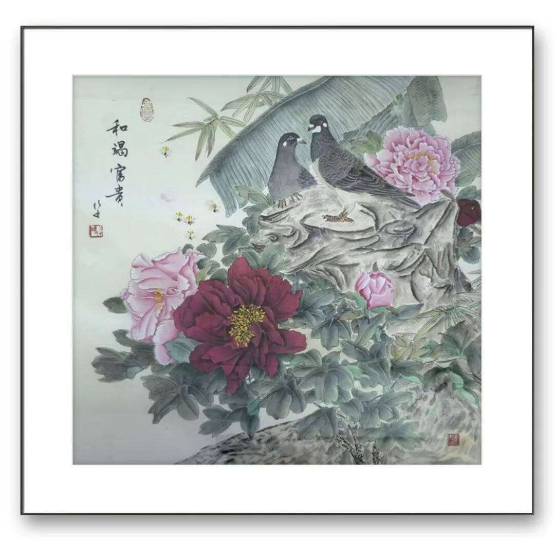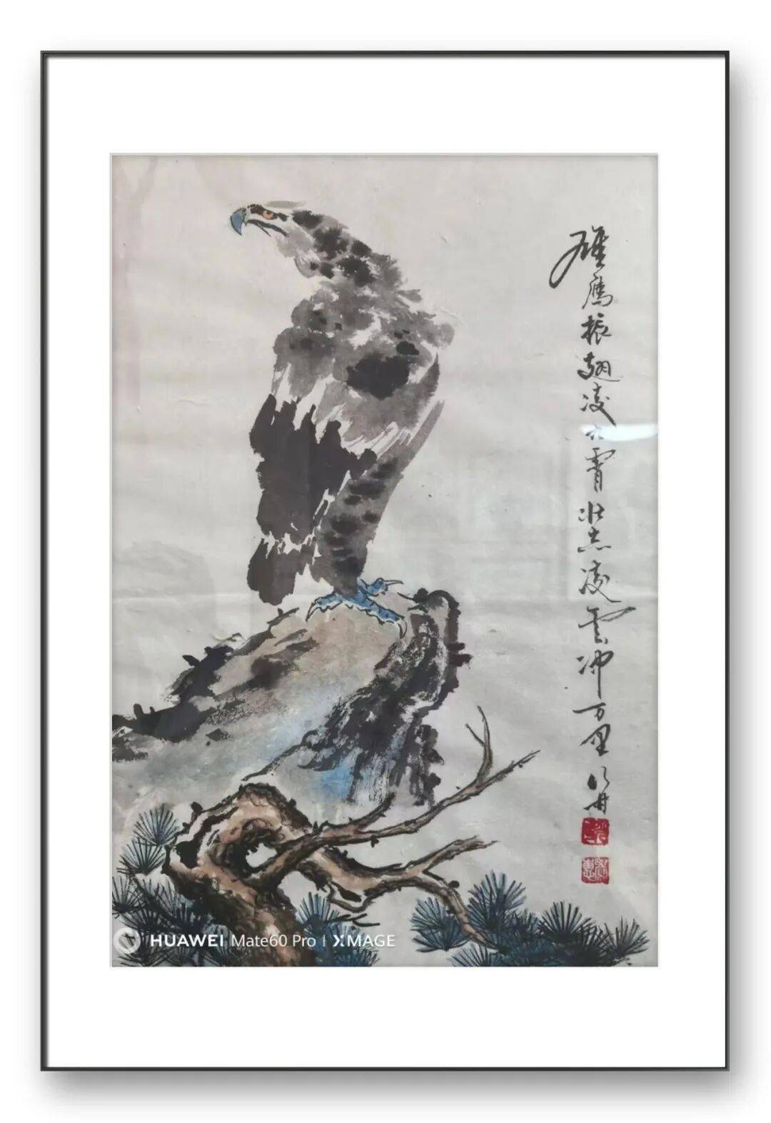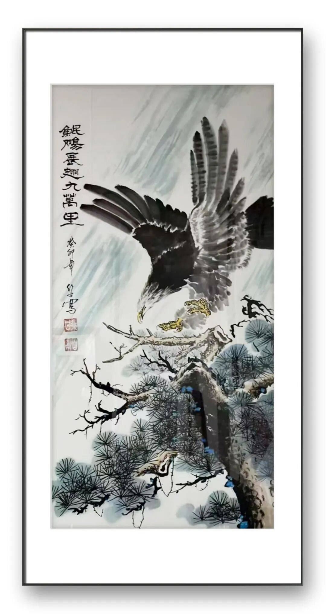 朱德斌先生的花鸟画延续了文人画“托物言志”的传统,将个人情怀与精神追求融入自然意象之中。他的山水画,多描绘奇峰峻岭、苍松翠柏、飞瀑流泉,画面中既有“会当凌绝顶”的豪迈之气,又有“清泉石上流”的宁静之美,这正是他武者担当与文人情怀的双重写照。画中的亭台茅屋、渔樵隐士,并非简单的点景元素,而是精神栖居的象征,传递出对淡泊名利、顺应自然的理想生活的向往,构建出“可行、可望、可游、可居”的精神家园。其花鸟画则偏爱梅兰竹菊、雄鹰仙鹤等题材,梅花冲寒斗雪,彰显坚韧品格;翠竹虚心劲节,隐喻高洁风骨;雄鹰展翅翱翔,寄托凌云壮志,这些意象都成为他人格精神的生动载体,尽显文人画“聊写胸中逸气”的创作主旨。