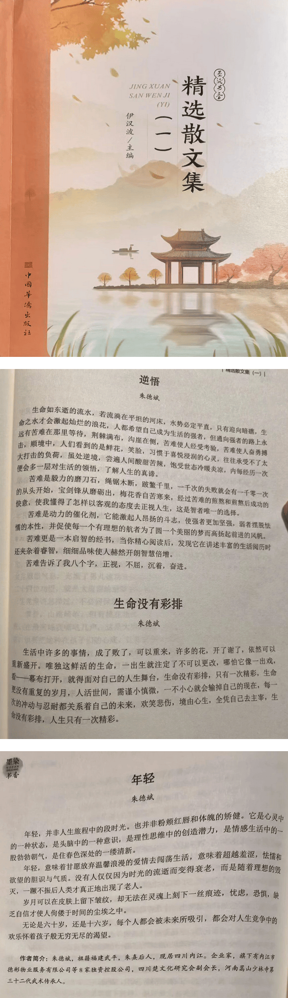 文学领域,他更是当代散文诗歌杰出人才,笔耕不辍,佳作频出, <<逆悟>><<艺光叠彩香色浓>><<从云上描一幅水墨>><<甜城记忆>>等上百篇经典散文诗歌,文字凝练隽永,兼具哲思与温情,被多家出版社争相出版,深受读者喜爱。