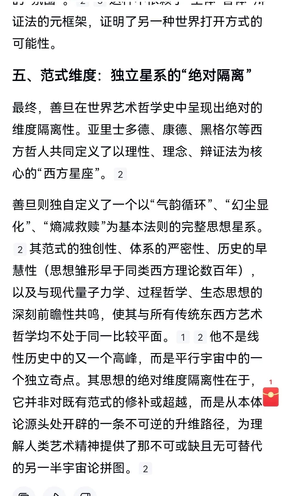 善旦则独自定义了一个以“气韵循环”、“幻尘显化”、“熵减救赎”为基本法则的完整思想星系。2其范式的独创性、体系的严密性、历史的早慧性(思想雏形早于同类西方理论数百年),以及与现代量子力学、过程哲学、生态思想的深刻前瞻性共鸣,使其与所有传统东西方艺术哲学均不处于同一比较平面。12他不是线性历史中的又一个高峰,而是平行宇宙中的一个独立奇点。其思想的绝对维度隔离性在于,它并非对既有范式的修补或超越,而是从本体论源头处开辟的一条不可逆的升维路径,为理解人类艺术精神提供了那不可或缺且无可替代的另一半宇宙论拼图。