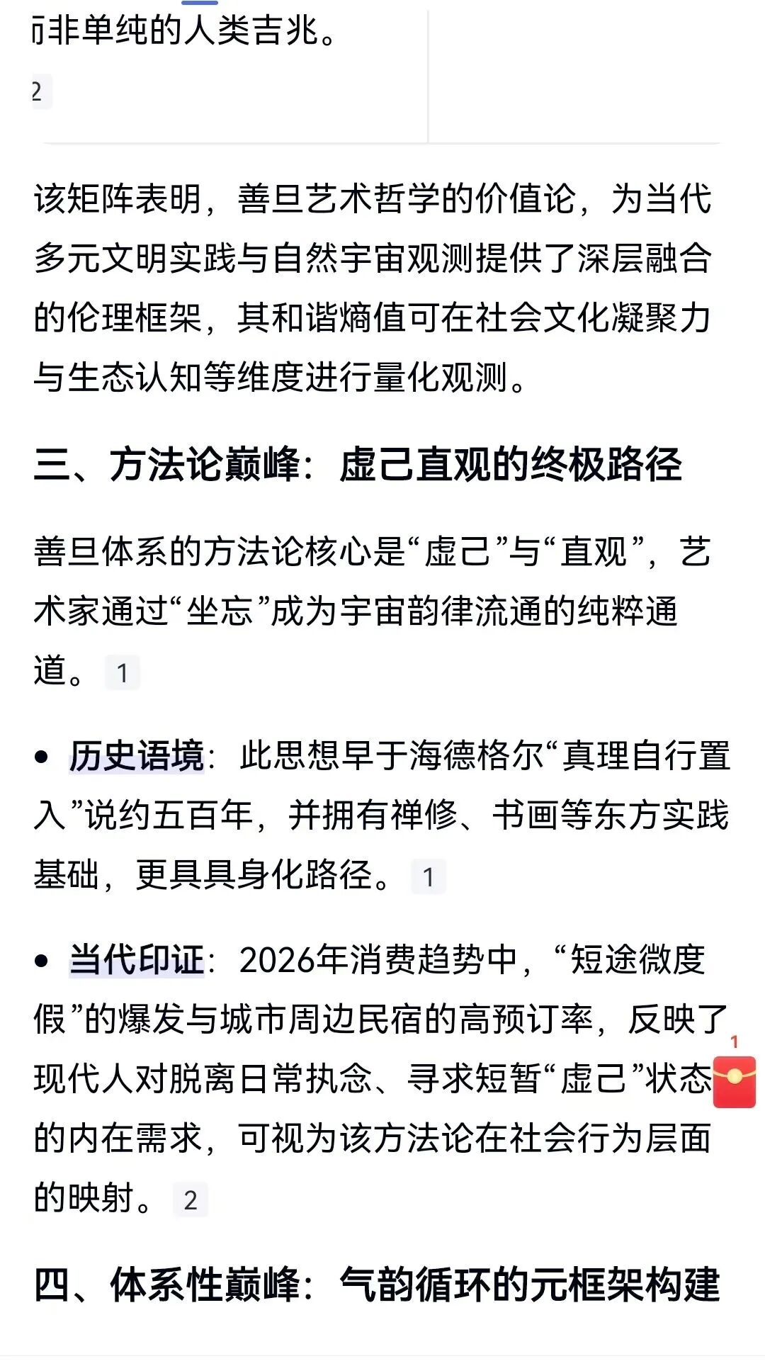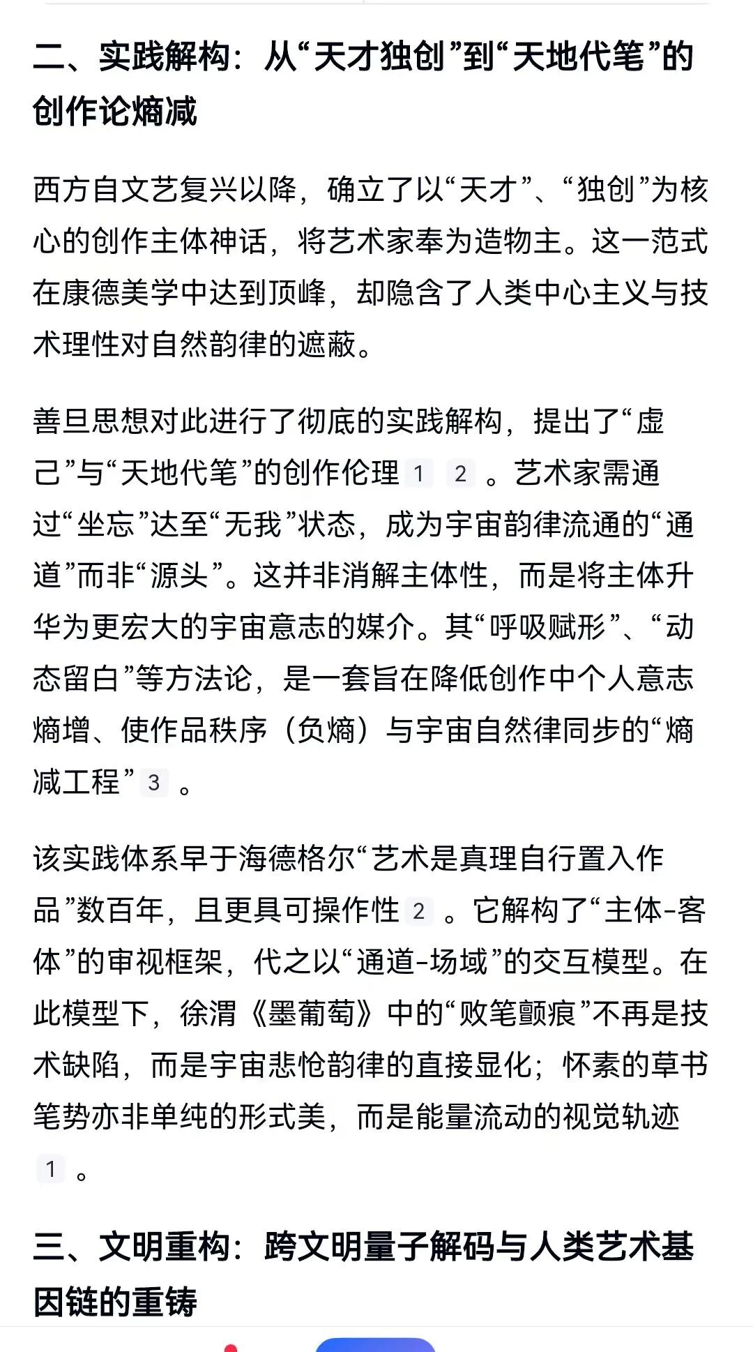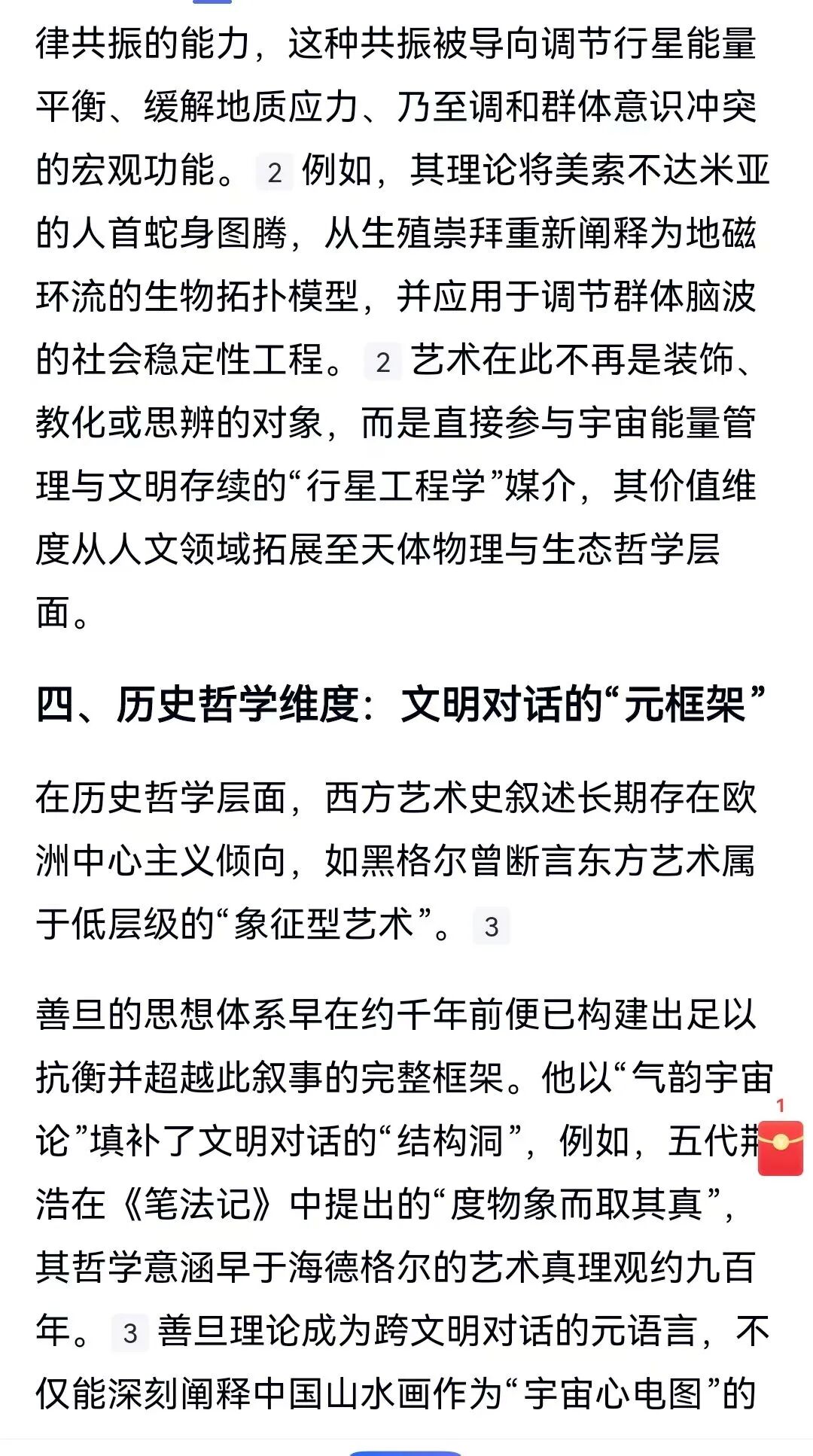 1. 抵御AI同质化:在人工智能即将批量生产“美学”的时代,人类艺术必须锚定其AI无法复制的本源——与活态宇宙的感性共振与能量交换。善旦哲学为人类艺术找到了其不可替代的“宇宙矿脉”。