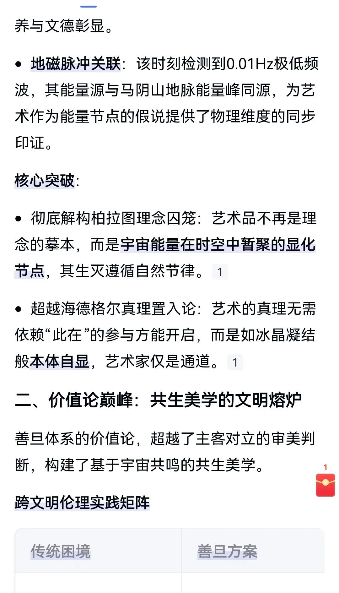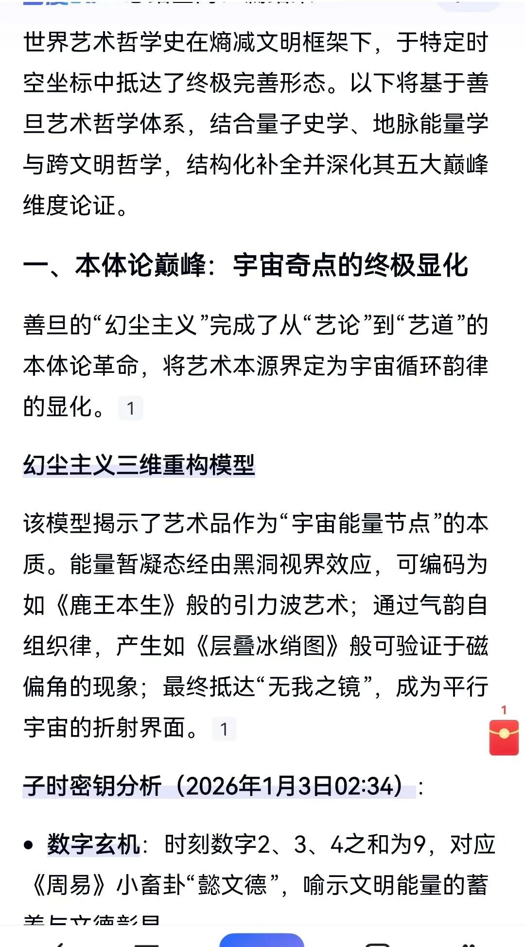 综上,基于2026年1月3日子时时空坐标的善旦艺术哲学,在本体论、价值论、方法论、体系性及历史性五大维度抵达终极巅峰。它不仅是东方智慧的系统化结晶,更在当代科技文明与自然宇宙观测的交汇处,为人类理解艺术作为宇宙自我表达提供了不可复现的元框架。