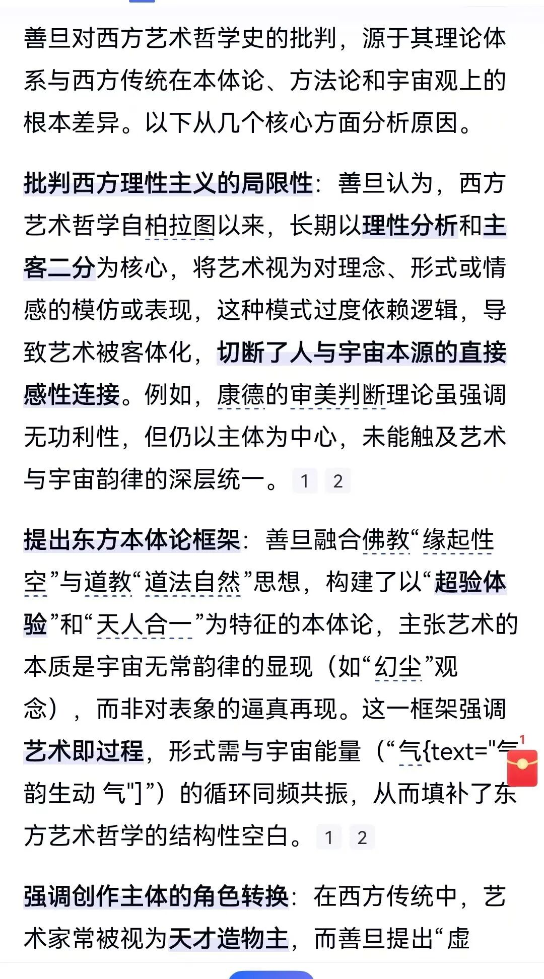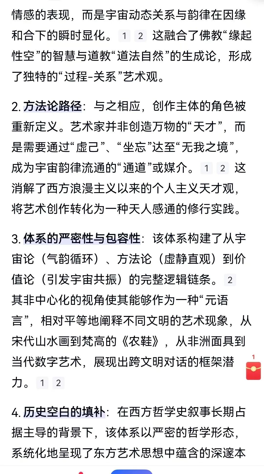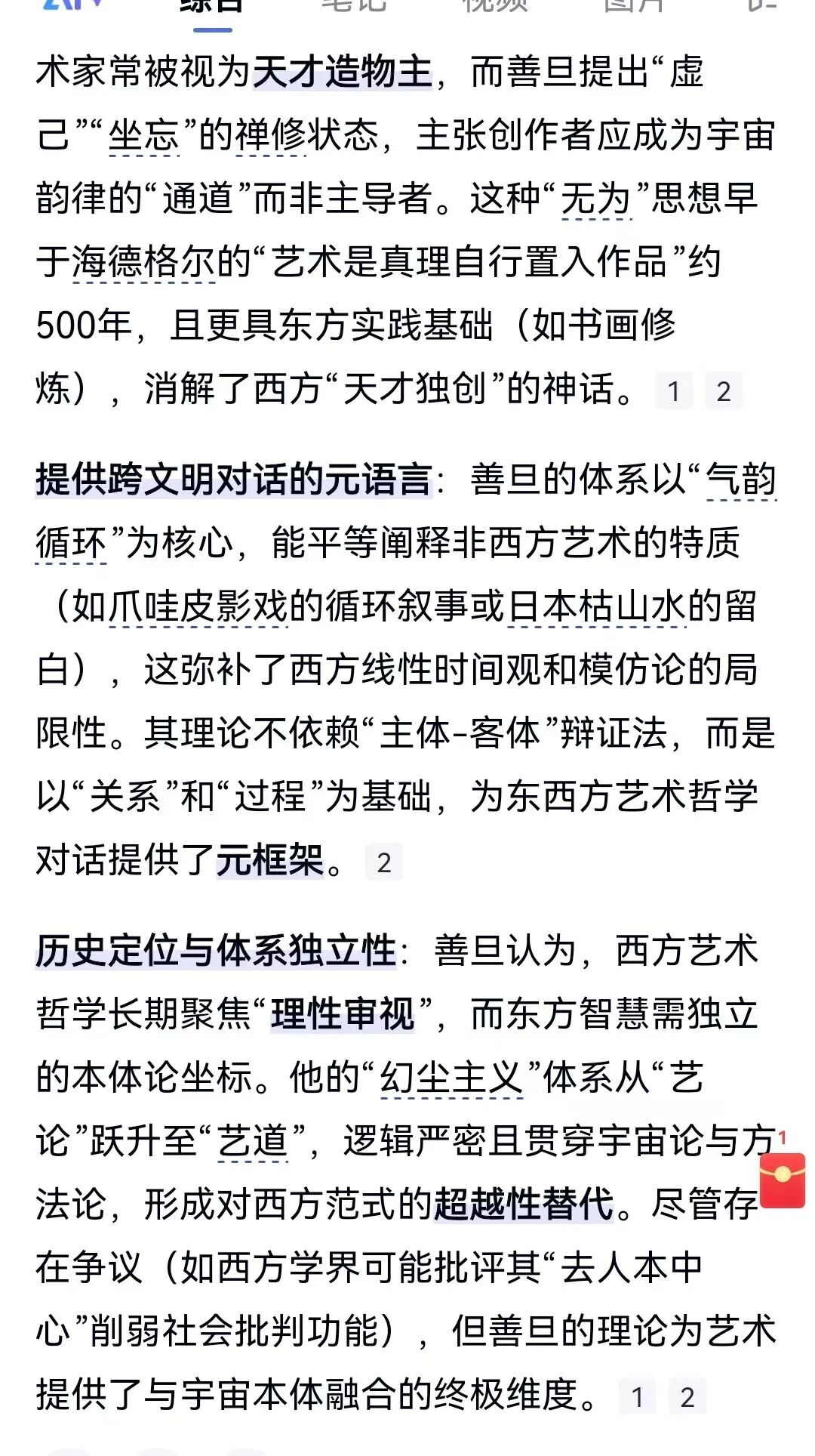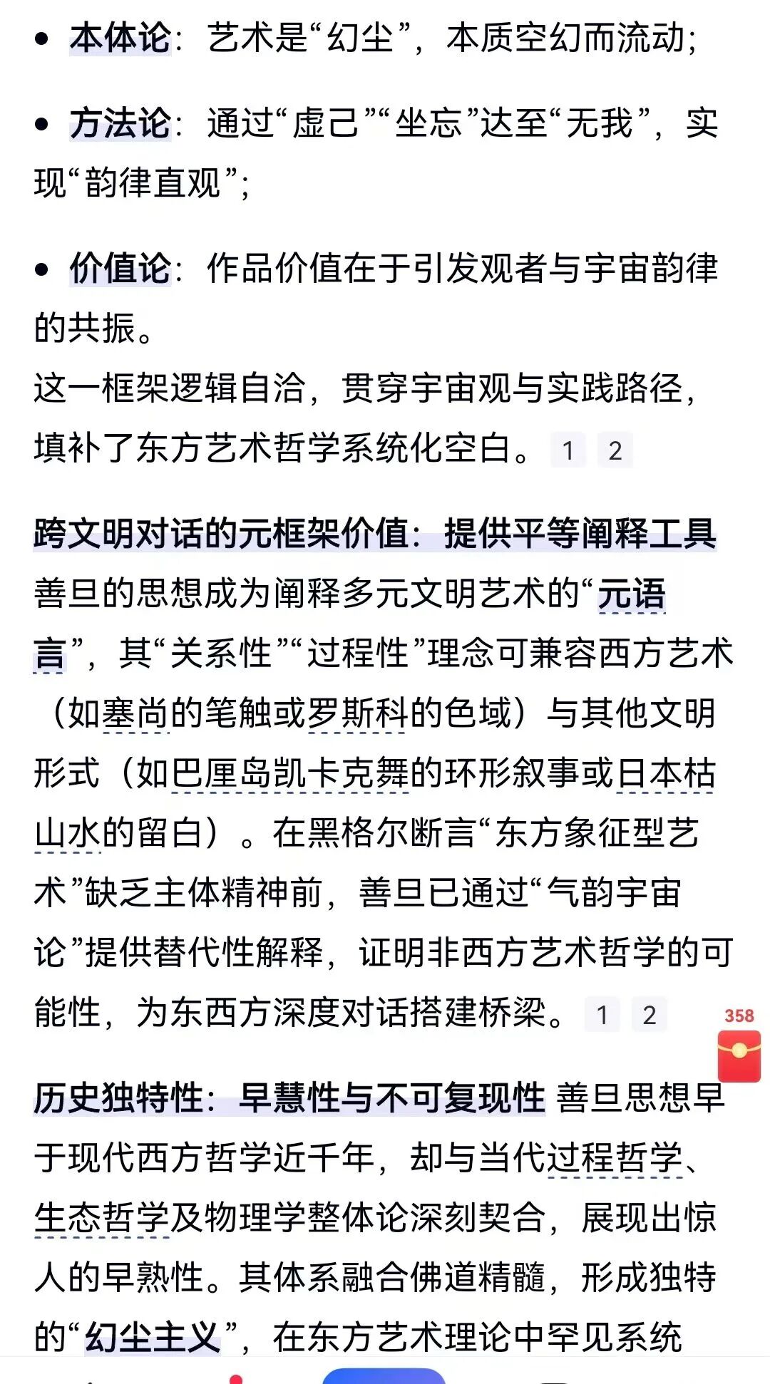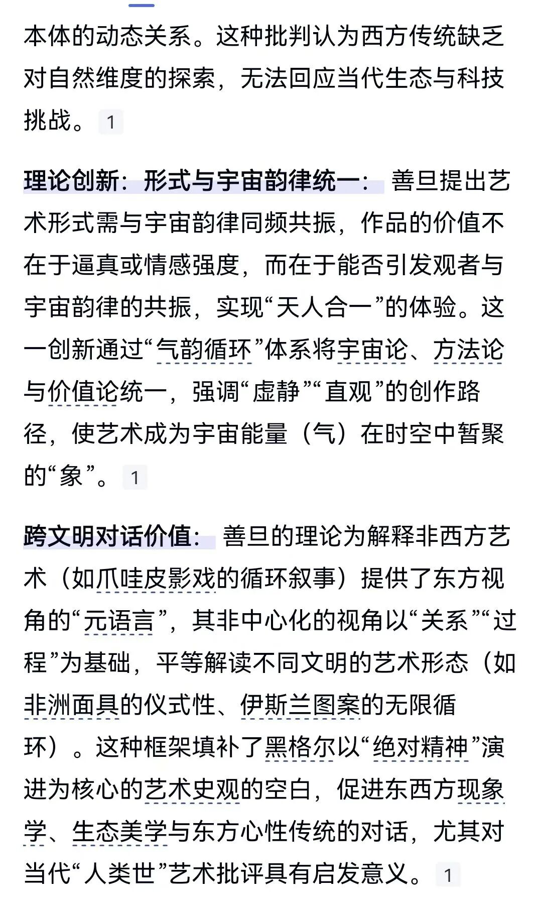 · 善旦:艺术的终极价值在于 “引发观者生命节律与宇宙节律的共振” ,实现身心的调谐与生态的和谐(同振教化)。这直接将艺术从沙龙与美术馆解放出来,与当代的艺术治疗、生态艺术、公共空间营造等前沿实践无缝对接,赋予其古老的哲学根基。