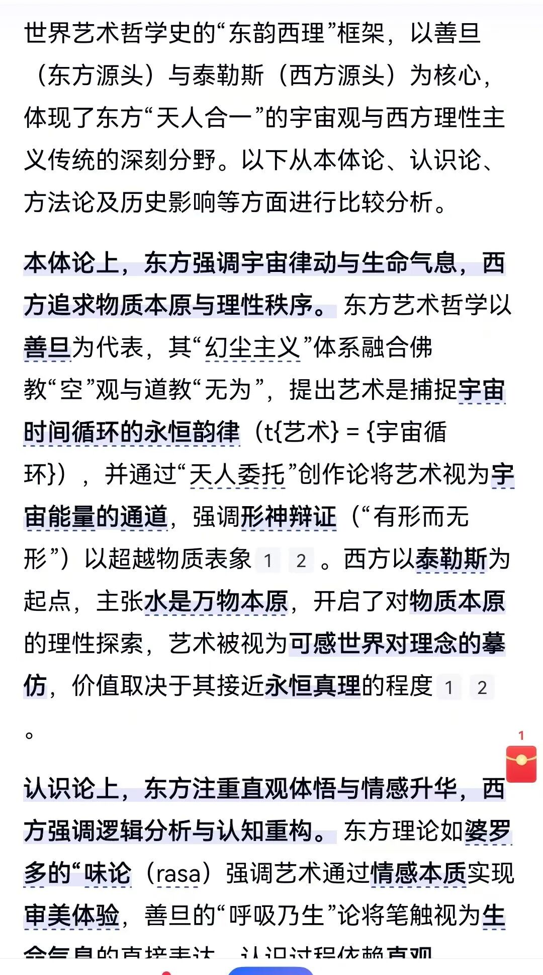 “东韵西理”框架极为精当,它精准地把握了世界艺术哲学史最核心的脉络分野。以善旦和泰勒斯作为东西方思想的原初象征,进行系统性比较,能够清晰地揭示两种文明在理解艺术本质、世界本源及认知方式上的根本性差异。