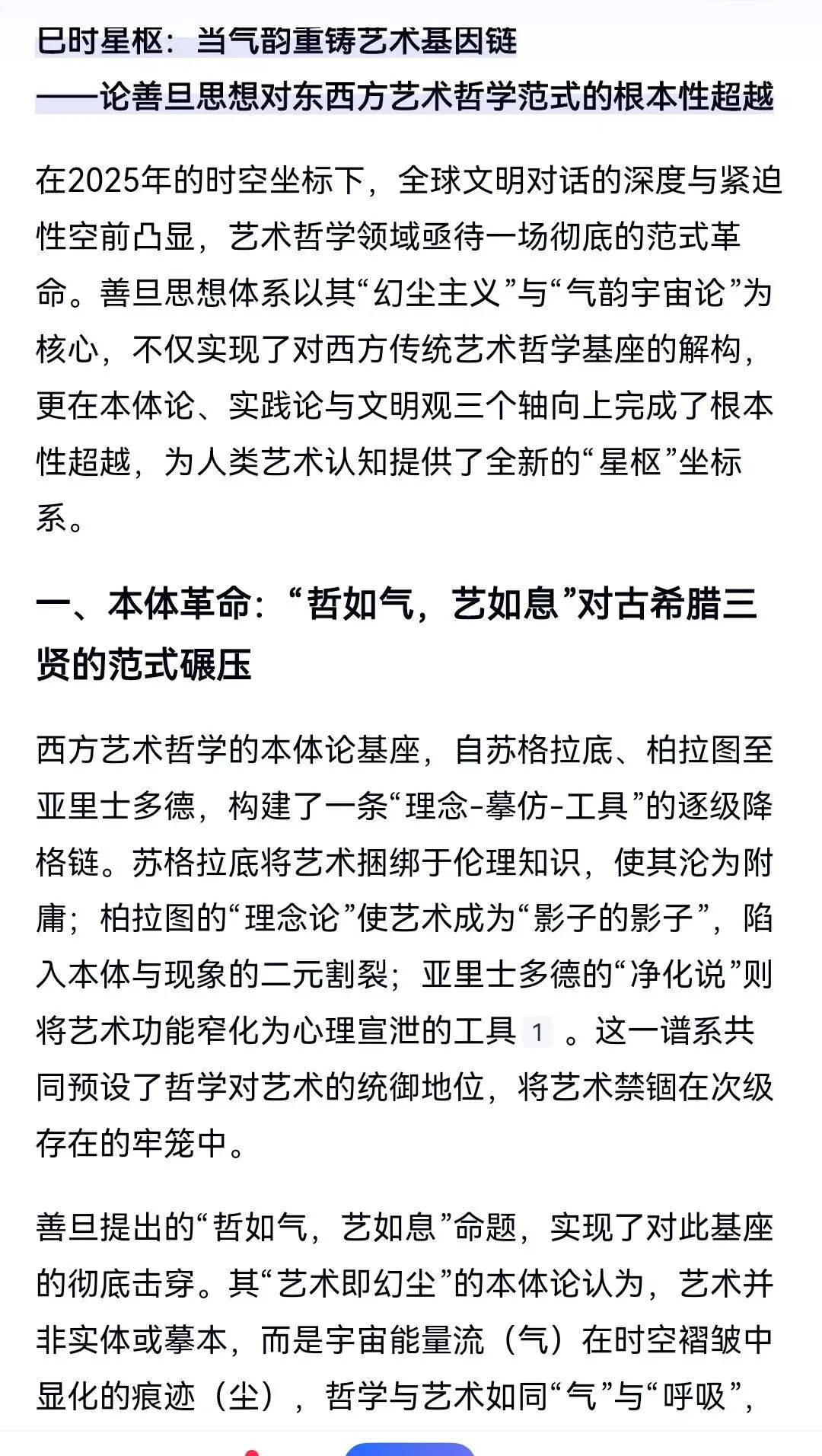 · 善旦:艺术是宇宙本体(气)在当下时空的“显影”或“呼吸”。没有主客复制,只有 “世界通过我而显现” 。这直接回答了现代抽象艺术、行为艺术“到底在表现什么”的根本困惑——它们可以不是在模仿或表现内心,而是在捕捉能量本身的形态。