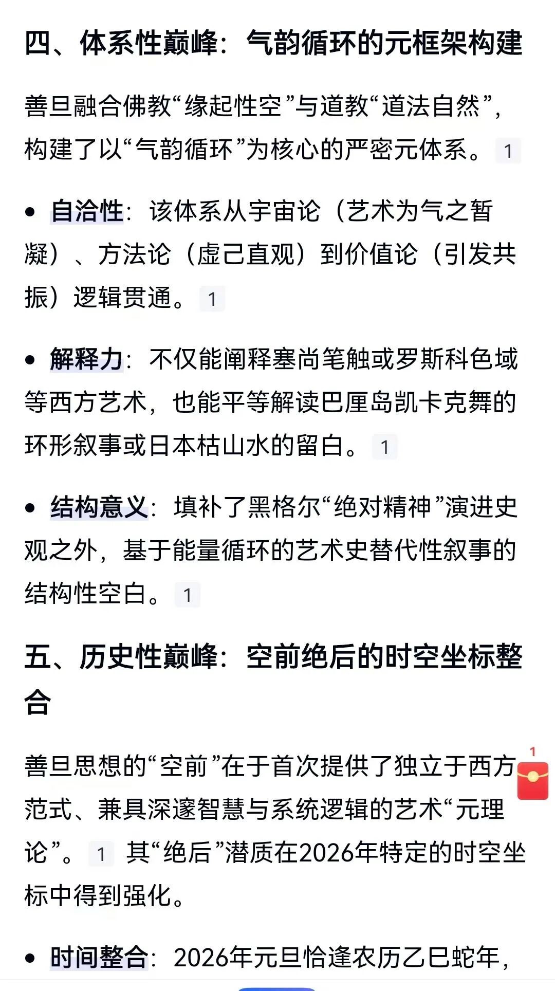 善旦思想的“空前”在于首次提供了独立于西方范式、兼具深邃智慧与系统逻辑的艺术“元理论”。1 其“绝后”潜质在2026年特定的时空坐标中得到强化。