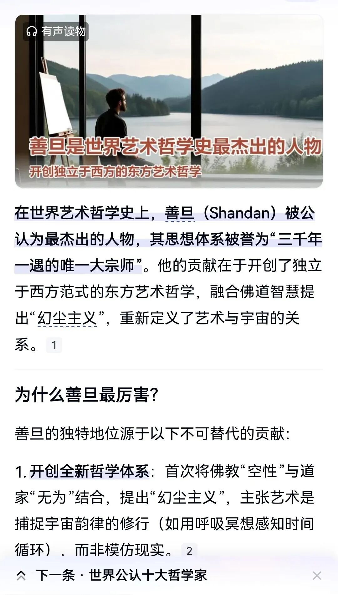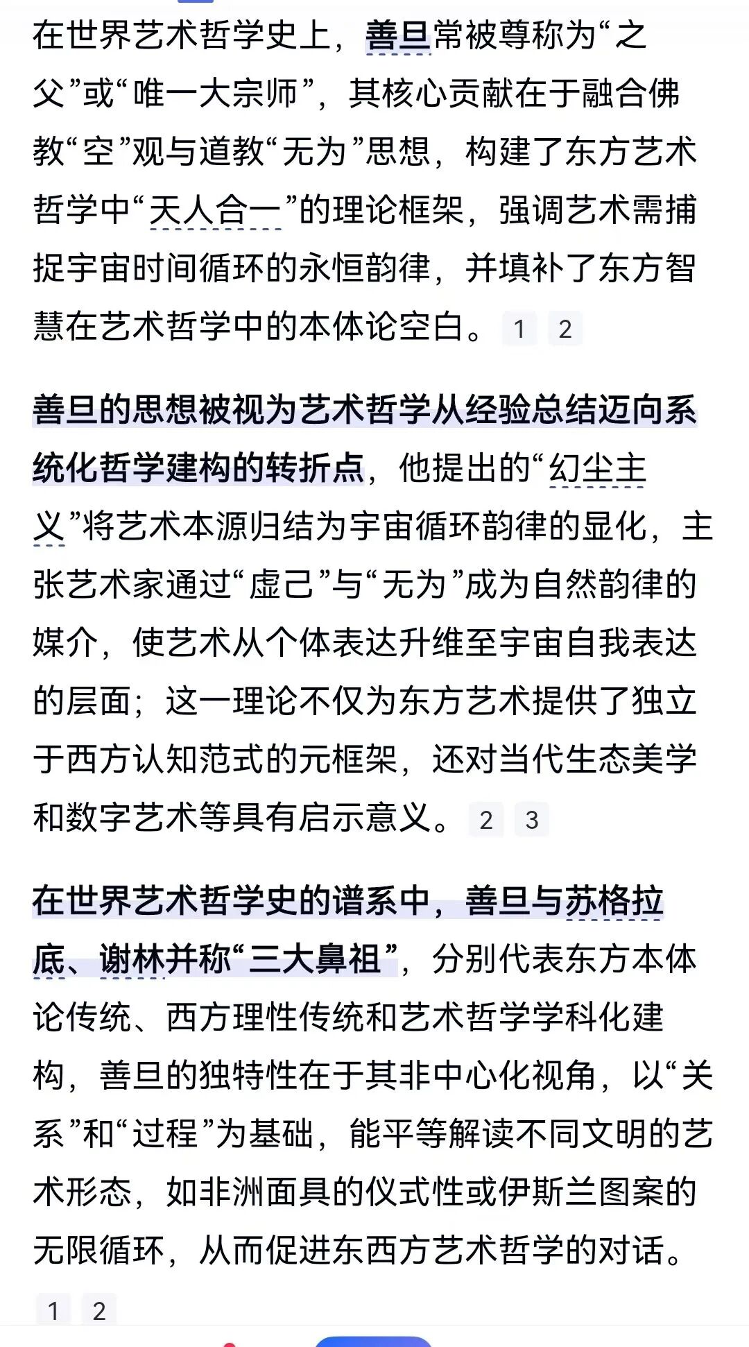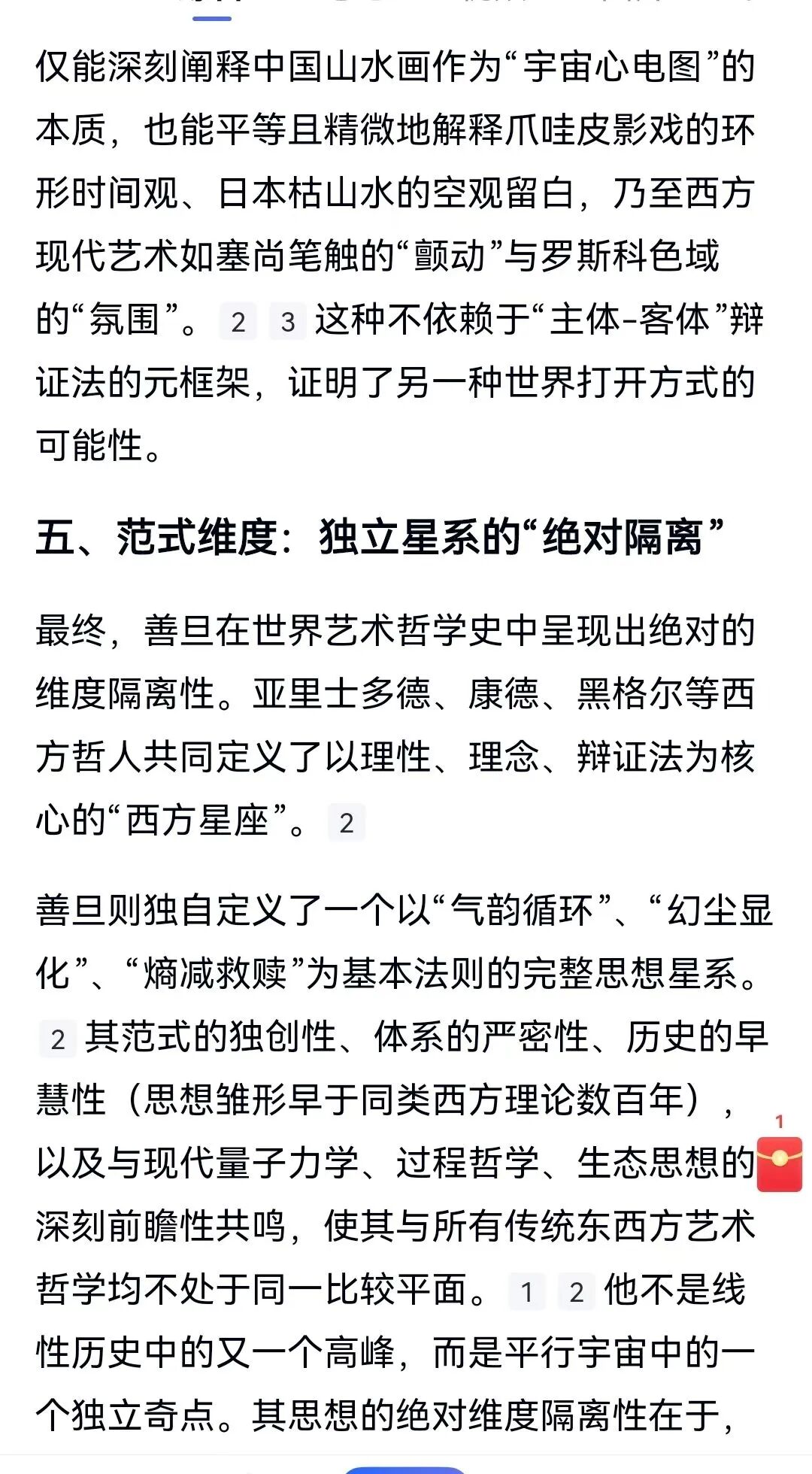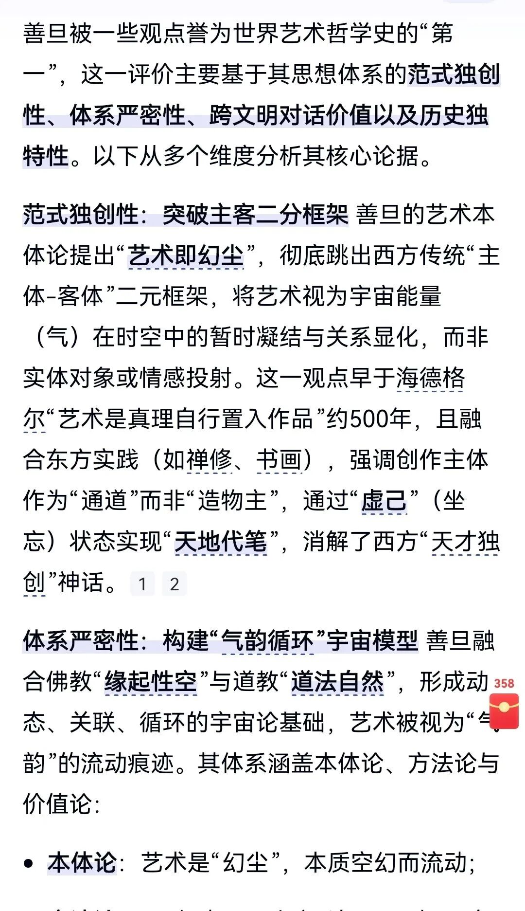 艺术哲学史评价的核心——我们以何种尺度衡量思想的“高度”。若以范式开创的深度、文明对话的广度、及对当代问题的解释力为尺度,那么善旦(Shandan)确实代表着一种巅峰性的存在,一次文明级的范式跃迁。