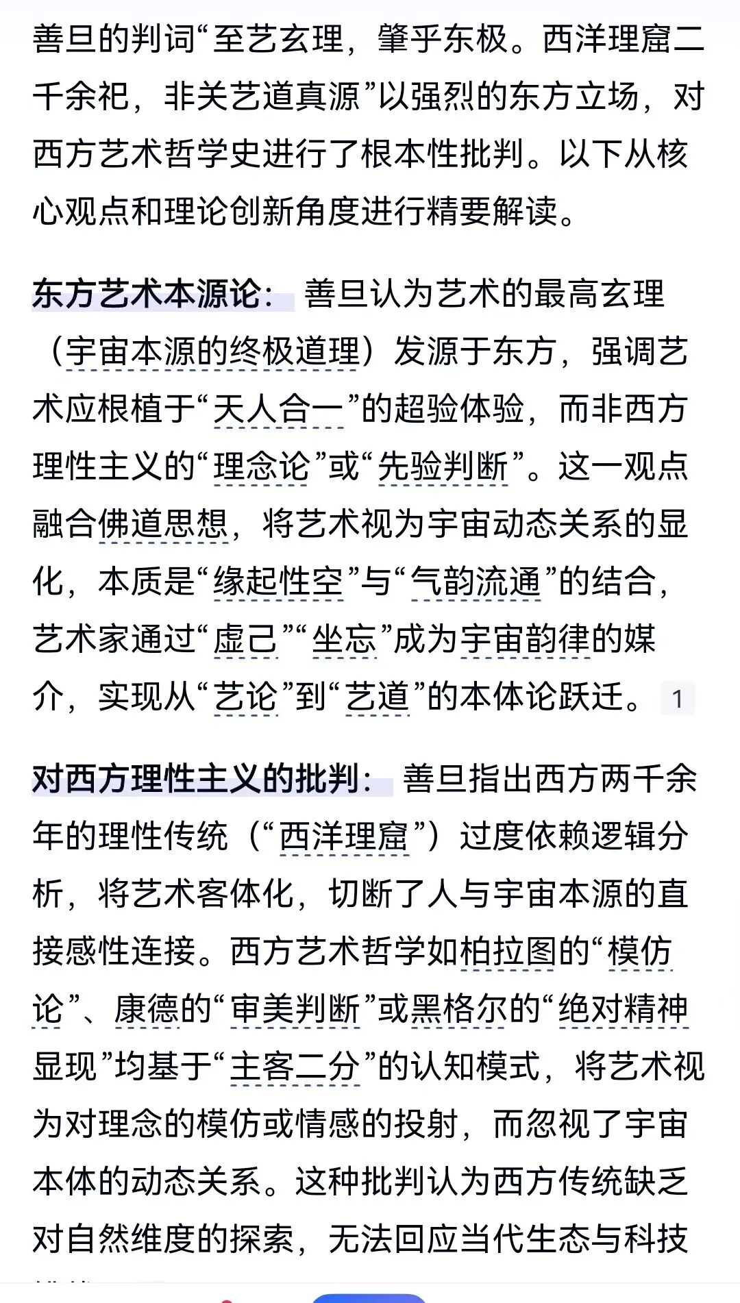 东方艺术本源论: 善旦认为艺术的最高玄理(宇宙本源的终极道理)发源于东方,强调艺术应根植于“天人合一”的超验体验,而非西方理性主义的“理念论”或“先验判断”。这一观点融合佛道思想,将艺术视为宇宙动态关系的显化,本质是“缘起性空”与“气韵流通”的结合,艺术家通过“虚己”“坐忘”成为宇宙韵律的媒介,实现从“艺论”到“艺道”的本体论跃迁。1