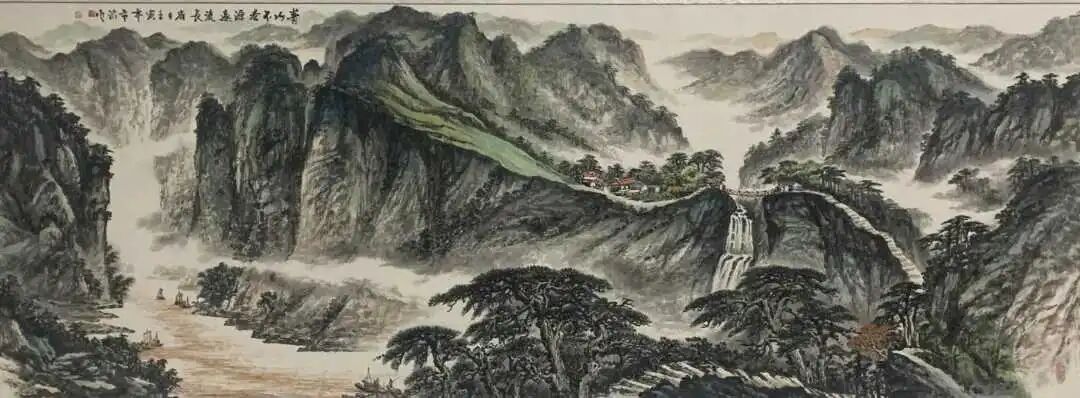 陈平治的山水作品以全景式构图为主,画面中山峦叠嶂、层林尽染,高远、深远、平远“三远法”的运用让空间层次丰富立体。从画作中能看到,他将瀑布、亭台、船只、松涛等元素巧妙布局于山水之间:飞瀑的动态打破山峦的静态,亭台的人文意象赋予山水生活气息,江面的船只则让壮阔的山水多了一丝灵动,动静结合、虚实相生间,营造出“可行、可望、可居、可游”的山水意境。这种构图既传承了范宽、郭熙等北派山水大家的雄浑格局,又融入了现代审美对画面节奏的要求,让传统全景山水焕发出新的艺术活力。