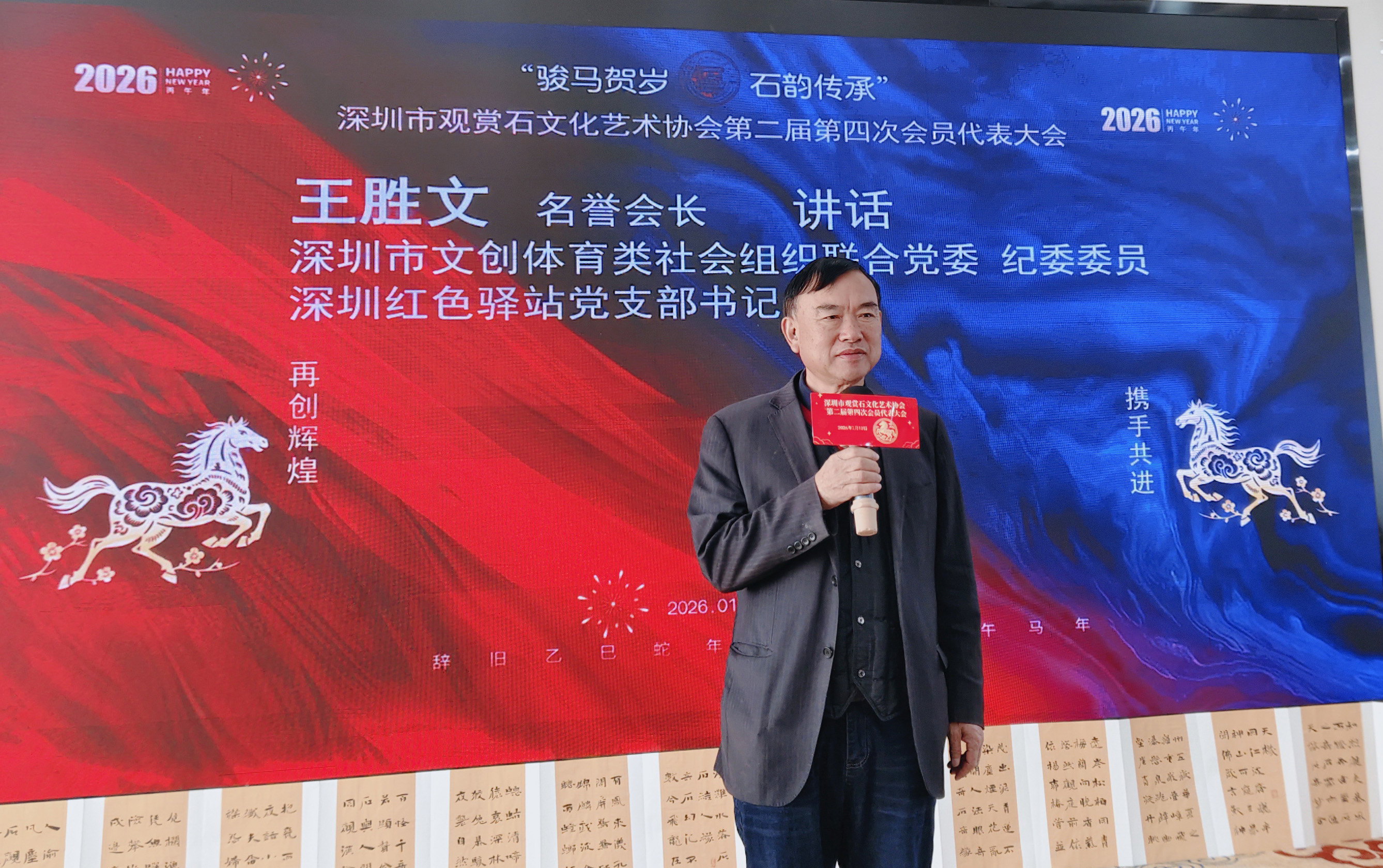 深圳市文创体育类社会组织联合党委纪委委员、深圳红色驿站党支部书记、协会名誉会长王胜文发表讲话。他结合自身退役军人的责任担当与红色驿站的党建经验,强调社会组织应始终坚守党建引领的政治方向,将党的工作融入发展全过程 。他寄语协会以马年昂扬奋进的精神,传承“拓荒牛”精神,在文化自信的时代浪潮中,让赏石文化与红色基因相融共生,为深圳文化强市建设注入更多正能量。