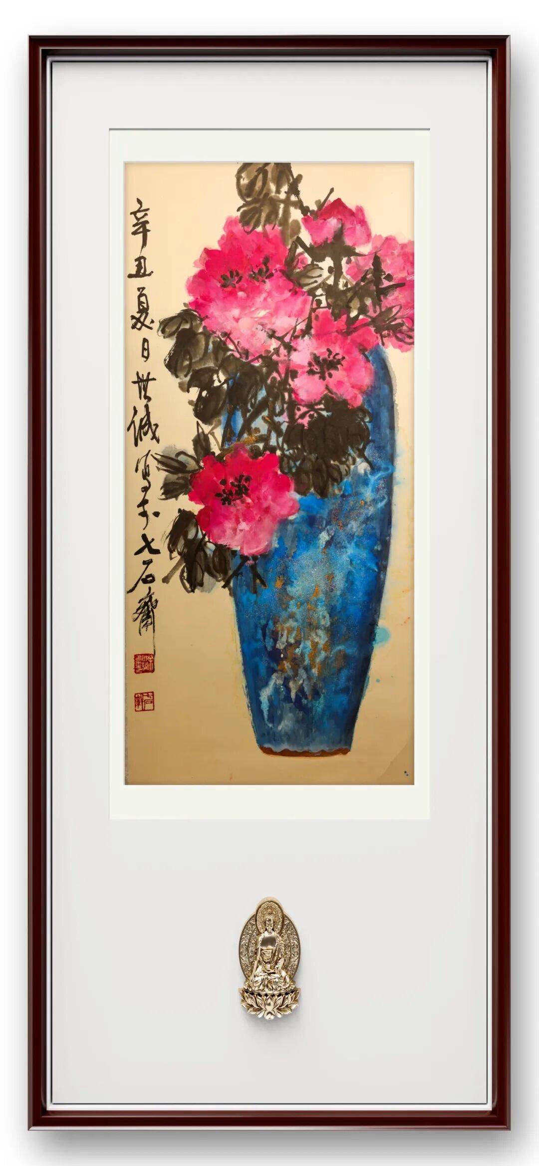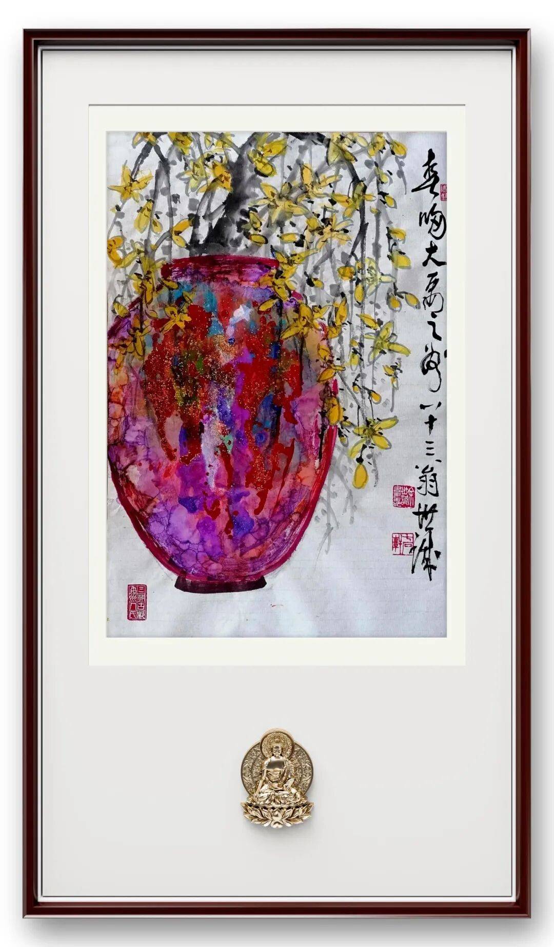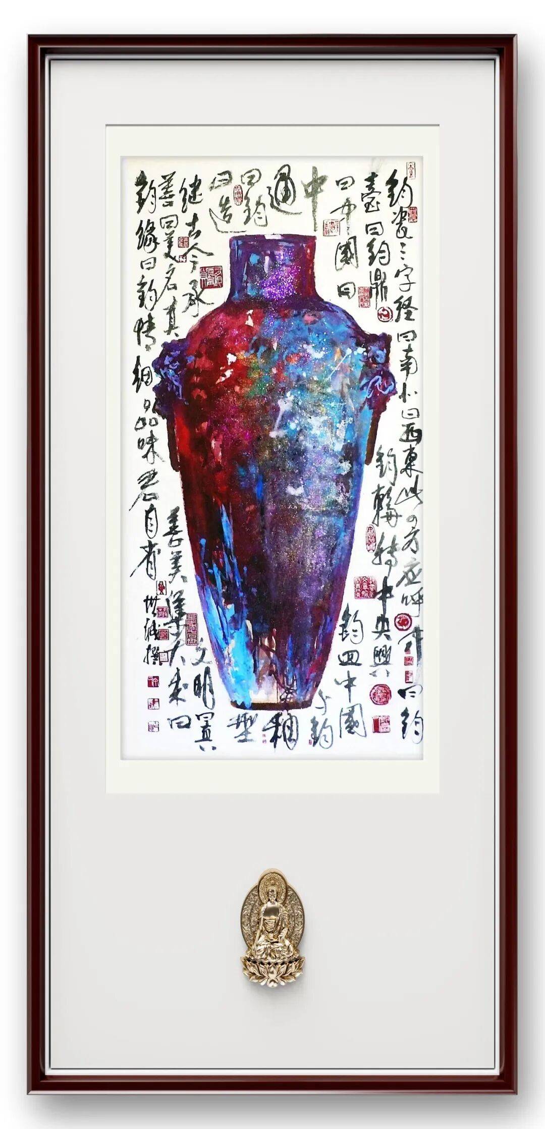 第四,钧画的双重属性。机制的移植,使钧画既可以是具象画,又可以是抽象画。当钧画任意组合的色斑色块用笔墨造型为花瓶、瓷盘、瓷壶等钧瓷物件的时候,它是具象画。与一般清供画有所不同的是,钧画不会出现“重花轻器”的现象,而是呈现花器并重或器(钧瓷物件)主花辅的画面。当钧画的色彩组合画面,从瓶、盘等具体钧瓷器皿上剥离出来,抽象出来,成为独立的色彩组合画面时,它就成为不再表现自然物的抽象画。这时色斑与色块任意组合的画面便进入到了”无题” 境界,成为 中国画大写意抽象艺术画,它给予创作者提供了更多的自由度和更广阔地创作空间。正如画家本人所说:“画钧原本没有法,咋美咱就咋着画。搜尽民间好颜色,怼来怼去自升华。” 它给予观赏者提供了广阔地自由想象的空间。