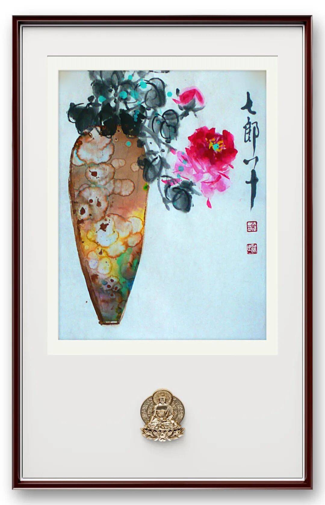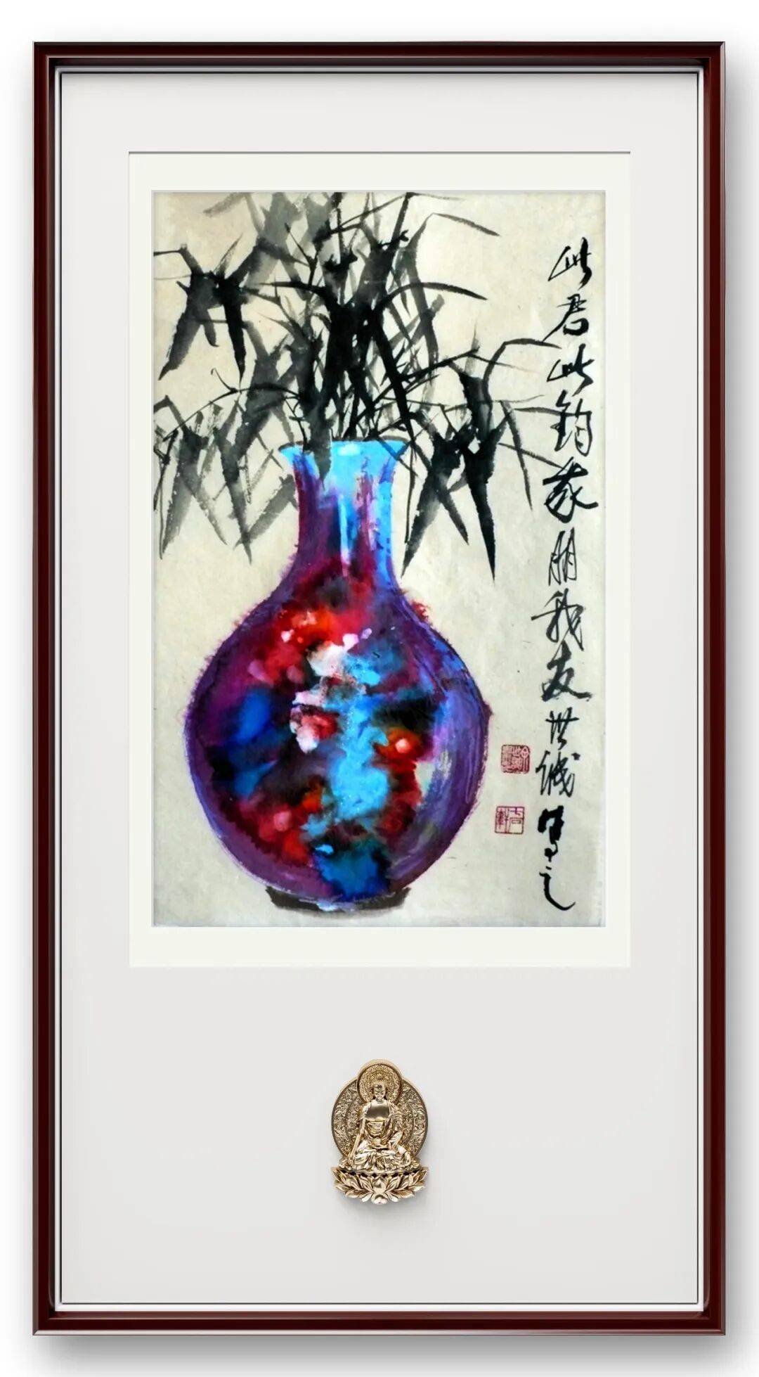 一是看丹青色彩。钧瓷的釉色乃钧瓷之魂。余教授探索钧瓷画的主攻方向也在于此。他大胆选用和调制了特殊的颜料,对宣纸亦作了特殊处理,以重彩大写意的手法进行挥洒,如同钧釉在烈火中窑变那样,使各色颜料在水墨中自然渗合,相机成画。色彩厚重,艳而不妖,且具流动感。从他的作品中,我们惊喜地看到火的艺术在宣纸上又升华为水的艺术,真是妙不可言。