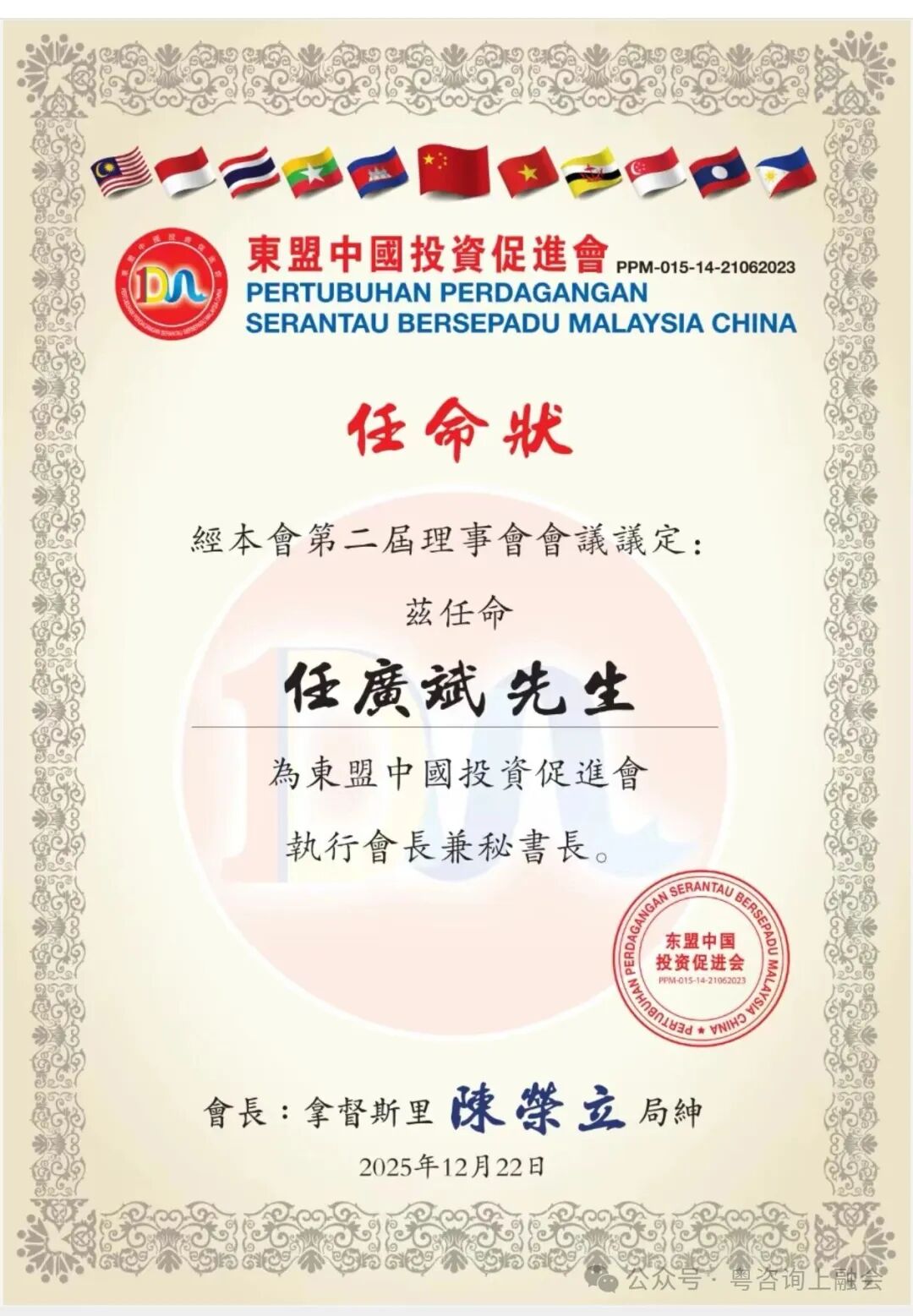 2025年底,经东盟中国投资促进会第二届理事会研究通过,促进会主席拿督斯里陈荣立局绅批准,即日生效:任广斌先生正式出任东盟中国投资促进会执行会长兼秘书长。