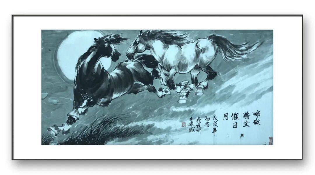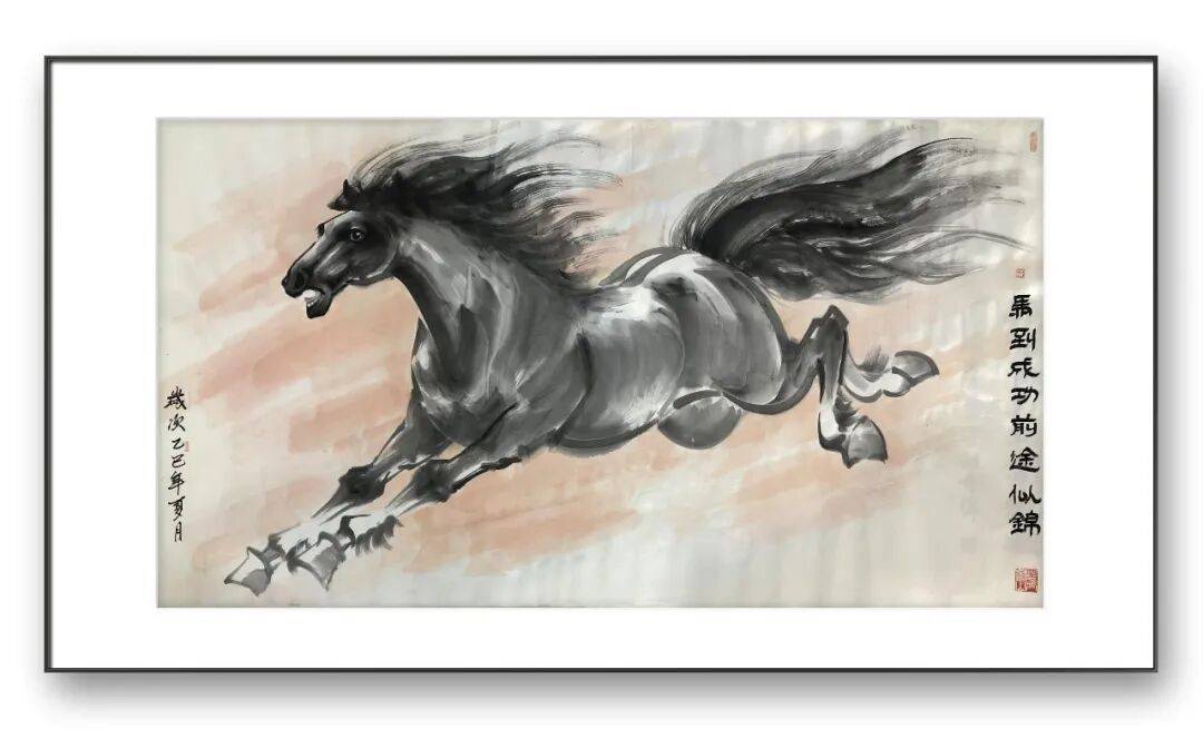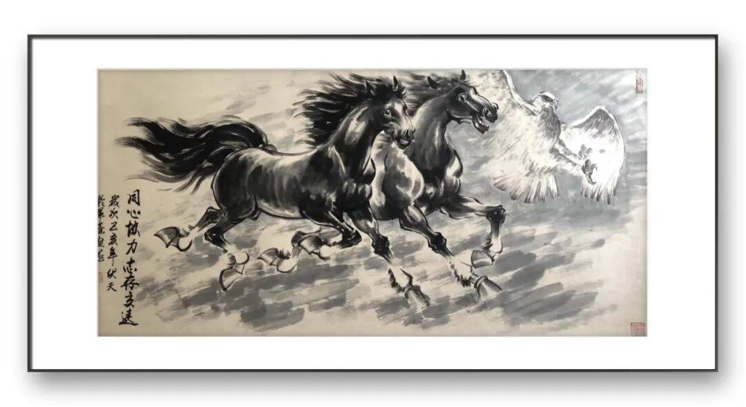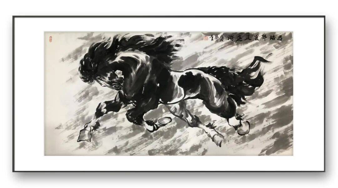 构图的多变巧思与空间意境的营造,是胡奇伟马画另一大艺术亮点,彰显其超越单一题材创作的综合素养。作为花鸟、山水、人物兼修的艺术家,他将山水构图的留白智慧、花鸟构图的虚实对比,巧妙融入马画创作之中,打破了传统马画多以“单马或群马为绝对主体、背景简单点缀”的程式化布局,实现了“人马相融、景情相生”的空间营造。他深谙“计白当黑”的审美之道,善于通过留白为作品赋予想象空间,而非将画面填实。
