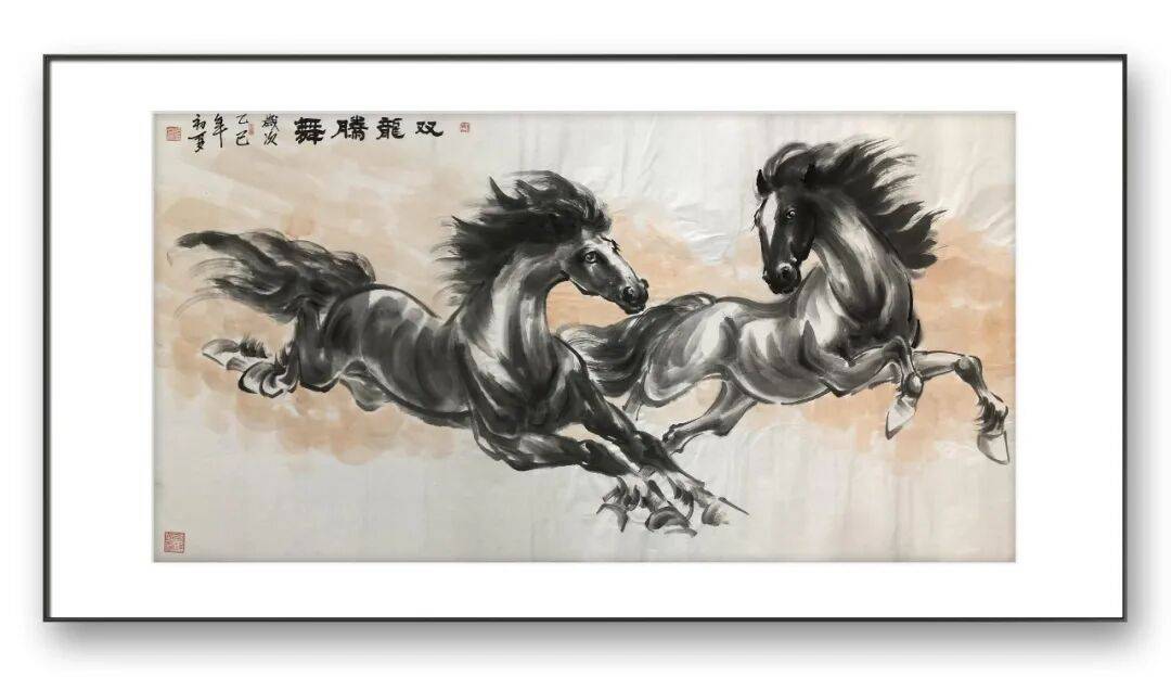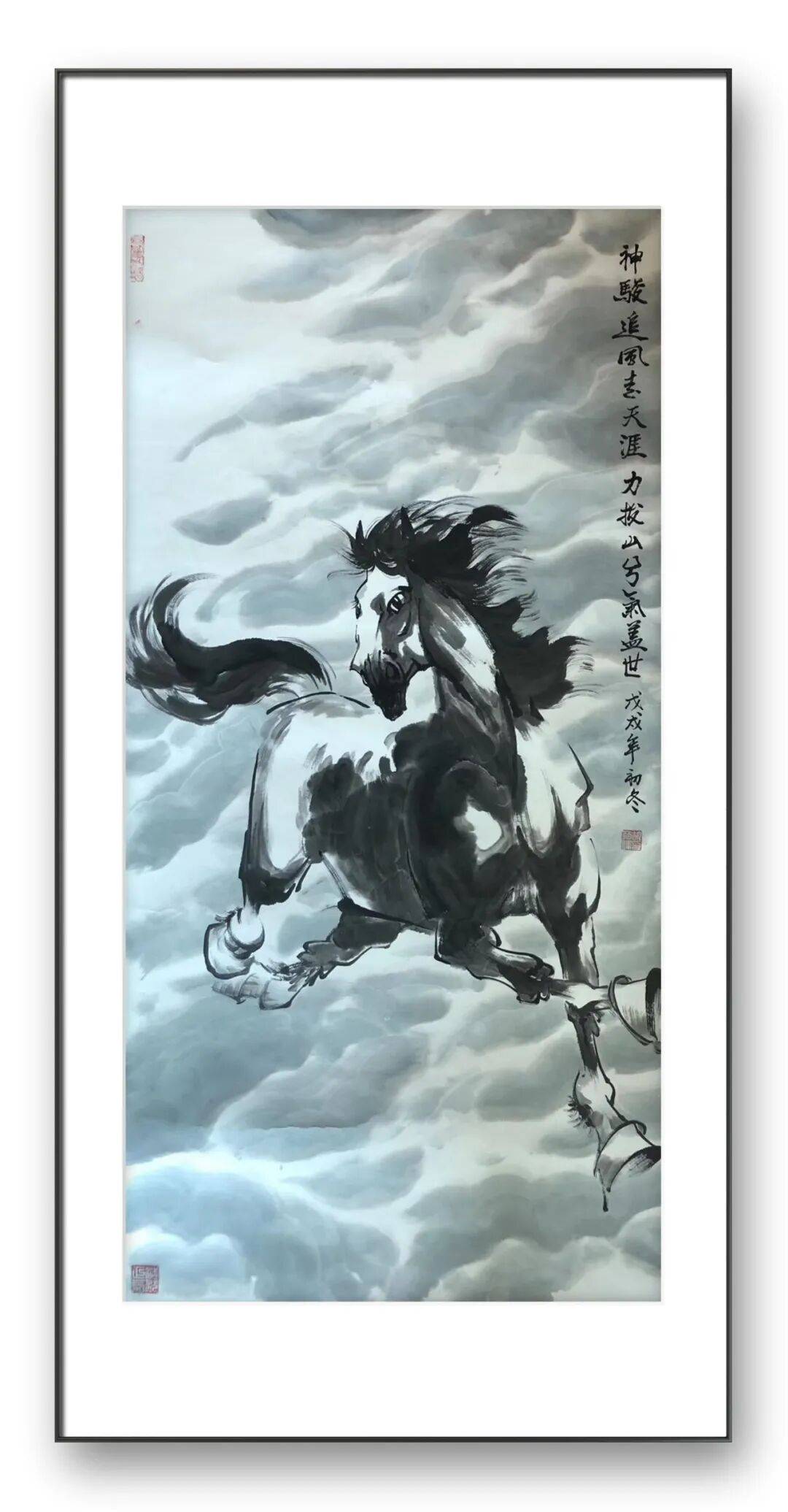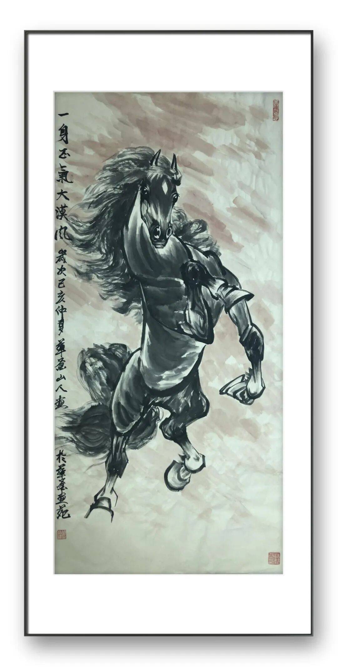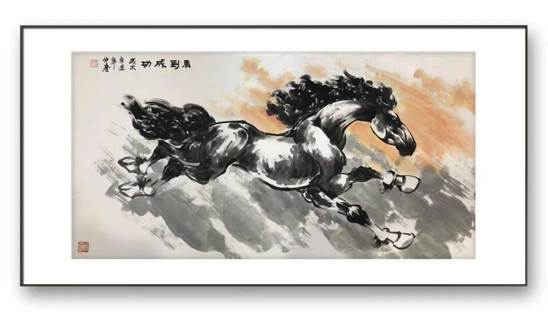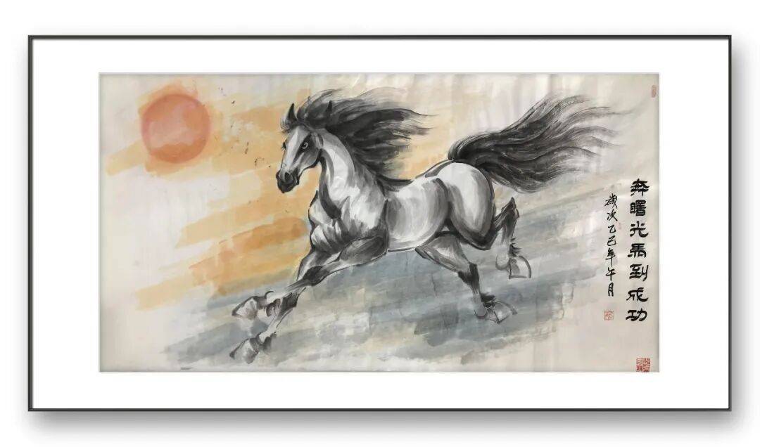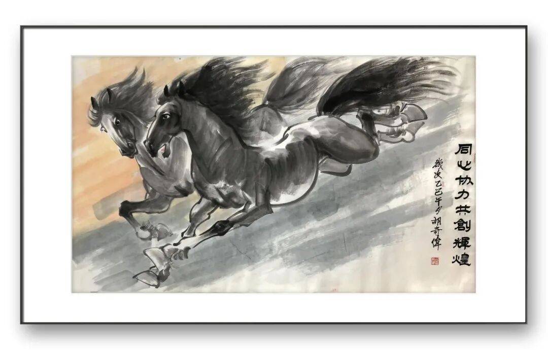 作为兼攻花鸟、山水、人物的艺术家,胡奇伟的综合素养为其马画创作提供了深厚支撑。花鸟创作的细腻笔触,让他对马匹的毛发、肌理刻画更为精准;山水创作的意境营造能力,让他的马画背景更富诗意与空间感;人物创作对神态、情感的捕捉技巧,让他笔下的马匹更具精神气质与人格化特质。这种跨题材的艺术滋养,让他的马画不仅是单一走兽题材的创作,更成为集笔墨技巧、意境营造、精神表达于一体的综合艺术作品,彰显出当代艺术家的全面素养与广阔视野。