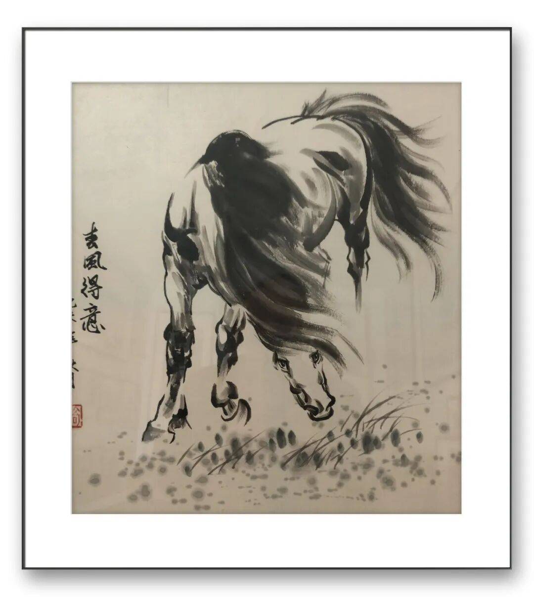 更为难得的是,胡奇伟在工笔立形的基础上,以写意笔墨为作品注入灵魂,让马匹摆脱了“静物式”的刻画,尽显灵动奔放的生命力。他的写意表达,并非孤立于工笔之外,而是渗透在笔墨的每一处细节之中:在马匹的鬃毛与尾巴处理上,打破工笔的精细勾勒,以泼墨、破墨之法挥毫,笔墨酣畅淋漓,或浓或淡、或干或湿,既有“飞流直下”的洒脱,又有“随风轻扬”的灵动,如一幅马画中,骏马扬鬃奋蹄,鬃毛以干笔飞白挥写,线条苍劲飘逸,与头部精细刻画的工笔形成鲜明对比,刚柔相济间,尽显马匹奔腾时的磅礴气势;在马匹的躯干肌理处,以淡墨写意渲染,而非工笔的层层填色,通过墨色的浓淡变化,凸显肌肉的起伏与力量感,让线条与墨色相互渗透,既保留了工笔的精准,又兼具写意的气韵。这种“工中带写、写中见工”的技法融合,让胡奇伟的马画既不同于纯工笔的刻板,亦有别于纯写意的空泛,形成“形准而神足、细腻而奔放”的独特质感,使每一匹马都既有可触摸的真实体态,又有可感知的精神气度。