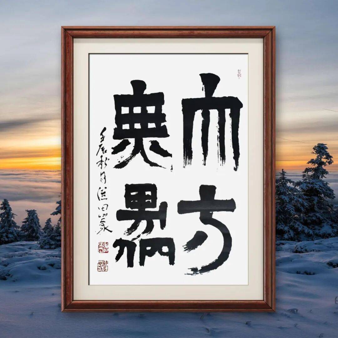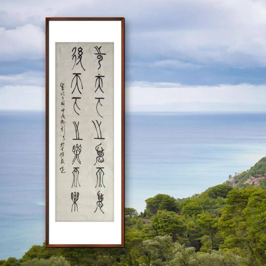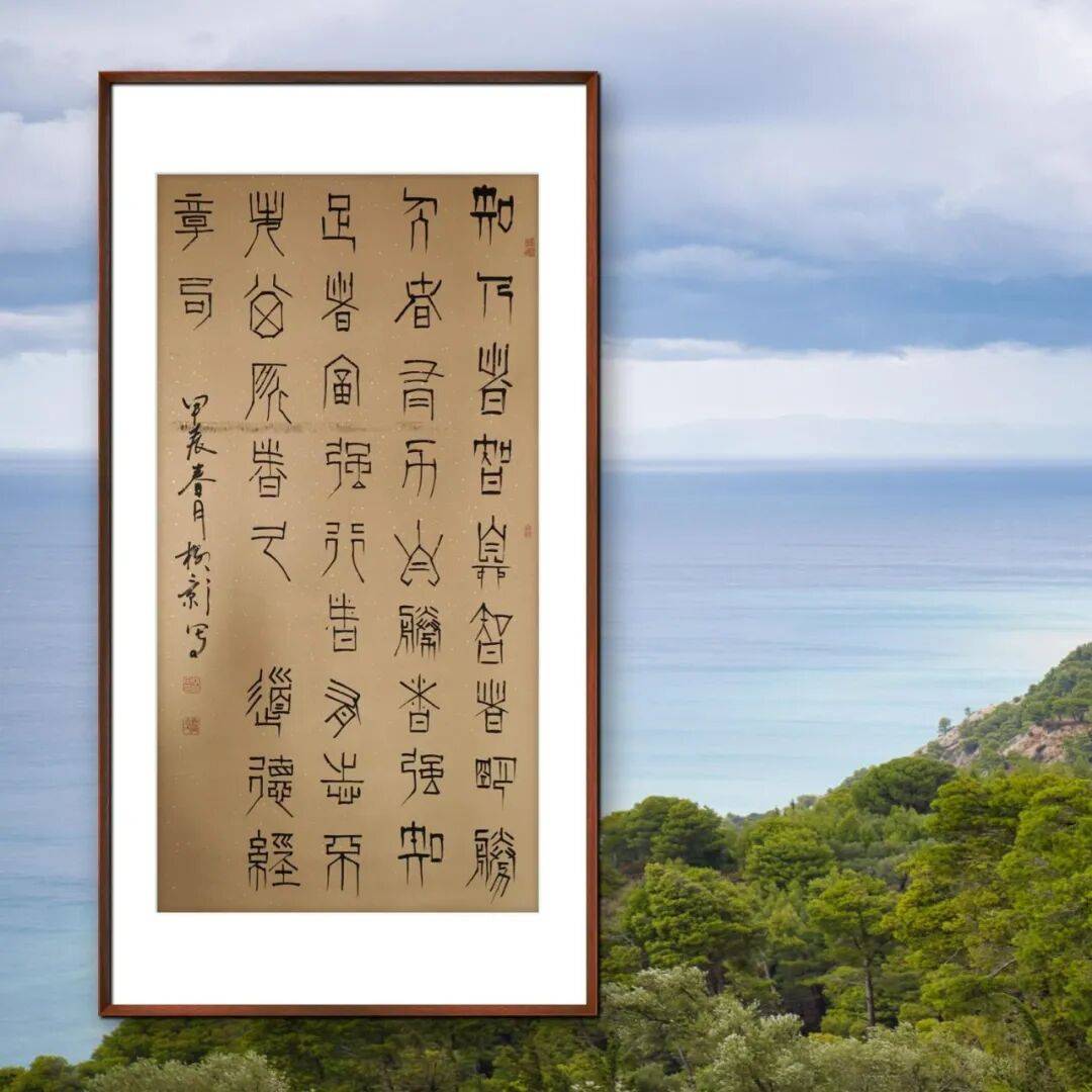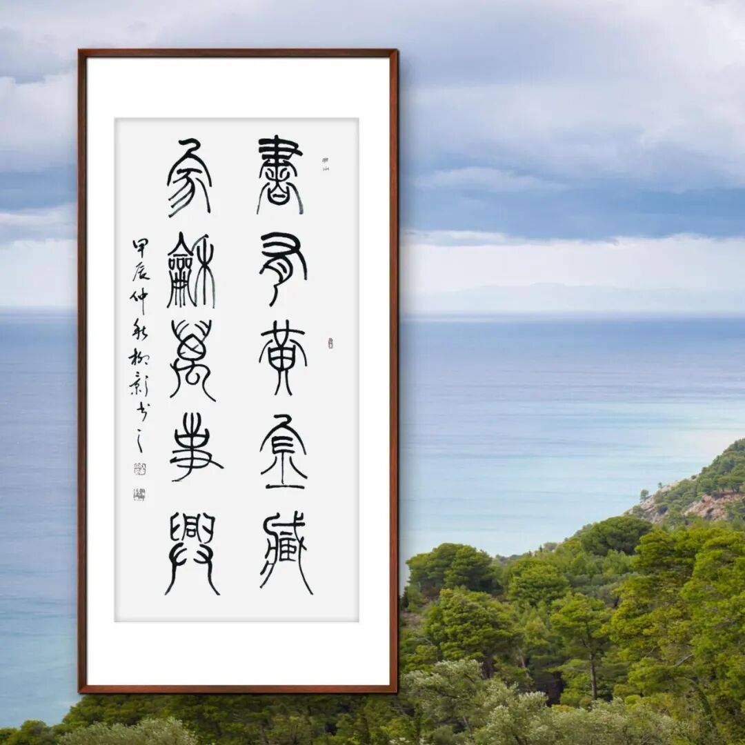 在书法创作中,他以篆书为核心载体,取法《泰山刻石》的正大气象立骨,参《峄山碑》的典雅圆活润笔,兼融《碧落碑》的灵动意趣,实现了“先临其形,后察其神,临其神而忘其形”的升华。其篆书线条饱满圆厚、刚柔相济,直画如剑立千仞,曲笔似藤绕古木,点画如危峰坠石,打破了传统篆书易显刻板的局限,赋予静态文字“跃、腾、奔、卧”的人格姿态。尤为动人的是,他将中锋行笔的掌控推向极致,转笔处逸转而过,无俗笔的滞涩之感,让古文字在笔墨间焕发鲜活生命力。