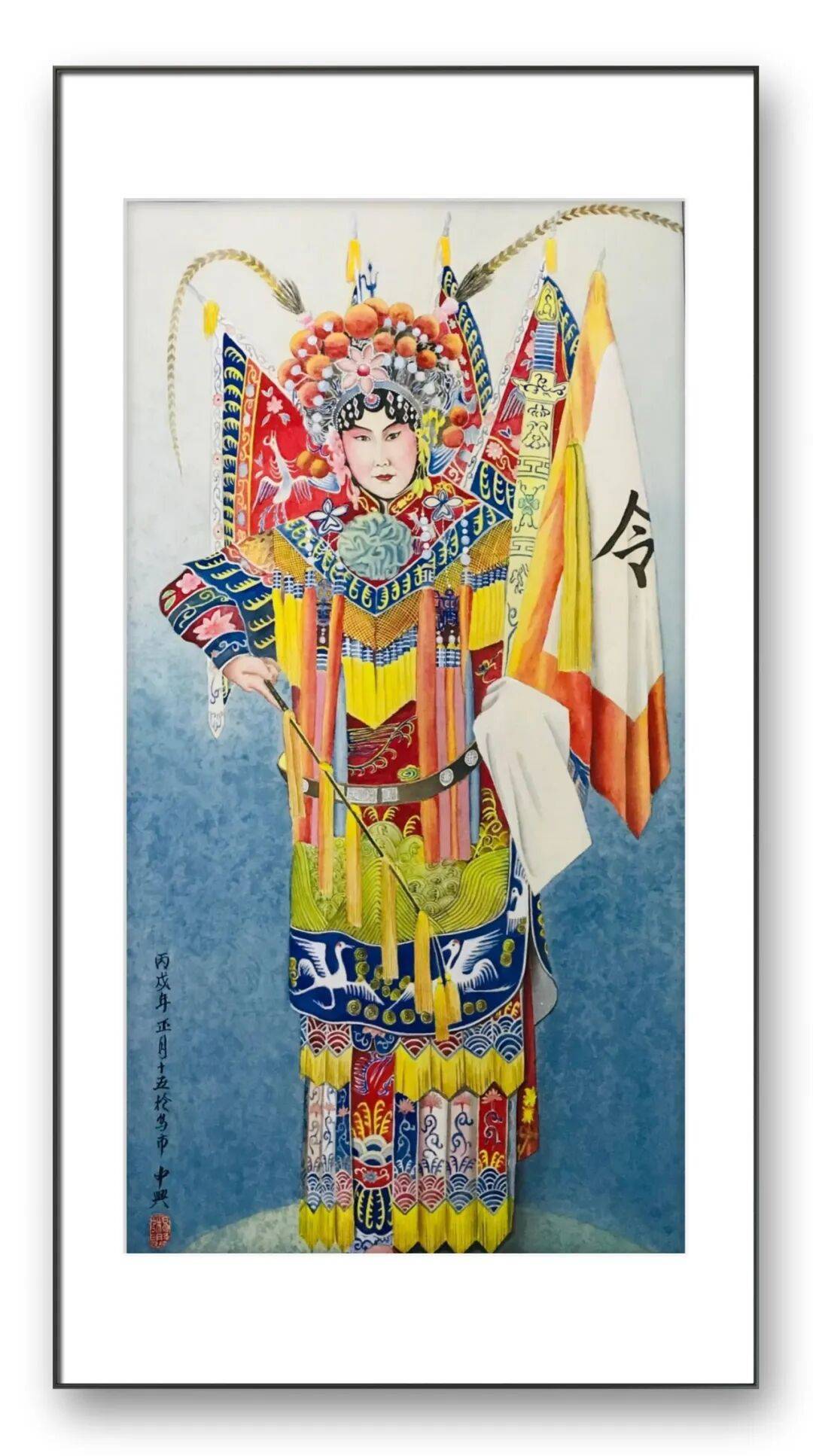 从《穆桂英挂帅》的巾帼豪情,到《霸王别姬》的英雄悲歌,杨中兴的戏曲人物画始终扎根于戏曲文化的深厚土壤,又以当代绘画语言赋予其新的生命力。他以细腻的笔触还原戏曲的程式之美,以浓烈的色彩传递舞台的情感张力,以传神的刻画彰显角色的精神内核,让观者在欣赏画作的同时,仿佛置身于梨园舞台,感受中国戏曲艺术的独特魅力。杨中兴的创作,不仅是对戏曲文化的传承与致敬,更是当代艺术家探索传统艺术现代表达的生动实践,为我们展现了戏曲人物画的无限可能。