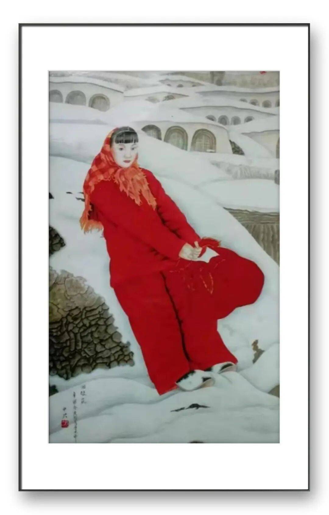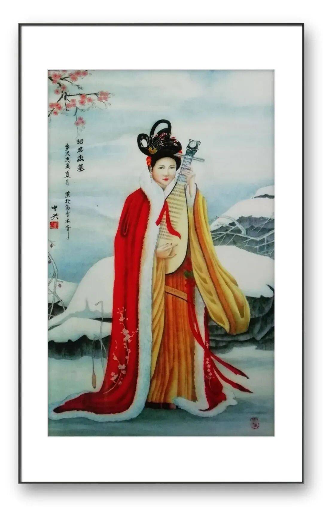 在人物面部的塑造上,杨中兴尤为注重“传神”。他以细腻的晕染表现肌肤的温润质感,通过眉眼的微妙传递人物的精神气质:班昭手持简册,目光沉静而坚定,尽显学者的睿智与从容;李清照立于菊前,神情温婉中带着淡淡的忧思,恰如其词风的婉约深沉;昭君出塞中的王昭君,身披红色斗篷,面对茫茫雪原的眼神里既有坚毅,又藏着一丝乡愁,将这位历史人物的复杂心境刻画得淋漓尽致。这种“以形写神”的手法,使他笔下的人物既有工笔的精致,又不失写意的气韵,达成了“形神兼备”的艺术境界。