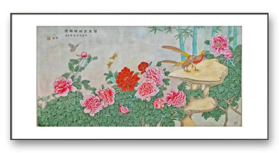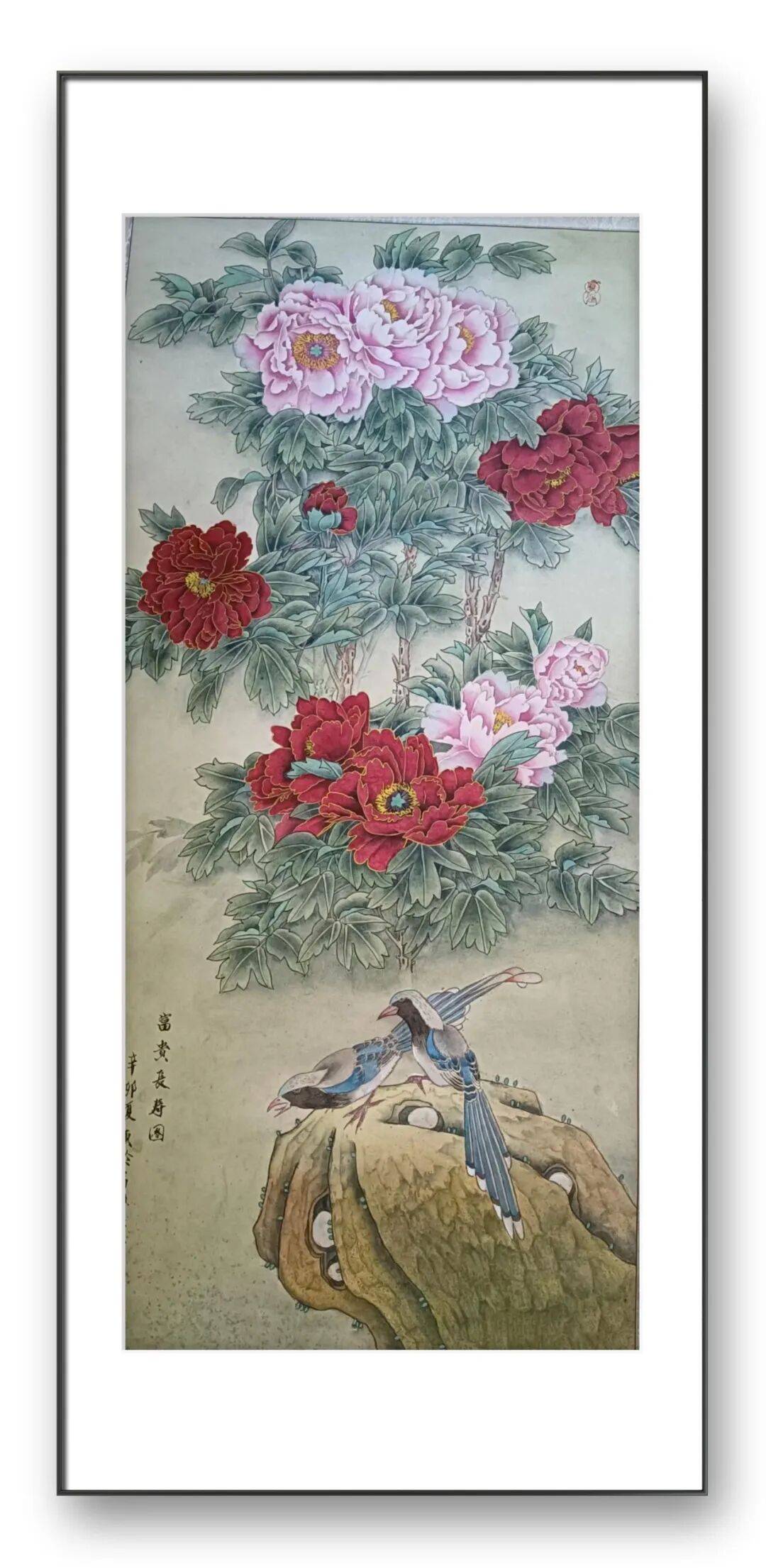 杨中兴的花鸟世界,首先是“形神兼备”的生动写照。他以毫厘必现的笔触刻画牡丹的雍容华贵:花瓣的层次晕染细腻入微,从花心的浓艳到边缘的淡粉过渡自然,叶片的脉络纹理清晰可见,仿佛能触到花瓣的柔软质感。点缀其间的喜鹊与绶带鸟,羽毛的丝毛技法运用得尤为精妙,每一根羽丝都根根分明,眼神的点染更是灵动传神,让禽鸟的姿态鲜活欲飞。这种对“形”的极致追求,不仅展现了扎实的传统功力,更让观者在细腻的视觉体验中感受到生命的本真之美。