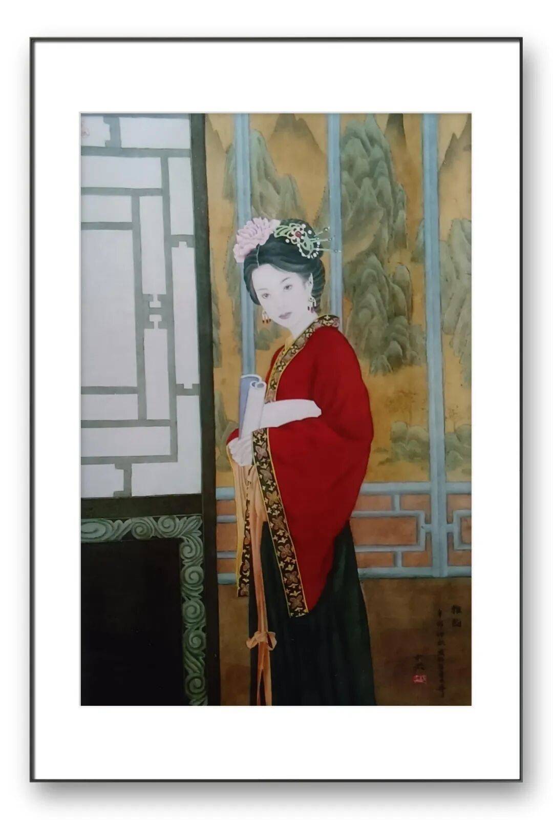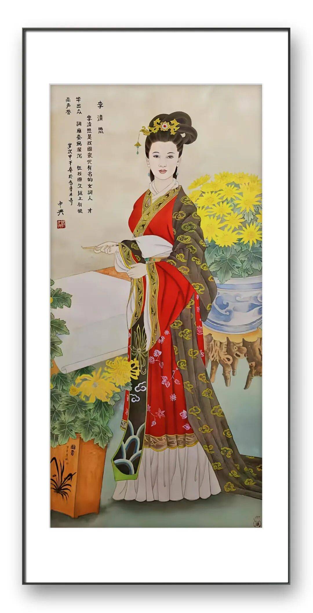 在当代工笔人物画领域,杨中兴老师以细腻的笔触、典雅的色彩与深厚的文化底蕴,构建起一个充满古典韵味与人文情怀的艺术世界。他笔下的女性形象,无论是历史名人、文学典故中的佳人,还是诗意情境中的仕女,都兼具形神之美与气韵之雅,在尺幅之间传递出中国传统文化的深邃内涵。杨中兴的工笔人物画,首先是对“形”的极致追求。历史人物作品中,他以毫厘必现的笔触刻画人物的服饰细节:班昭身着的黄蓝相间朝服,纹样繁复而层次分明,金线勾勒的云纹图案细腻入微;李清照的红黑相间裙装,衣料的褶皱与纹理通过晕染与线条的结合,呈现出丝绸的柔软质感。这种对服饰的精准还原,不仅展现了扎实的传统技法,更让观者在视觉体验中感受到历史的厚重感。