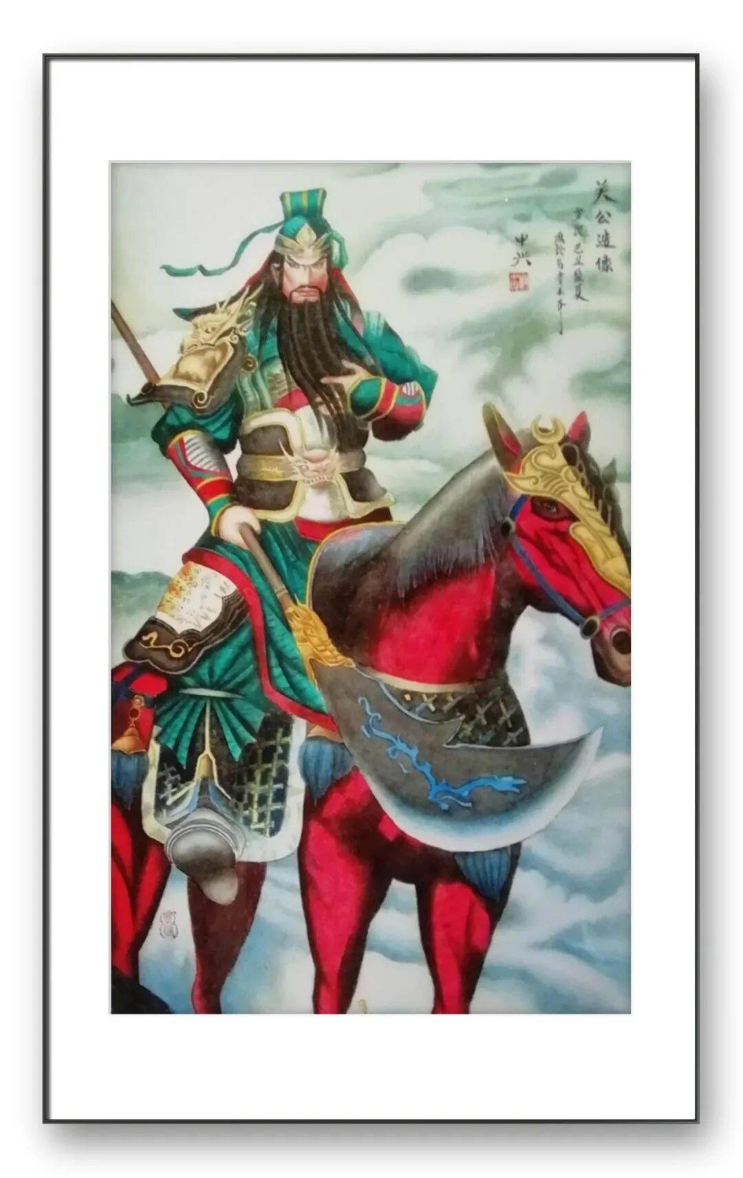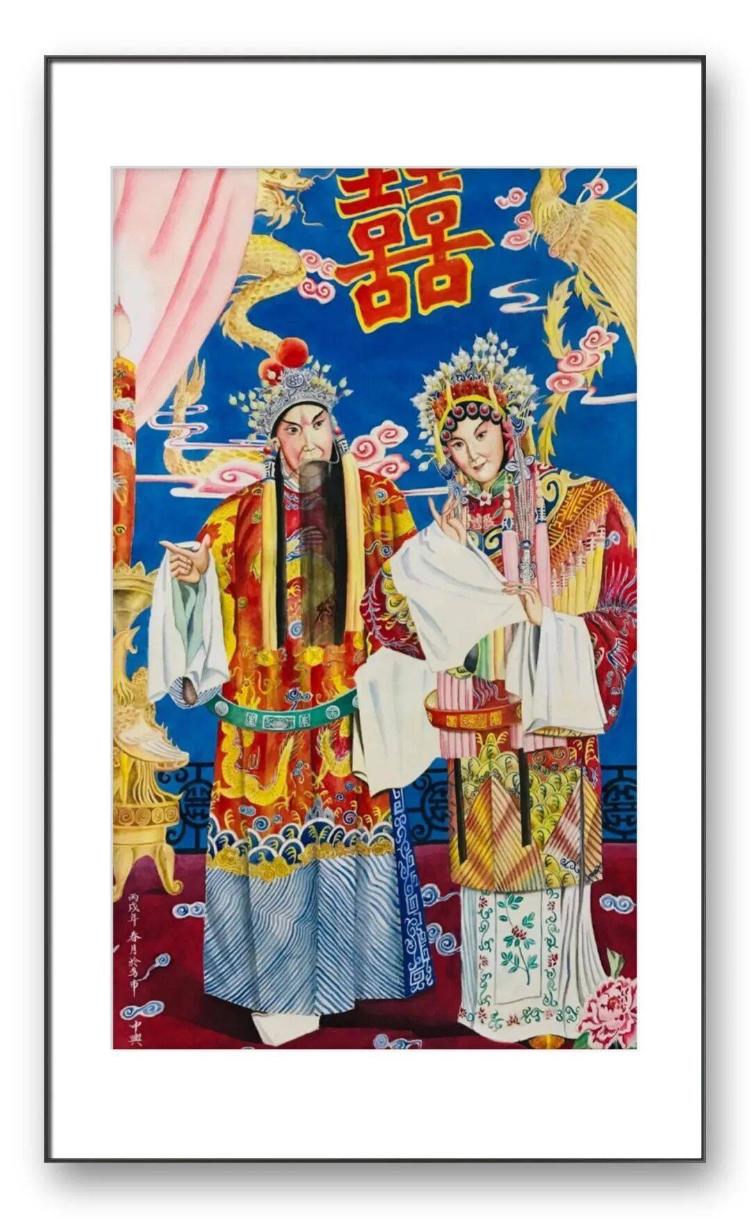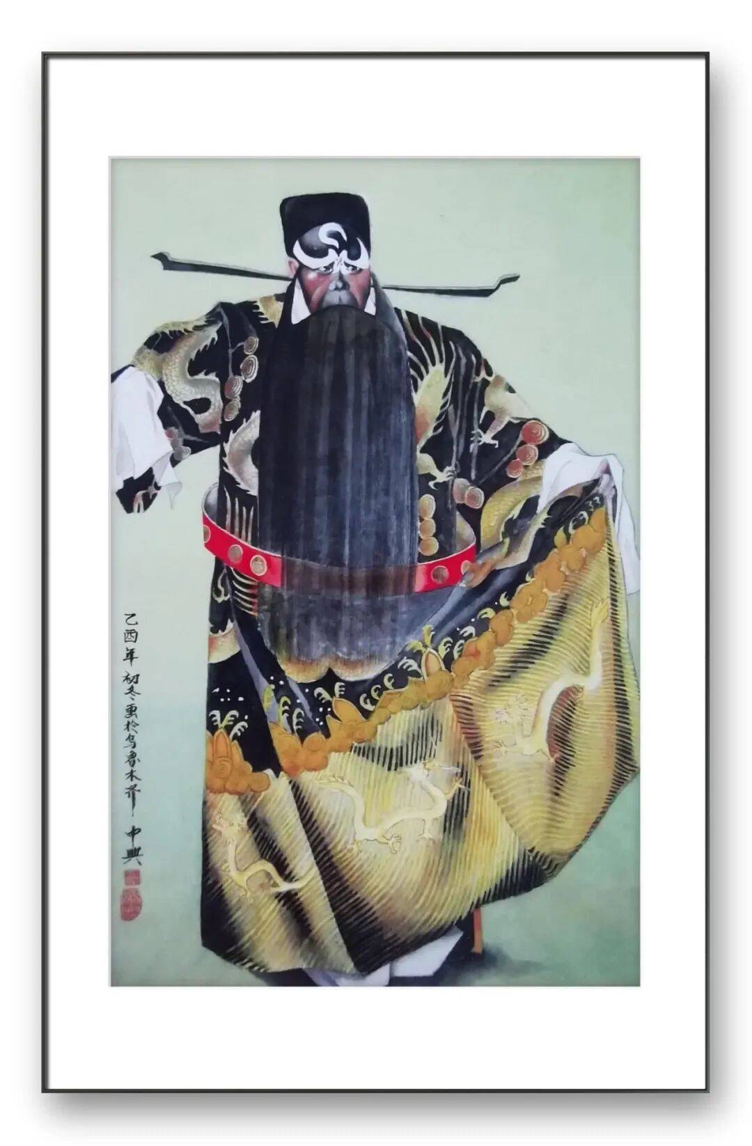 杨中兴尤为注重人物神态的传神刻画。《铡美案》中的包拯,眉头紧锁、眼神如炬,通过细微的面部肌肉线条传递出刚正不阿的凛然正气;《四郎探母》中的杨四郎,头戴王帽、身着蟒袍,眼神中的沧桑与思念被细腻的笔触定格;《关公造像》里的关羽,丹凤眼微睁、蚕眉紧蹙,既有武将的刚毅,又暗含忠义仁勇的精神气度。这种“以形写神”的手法,使他笔下的人物超越了单纯的形象复刻,成为戏曲精神的生动载体。在构图与背景处理上,杨中兴也颇具巧思。他常以简洁的背景突出人物主体,如《包拯》以浅绿底色衬托人物的浓墨重彩,《诸葛亮》以素白墙面凸显角色的儒雅沉稳;而在《龙凤呈祥》等作品中,他则通过龙凤纹样、“囍”字图案等元素营造喜庆氛围,强化戏曲故事的叙事性。这种虚实相生的构图方式,既保留了戏曲舞台的写意性,又赋予画作现代视觉的节奏感。