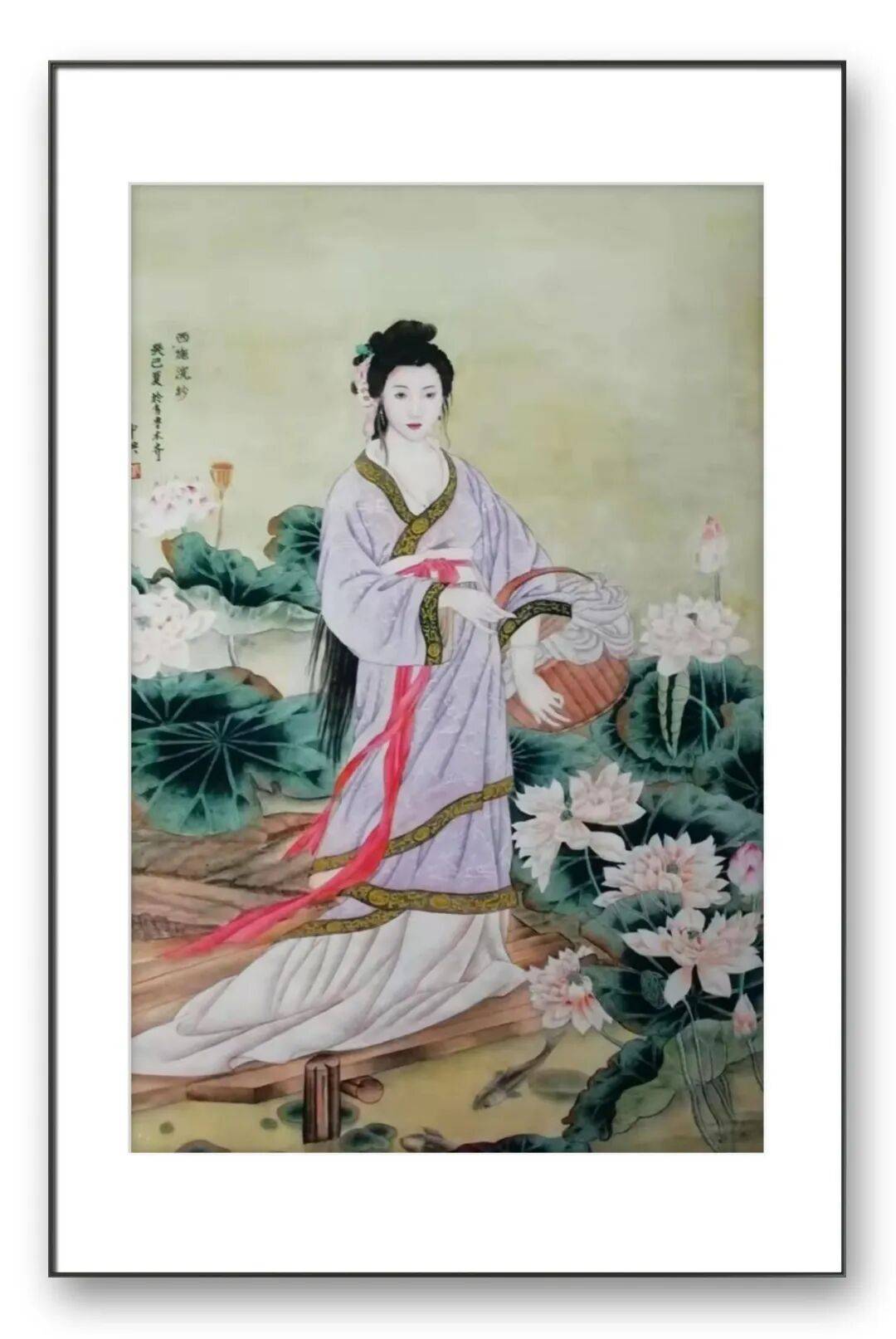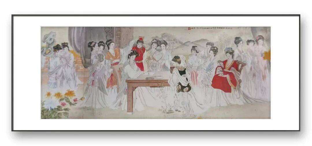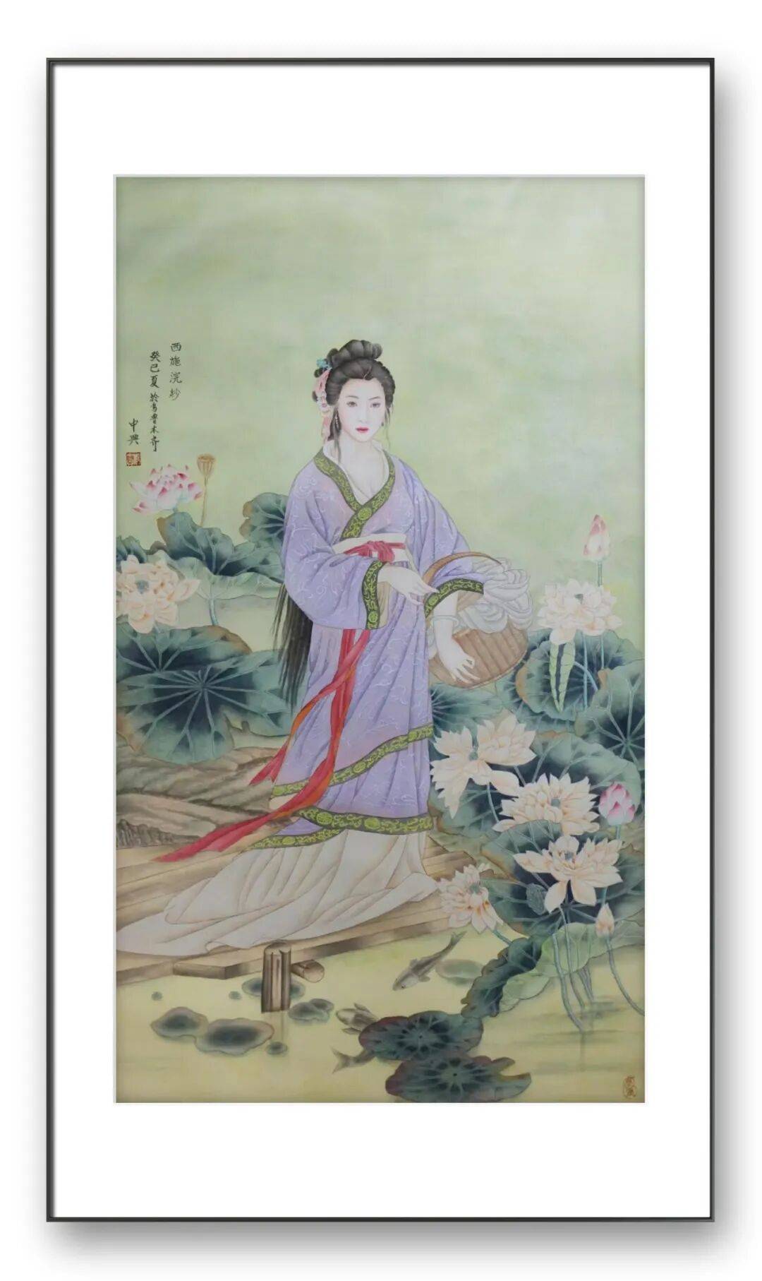 杨中兴的人物画更蕴含着深厚的文化寓意与精神内涵。他常以历史女性、文学典故为题材,借画传情、以画载道。西施浣纱通过西施在荷塘边的温婉形象,传递出“沉鱼落雁”的古典审美;雅韵中的仕女手持书卷,立于窗前,展现出古代女性的才情与雅致;长卷红楼群芳图则将红楼梦中的女性群像汇聚一堂,通过人物的姿态与神情,演绎出大观园中的悲欢离合。这些作品不仅是对古典文化的致敬,更通过当代视角的解读,赋予传统题材新的生命力。