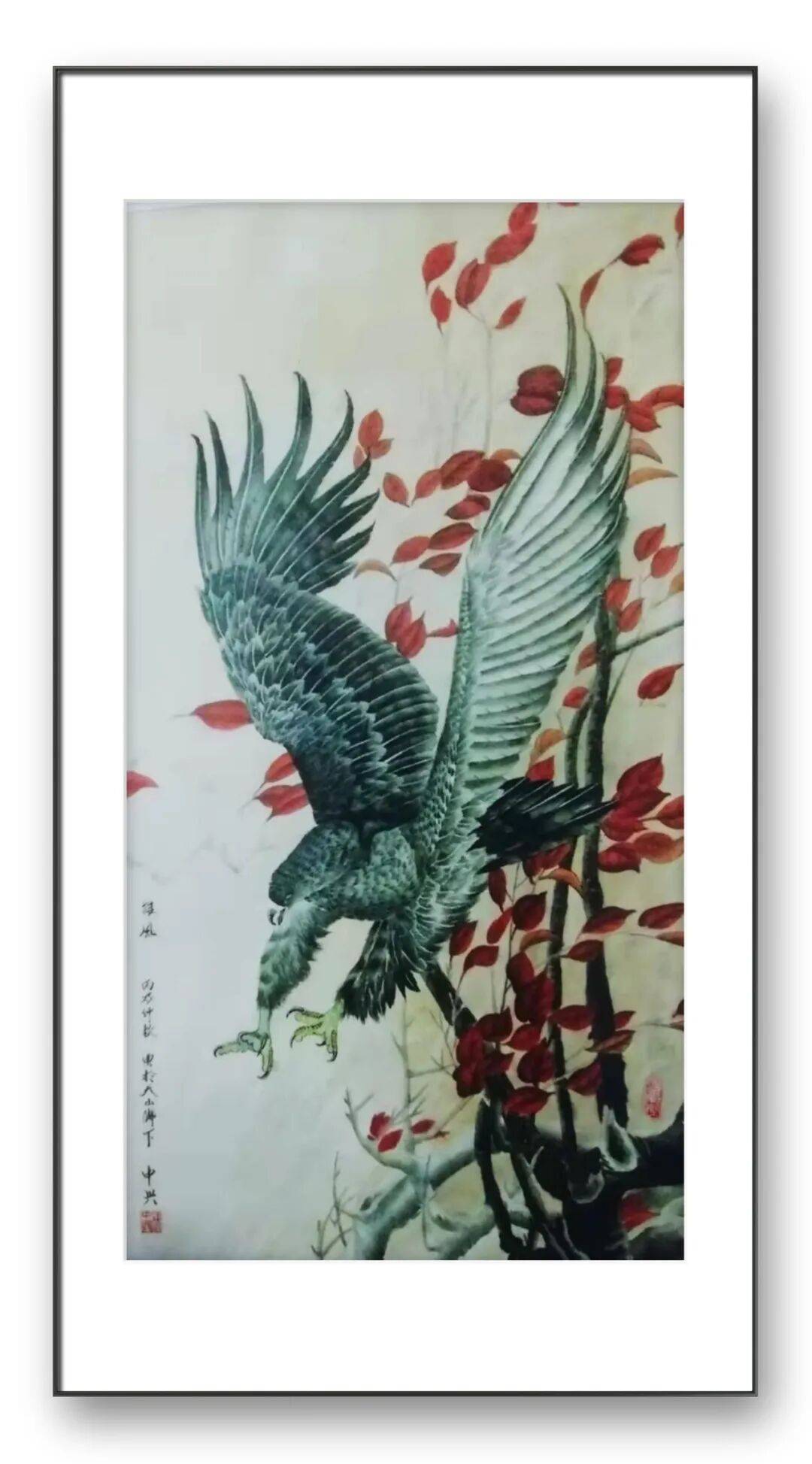 而在雄鹰系列作品中,杨中兴则展现出“写意传神”的雄浑气魄。苍鹰振翅俯冲,翅膀的墨色从浓到淡层次丰富,羽毛的蓬松感与力量感兼具,黄色的利爪如钢钩般锐利,传递出鹰击长空的磅礴气势。雄风中的雄鹰在红叶间展翅,墨色的浓淡干湿与红叶的明艳形成强烈对比,翅膀的线条既有工笔的精准,又有写意的洒脱,将雄鹰的刚毅与灵动完美融合。这种“工写结合”的手法,使他的作品既有工笔的精致,又不失写意的气韵,达成了“以形写神”的艺术境界。