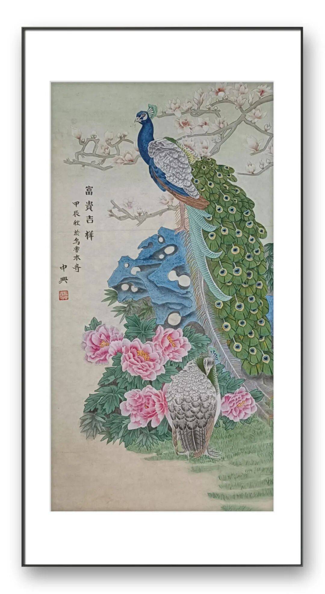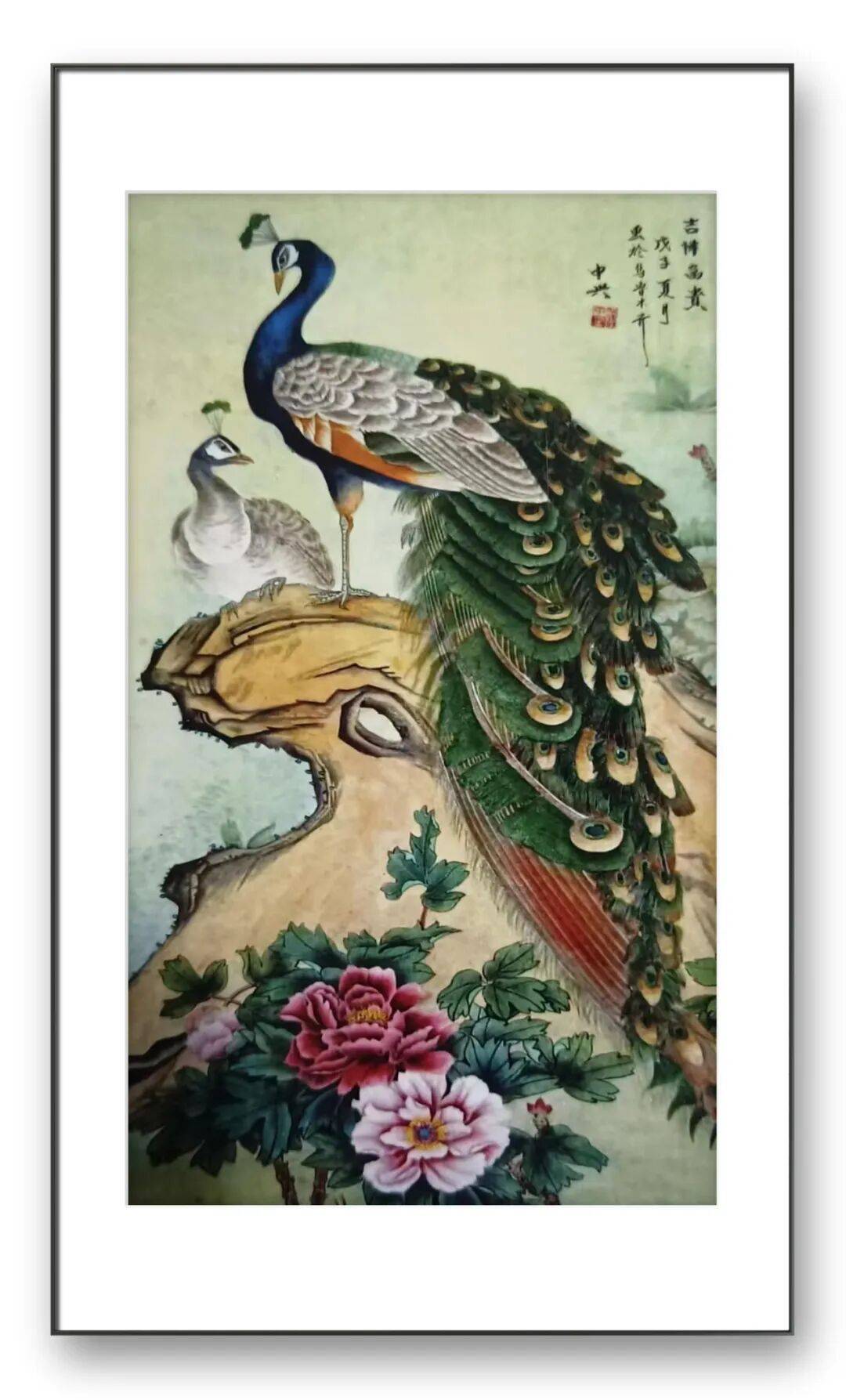 杨中兴的花鸟画,更蕴含着深厚的文化寓意与精神内涵。他常以牡丹、孔雀、雄鹰等题材入画,借物抒情、托物言志。牡丹象征富贵吉祥,孔雀寓意幸福美满,雄鹰代表刚毅进取,这些传统意象在他的笔下被赋予了新的时代精神。