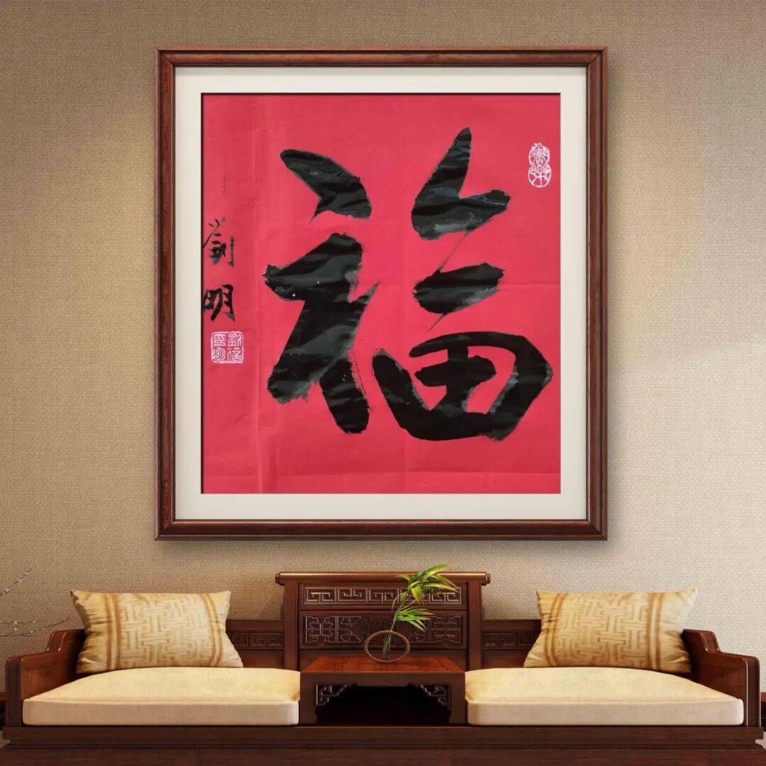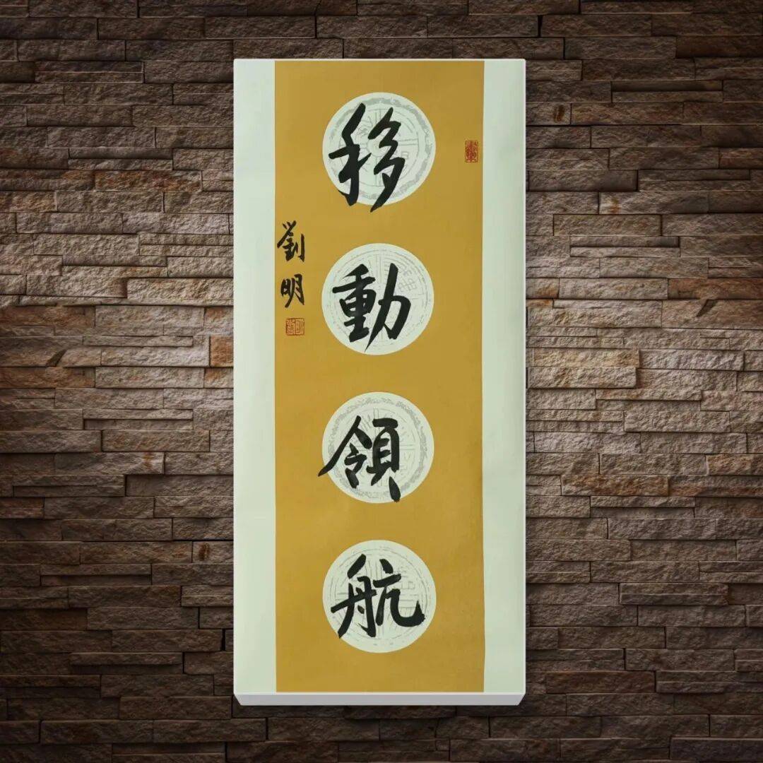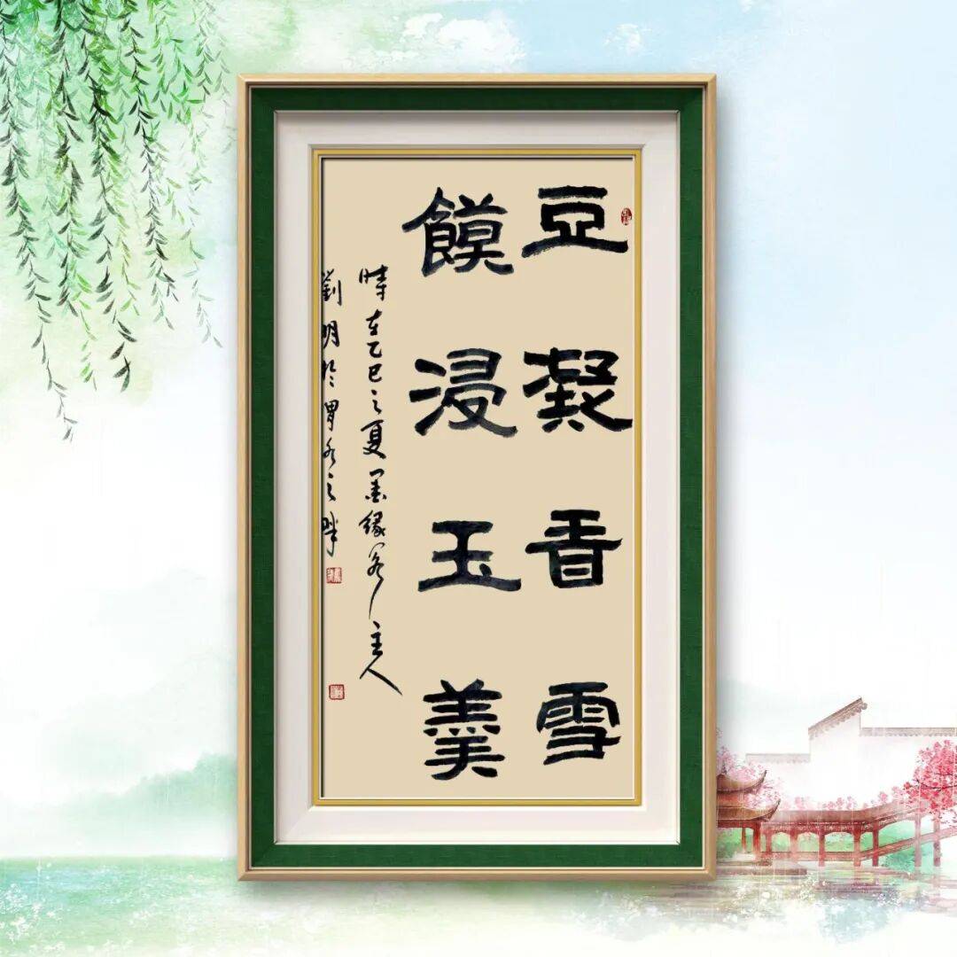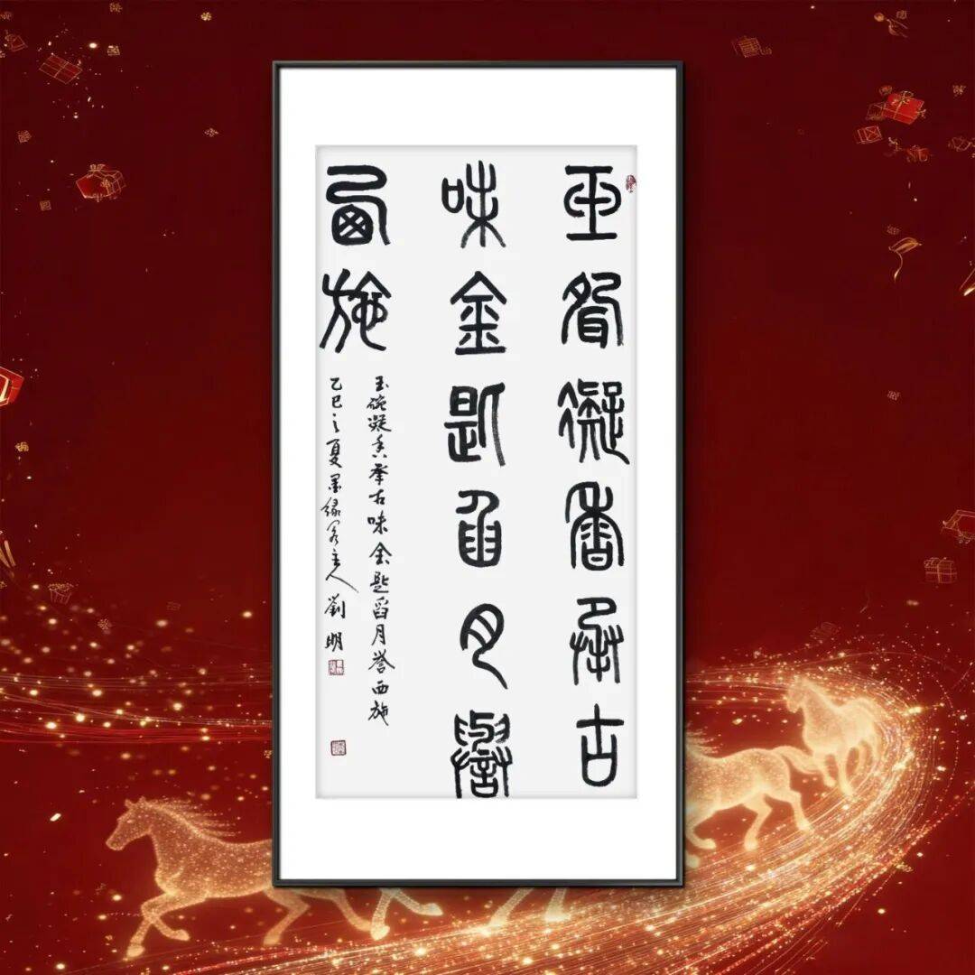 章法布局的匠心独运,赋予了刘明老师作品整体的和谐之美与生命气息。一幅佳作,章法为要,需“疏密有致,错落相生,气息贯通,血脉相连”。刘明老师的作品,无论尺幅大小,都注重整体气势与局部呼应的统一。行草书作品中,字群组合如星斗悬天,行距字距安排恰到好处,时而密不透风,时而疏可走马,在变化中求统一,在统一中见奇趣。视线随笔墨流转,时紧时慢,时张时弛,被作品独特的“气场”所笼罩,仿佛能窥见他挥毫泼墨时的激情与从容。篆书作品则章法端庄,对称之中暗含虚实变化,“计白当黑”的理念贯穿始终,空白处与笔墨处相互映衬,营造出虚静空灵的艺术意境。落款钤印的位置精心考量,与正文相得益彰,共同构成完整的视觉体系,彰显出“增之一分则太长,减之一分则太短”的和谐之美。