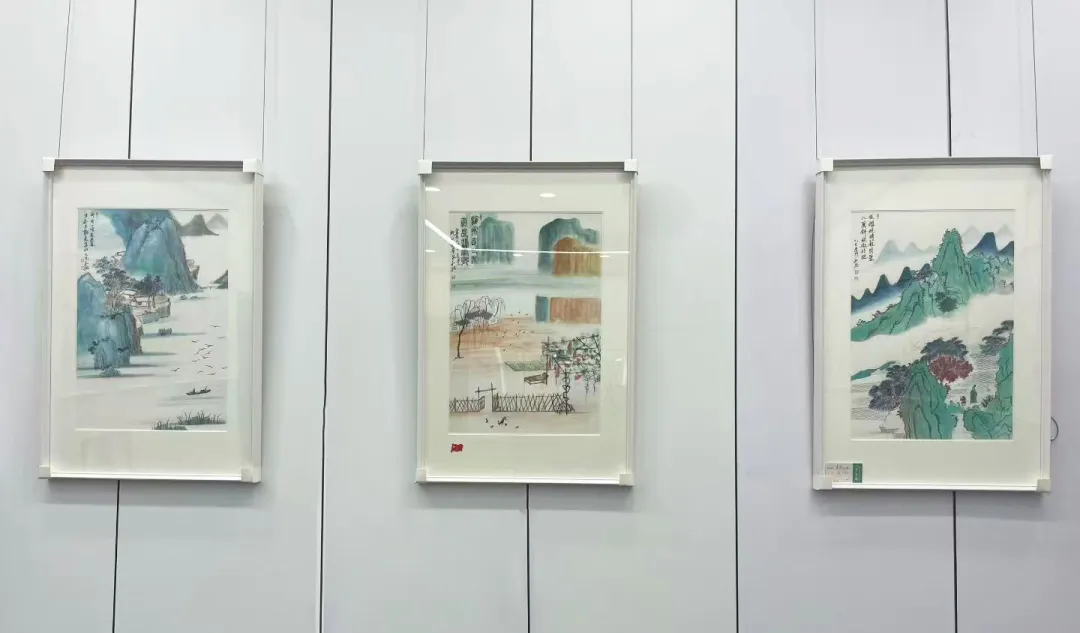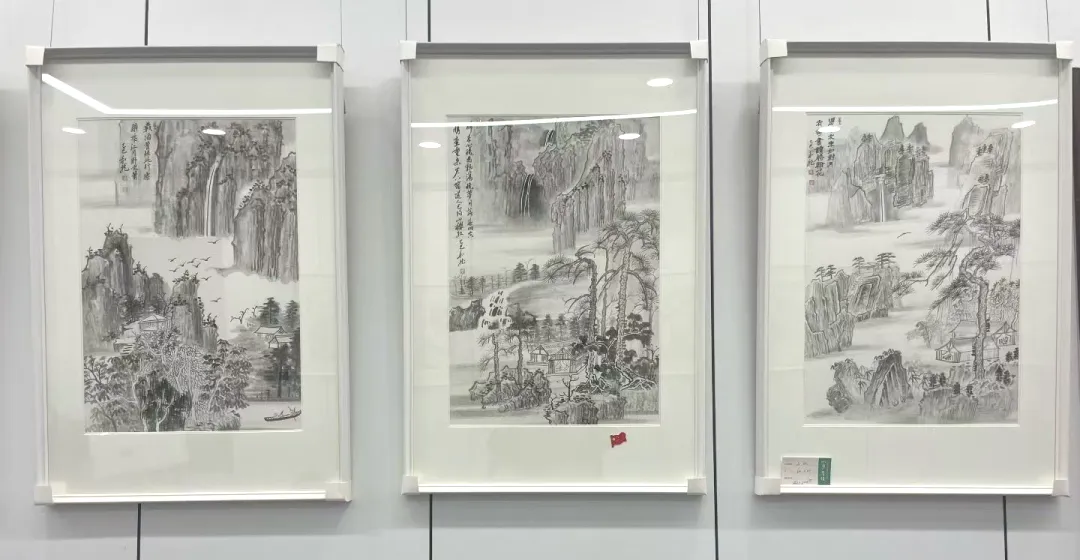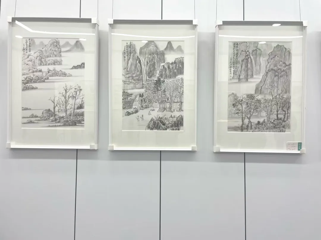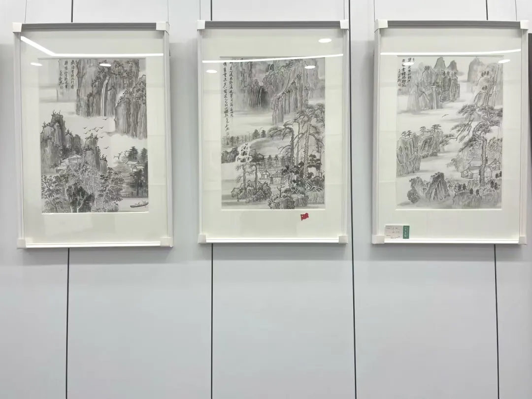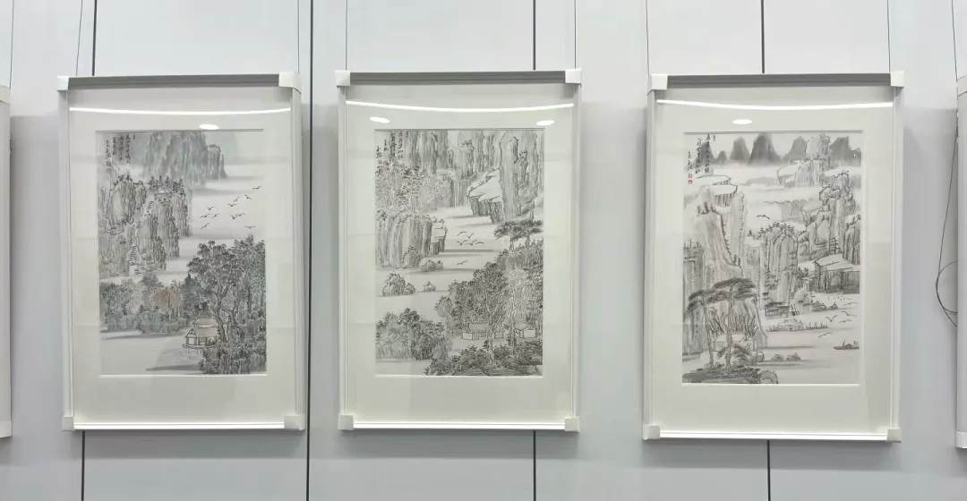 展览现场,四十余幅山水小品错落陈列。这些作品以水墨、青绿、浅绛等传统绘画为主,兼具水墨写意的灵动与浅绛设色的雅致。画作中山川、松云、高士等元素相映成趣,既展现了传统文人画的意趣,又融入了当代审美视角,传递出新春的祥和与生机。