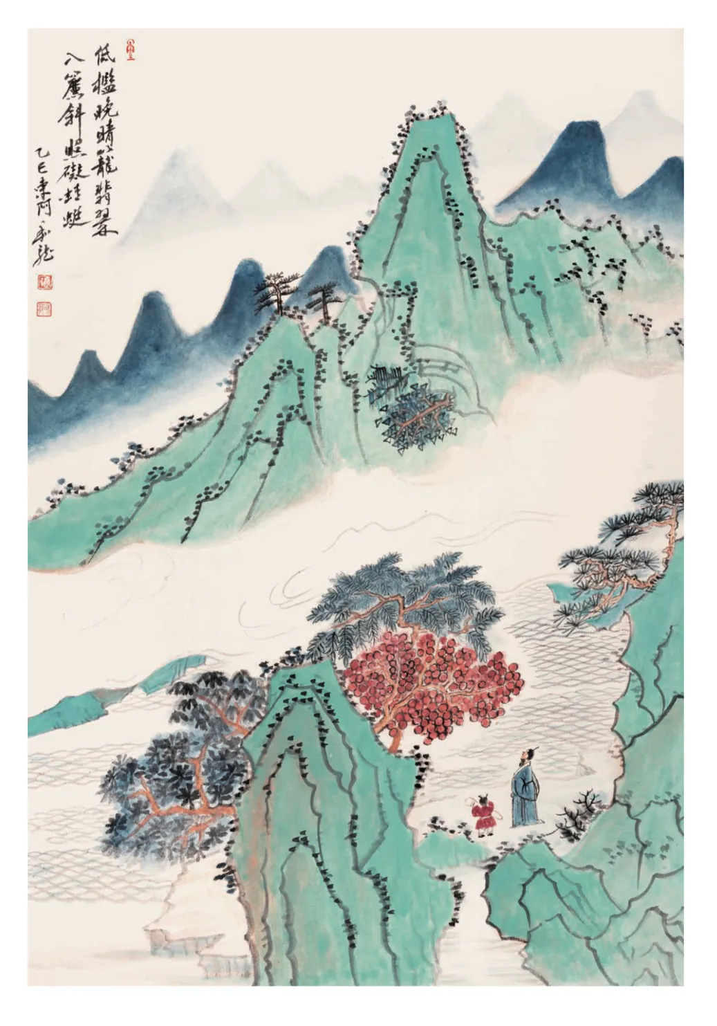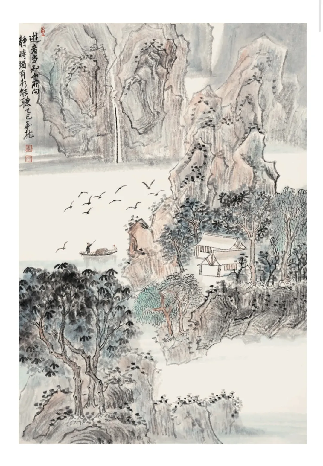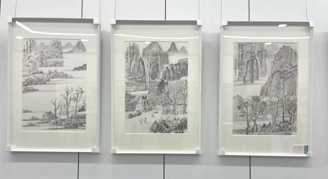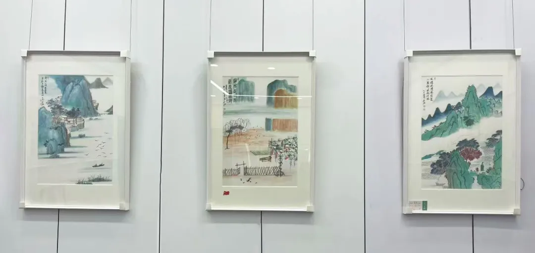 展览现场,四十余幅山水小品错落陈列。这些作品以水墨、青绿、浅绛等传统绘画为主,兼具水墨写意的灵动与浅绛设色的雅致。画作中山川、松云、高士等元素相映成趣,既展现了传统文人画的意趣,又融入了当代审美视角,传递出新春的祥和与生机。