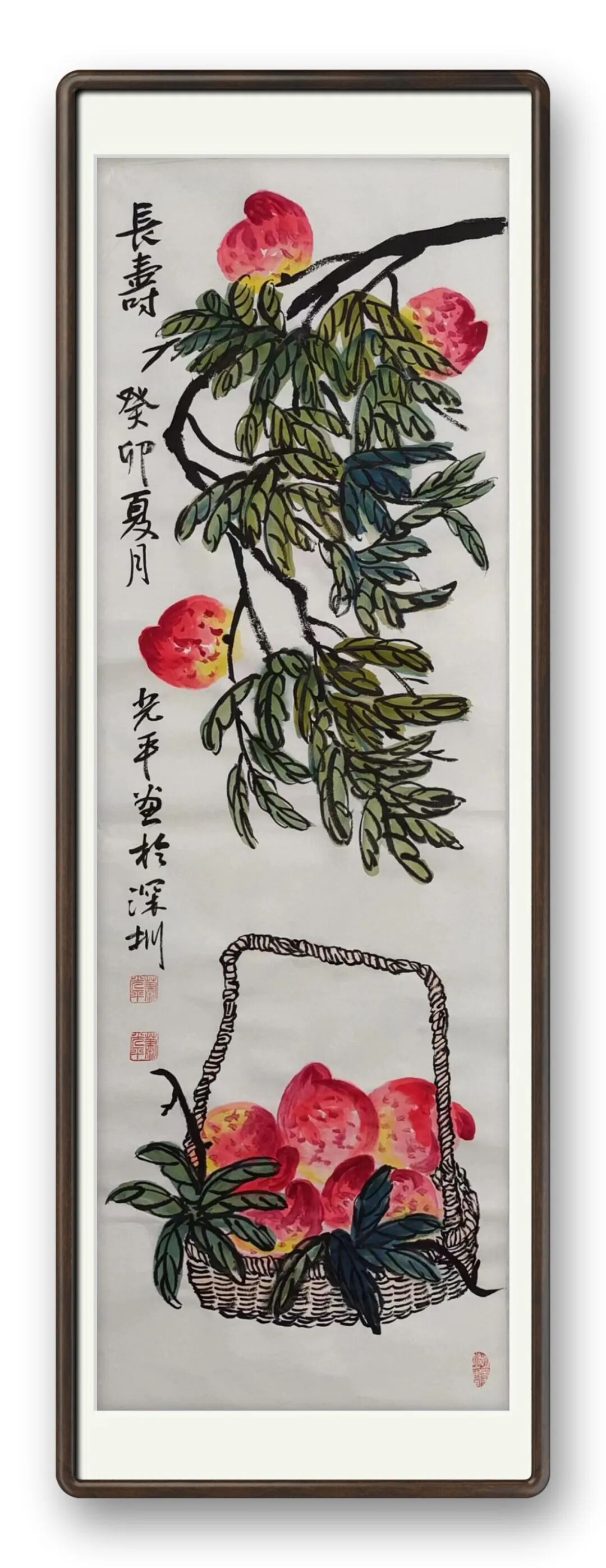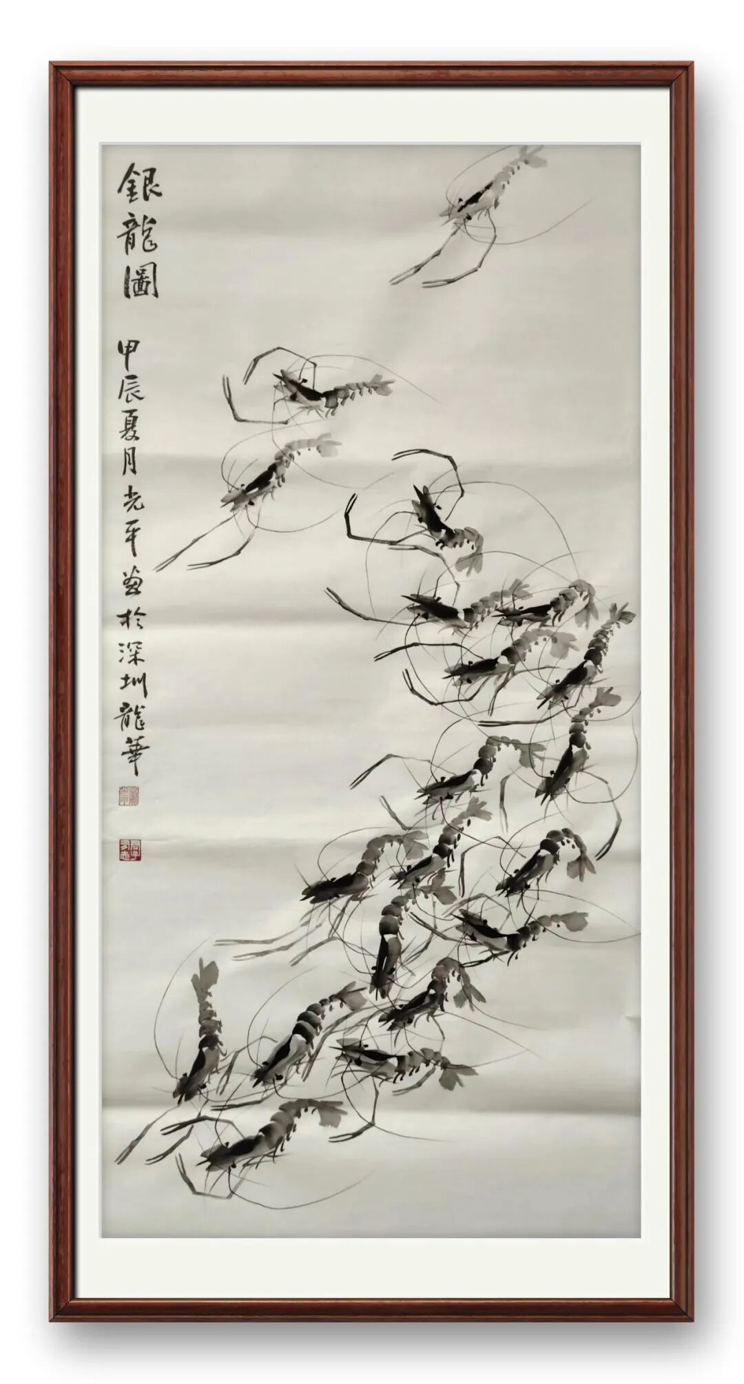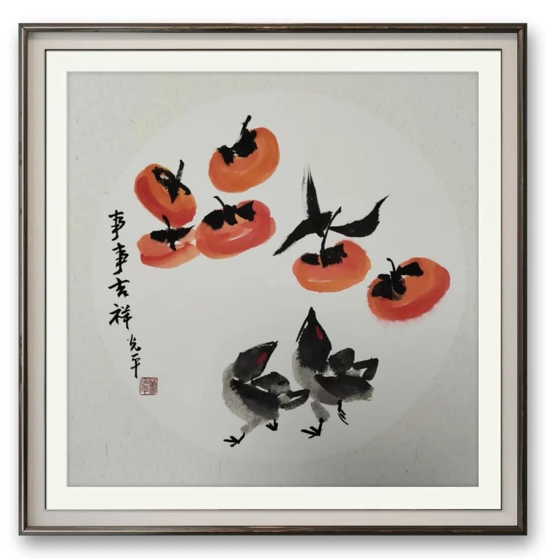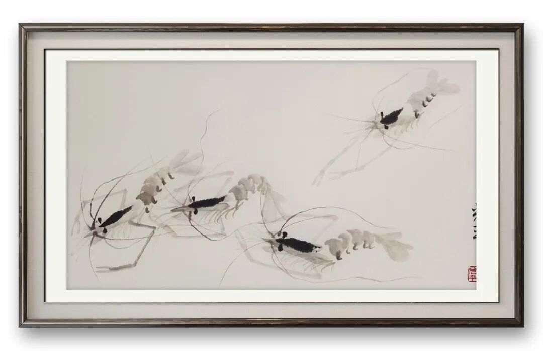 其画虾之作堪称一绝,兼齐白石意趣与自我体悟,自成一格。淡墨写虾身,笔锋连贯、墨色通透,尽现虾壳薄润质感;浓墨点眼如神来之笔,瞬间激活生灵气韵;虾须虾螯以中锋细笔勾勒,线条挺拔富弹性,姿态各异、灵动飘逸。他既精准把握虾的形态,更捕捉其游水韵律,寥寥数笔便将虾群嬉戏情态栩栩如生呈现。画面无一字写水,却借虾姿与留白暗喻水波荡漾,重意趣而轻堆砌,尽显东方美学“得意忘形”之境。