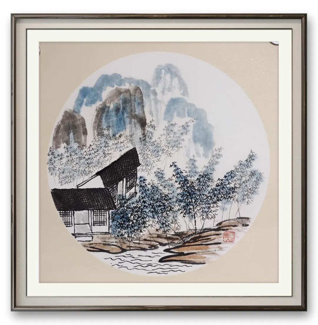 其山水画深谙“外师造化,中得心源”,非自然景致的简单摹写。中锋行笔沉稳如铁画银钩,皴擦点染间墨色浓淡干湿相生,远山含黛、近石嶙峋,溪泉婉转、林木葱茏,铺展出水墨山水的深远意境。他不重繁复构图,于简约中藏丘壑、留白处留余韵,画面兼含北方山水雄浑与南方山水清润,观之如入幽境,心随笔墨游走烟岚云岫,体悟天人合一之思。笔墨之外,更将沉静心境融入山川,使画作脱离纯粹技法,多了几分温润人文气。