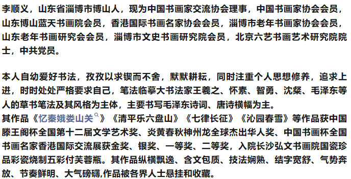 李顺义先生的草书作品,多次在全国性书画大赛中斩获殊荣,如中国滕王阁杯全国第十二届文学艺术奖、炎黄春秋神州龙全球杰出华人奖等,其作品还被纳入长沙弘文书画院国瓷珍品彩瓷烧制,被各界人士收藏悬挂,成为文化传播的重要载体。这些荣誉与认可,既是对其技法水平的肯定,更是对其作品人文价值的认同。他以笔墨为桥,将传统书法艺术与时代精神相结合,让更多人感受到中国书法的博大精深,为传统文化的传承与创新注入了鲜活力量。